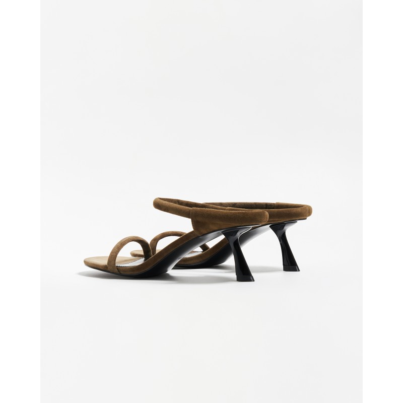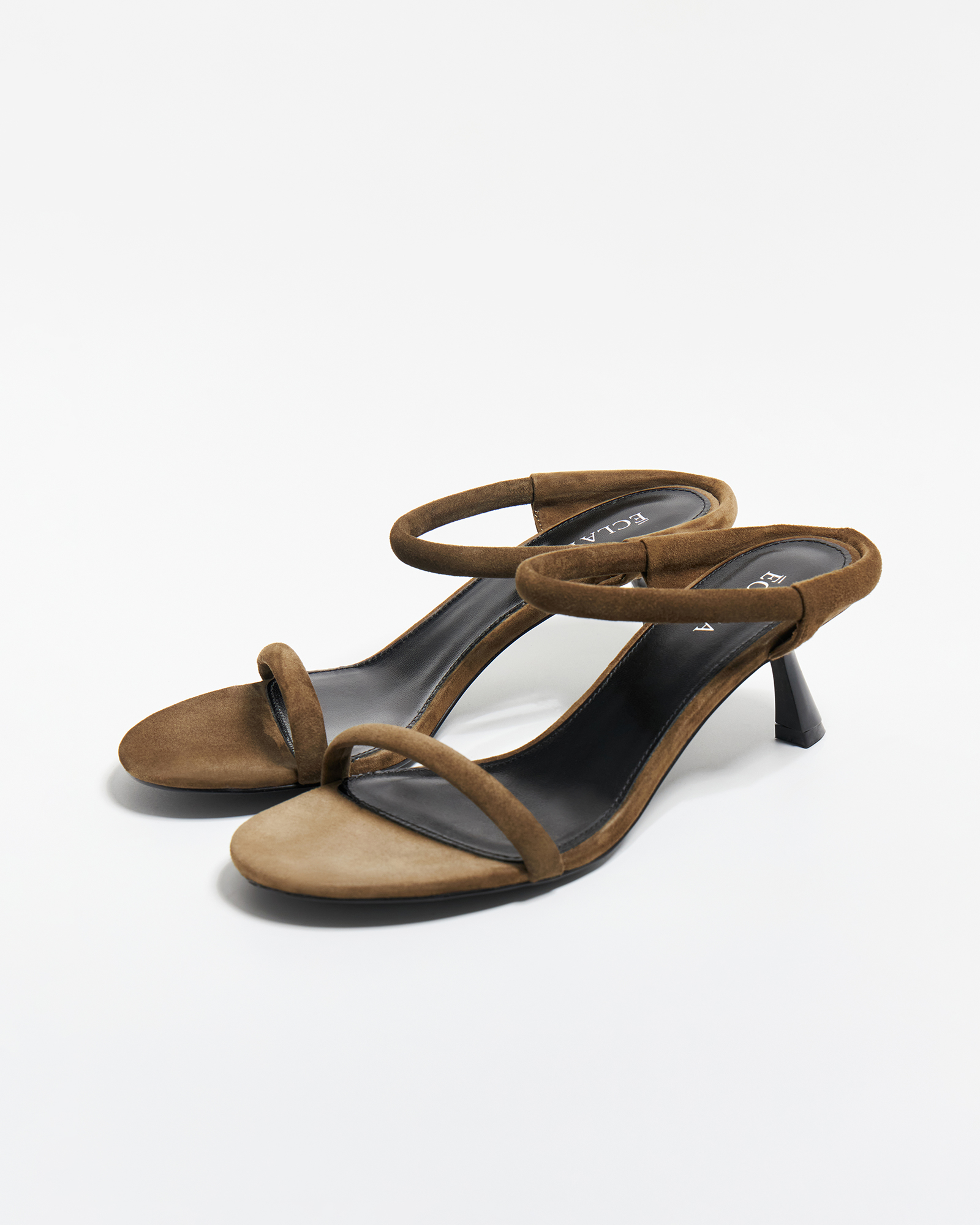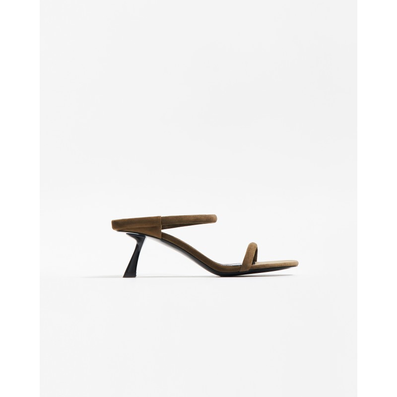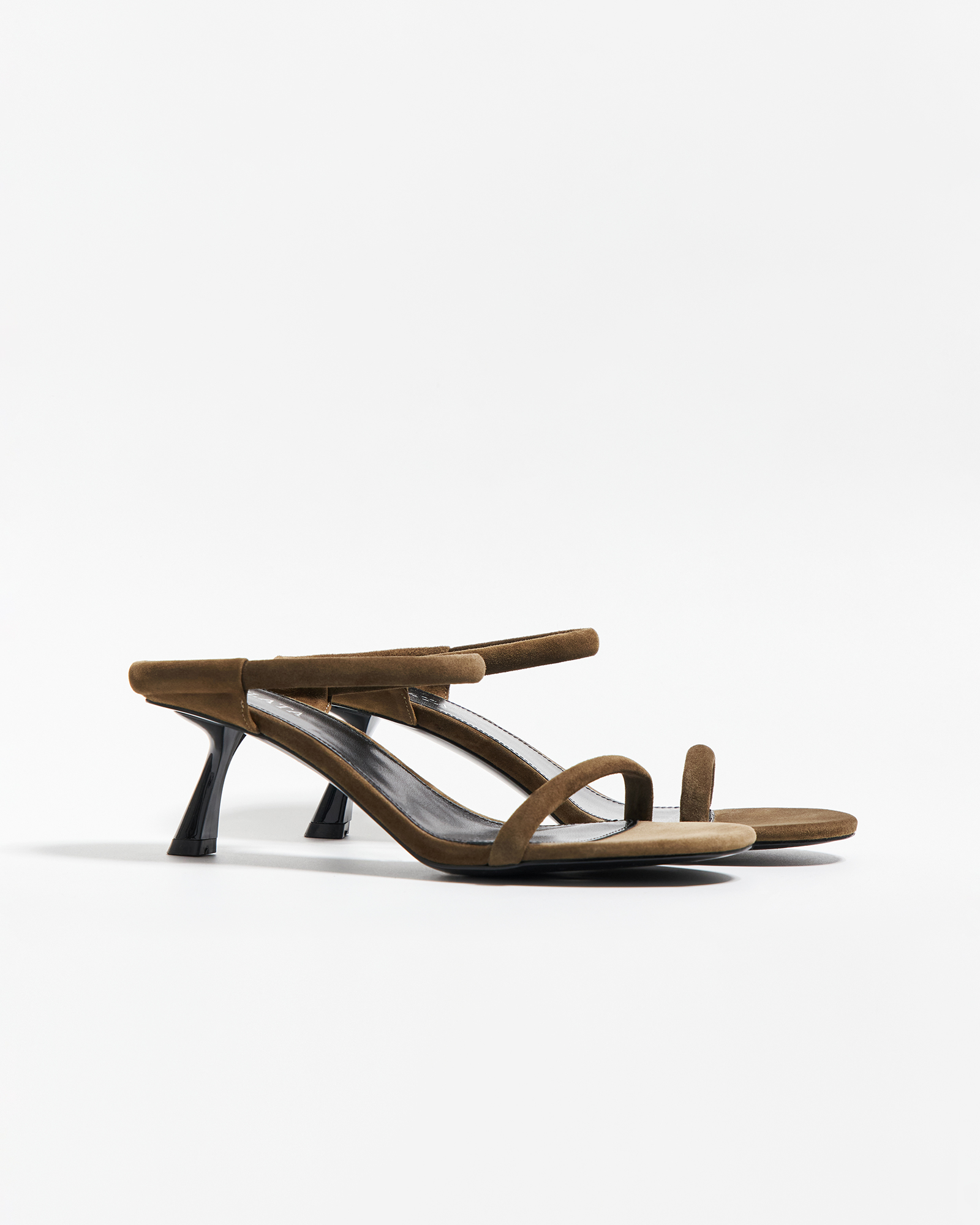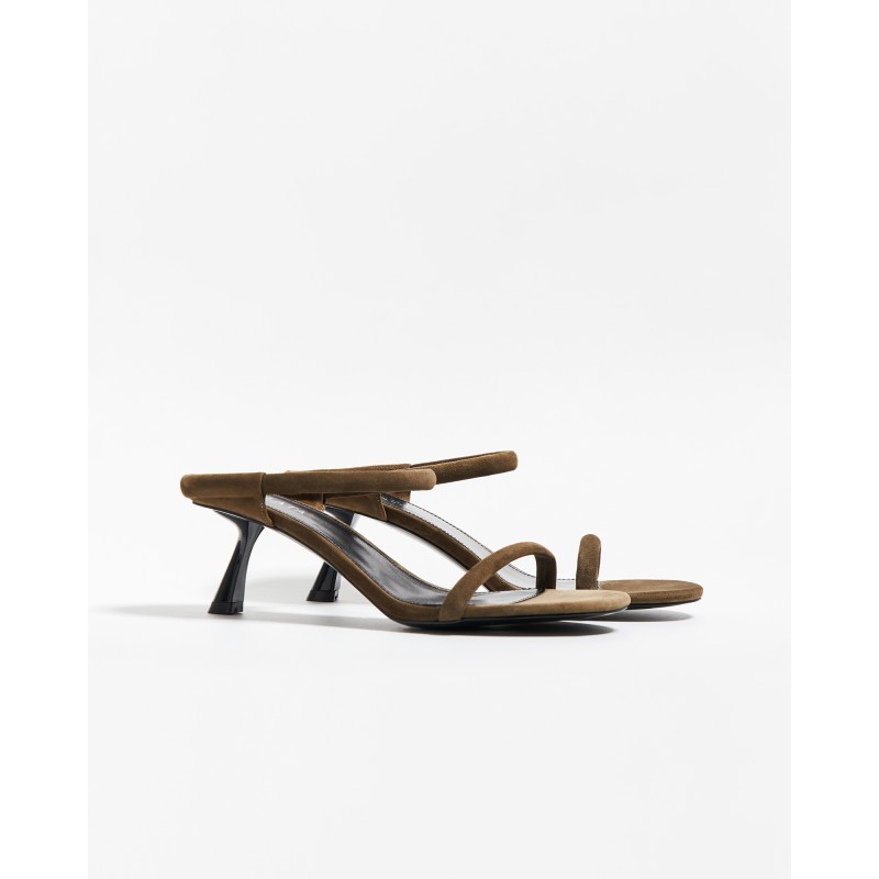 Лёгкие босоножки с тонкими округлыми перемычками выполнены из натуральной замши цвета хаки. Модель дополнена фигурным каблуком. Не имеет дополнительных застёжек.