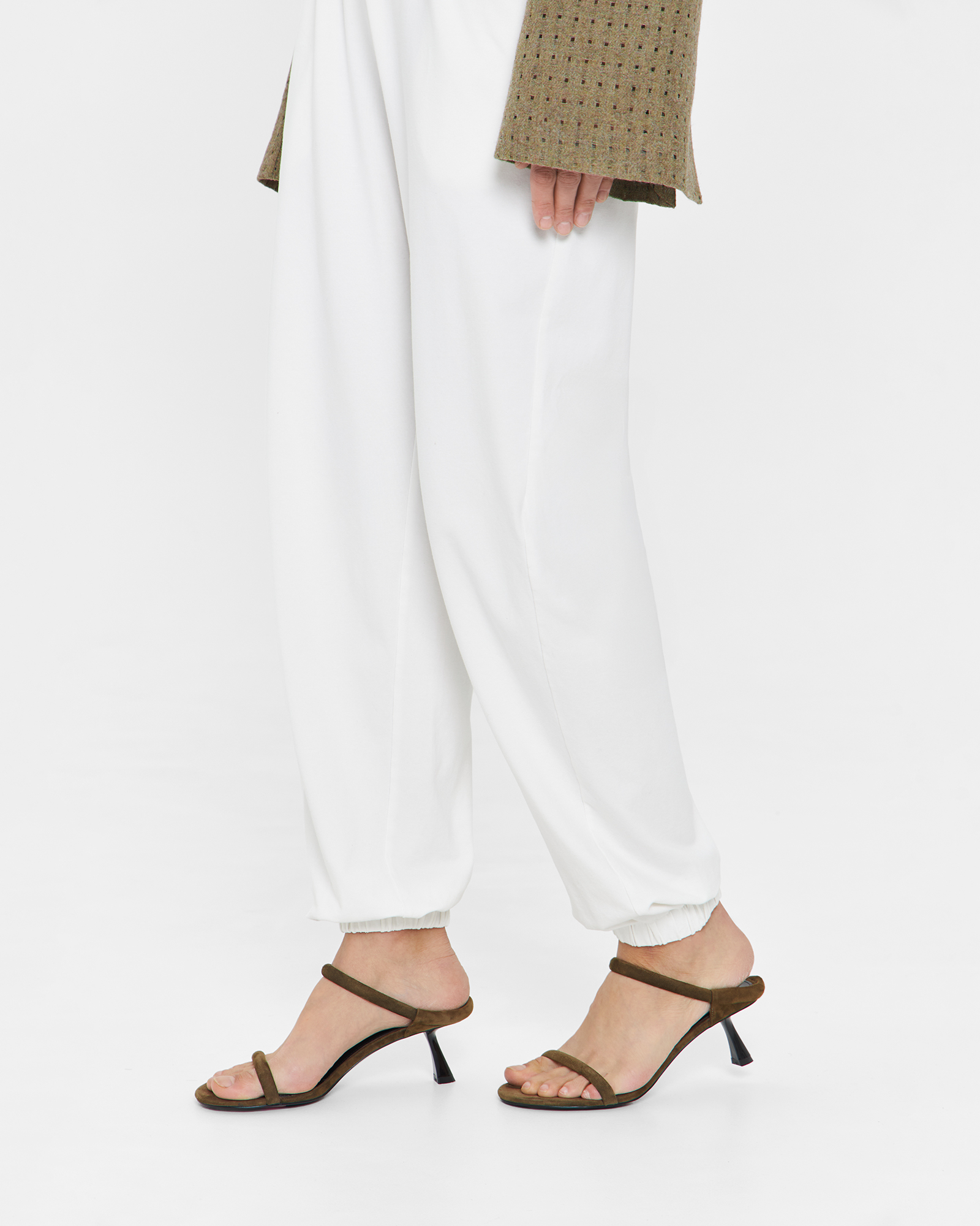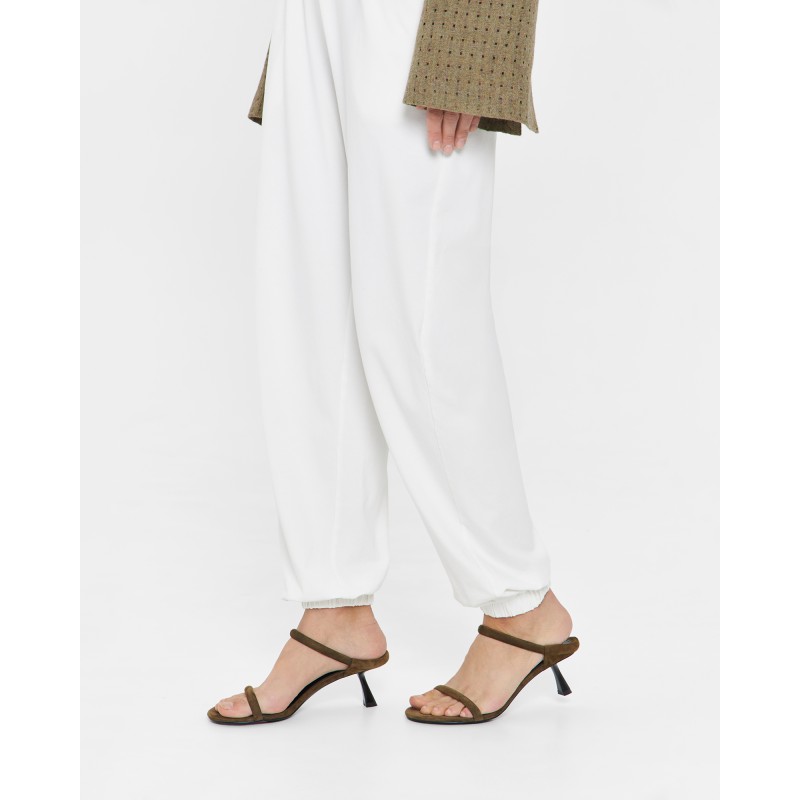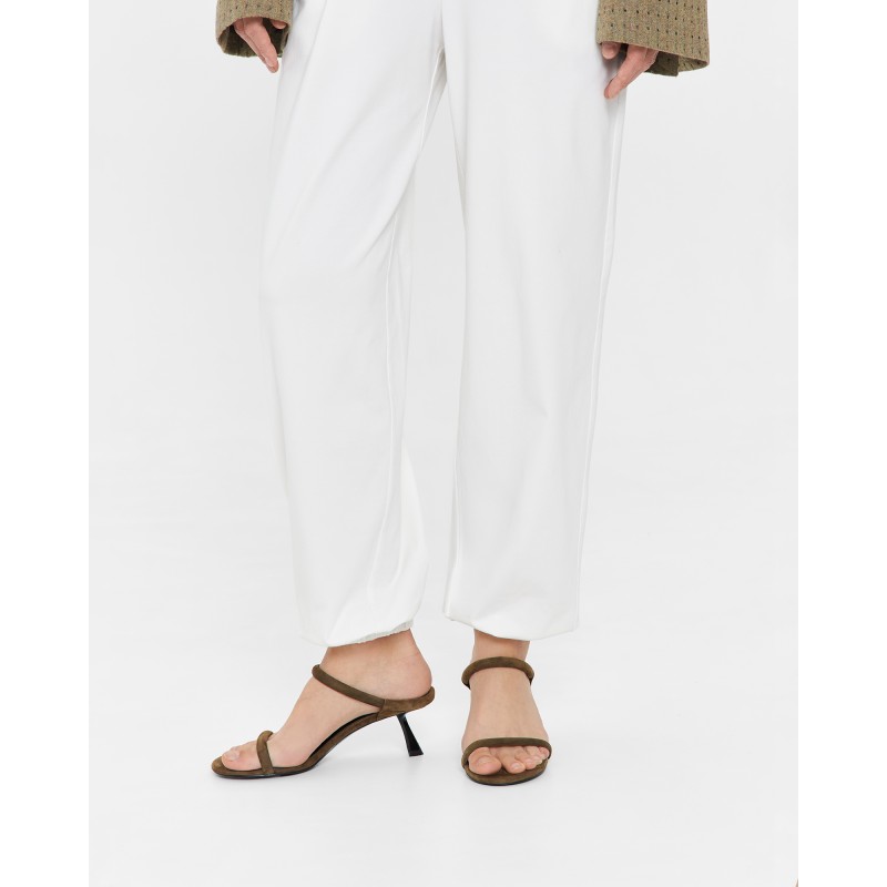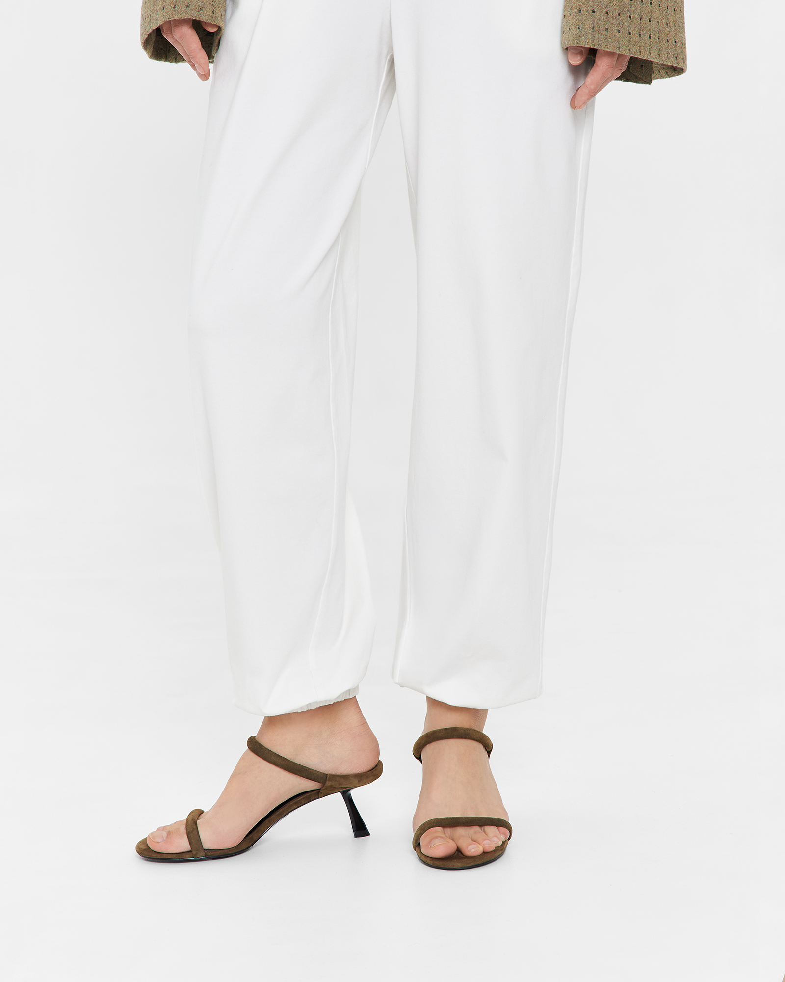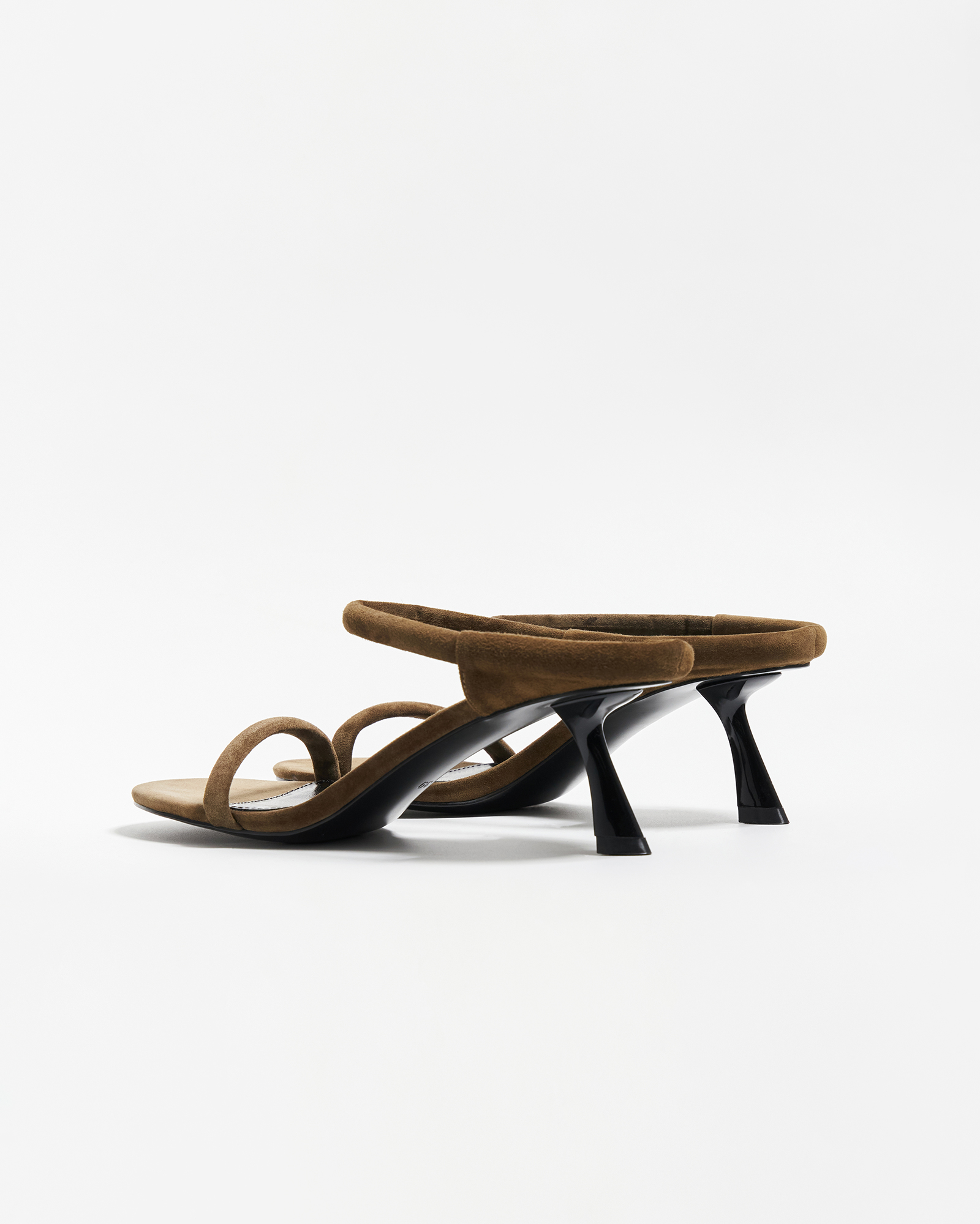 Лёгкие босоножки с тонкими округлыми перемычками выполнены из натуральной замши цвета хаки. Модель дополнена фигурным каблуком. Не имеет дополнительных застёжек.