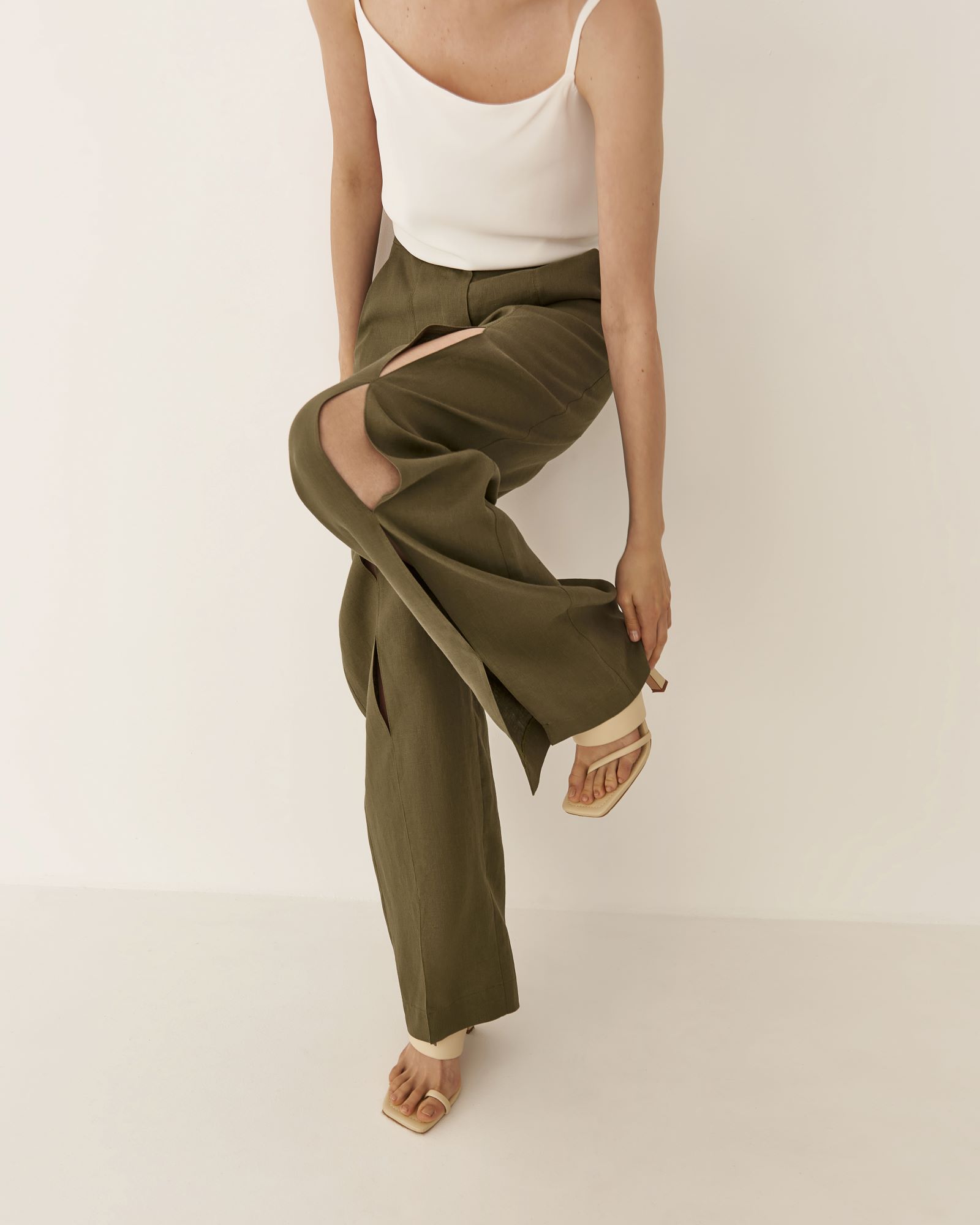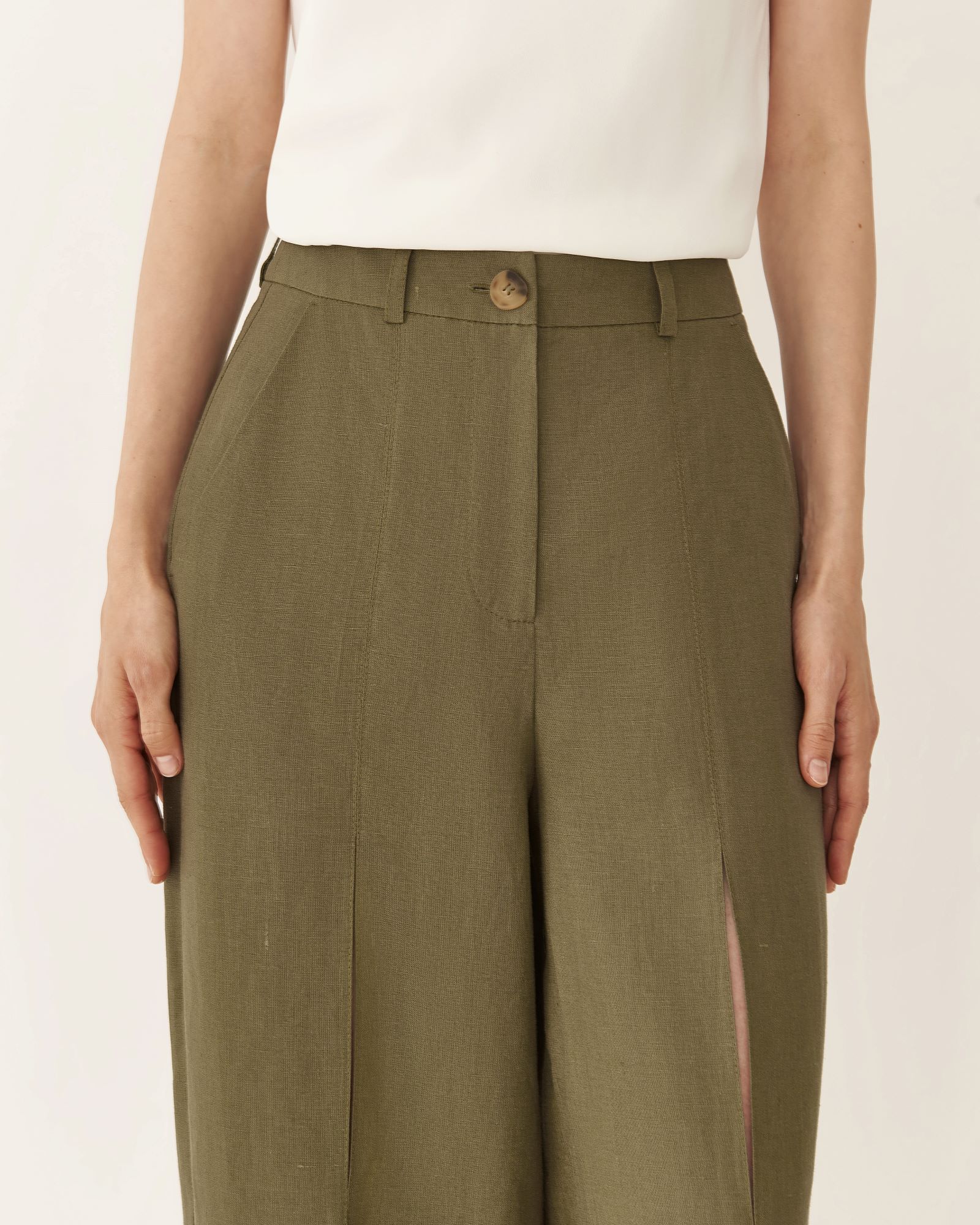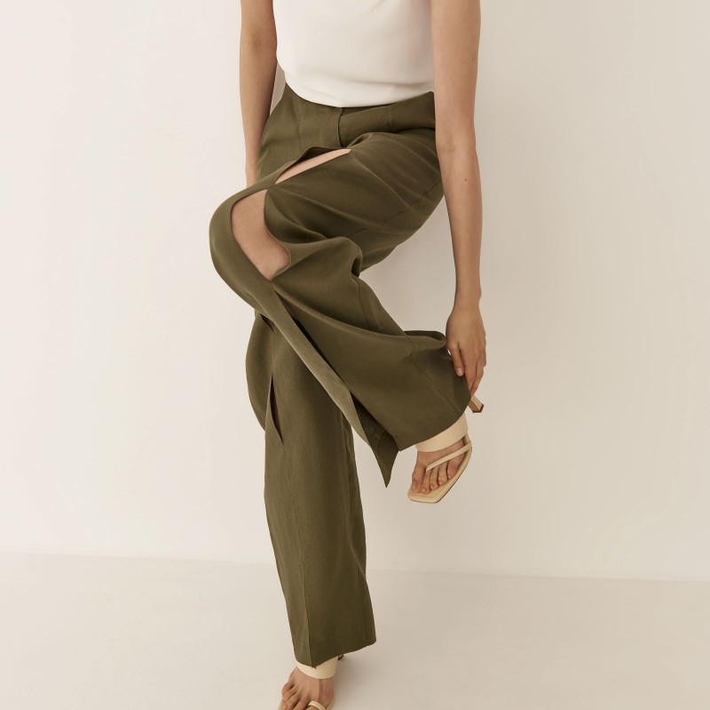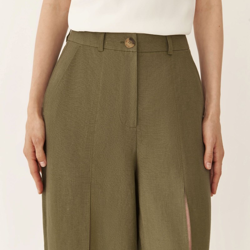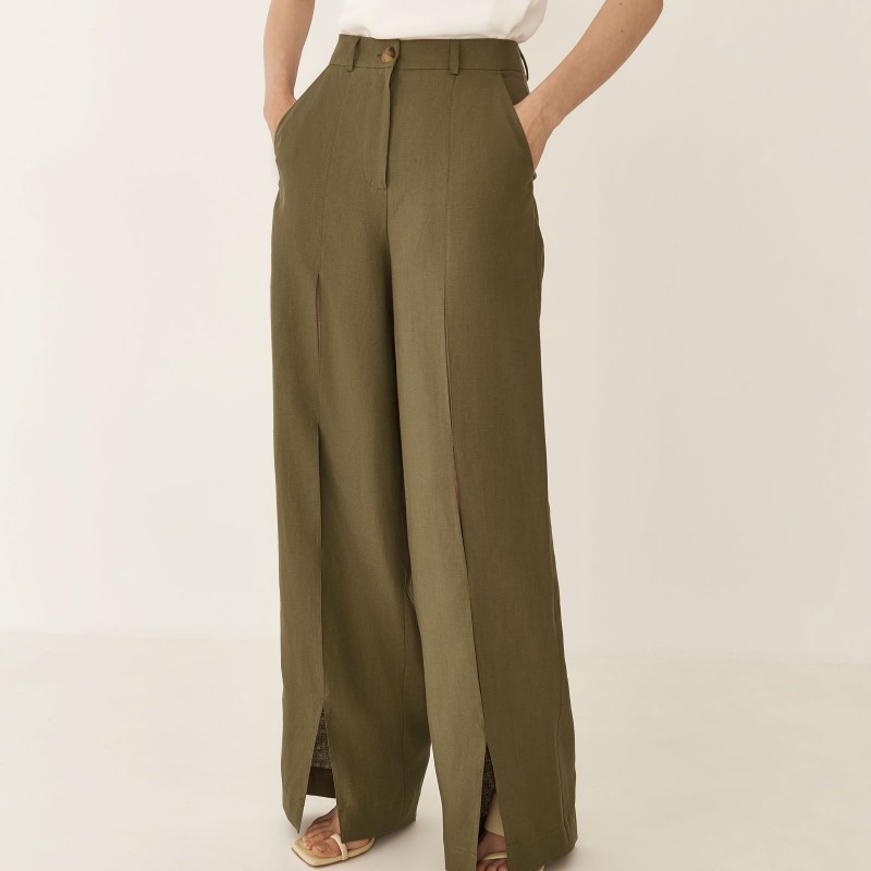 Брюки изо льна с разрезами в цвете хаки