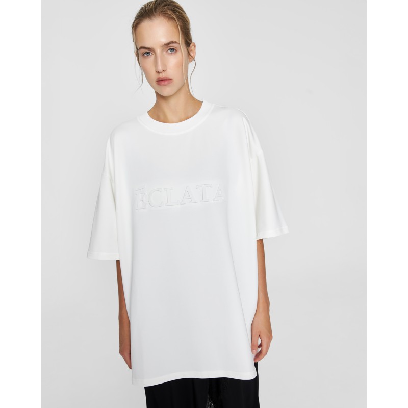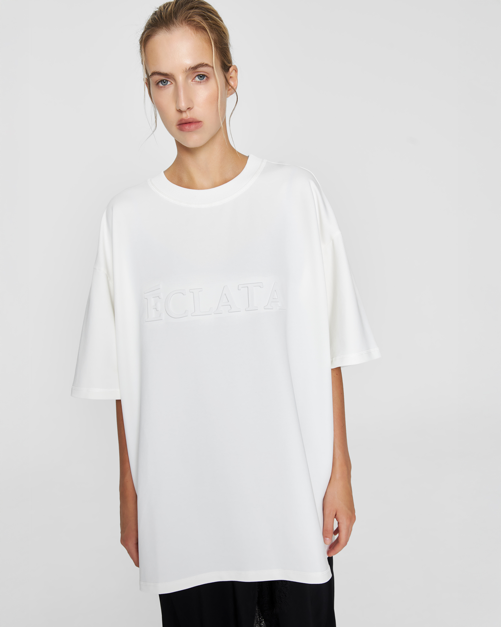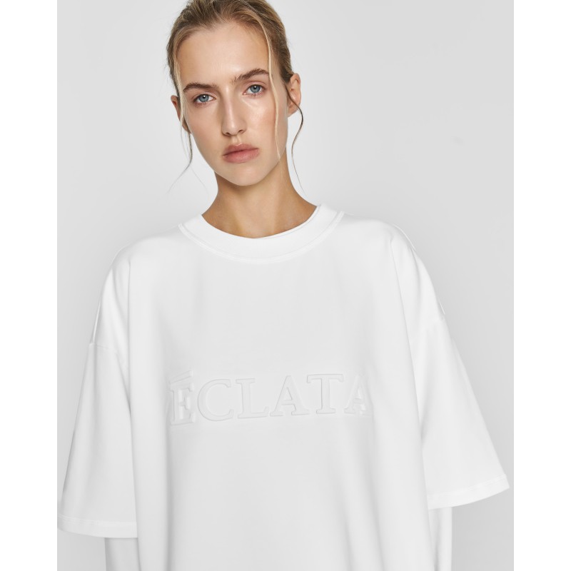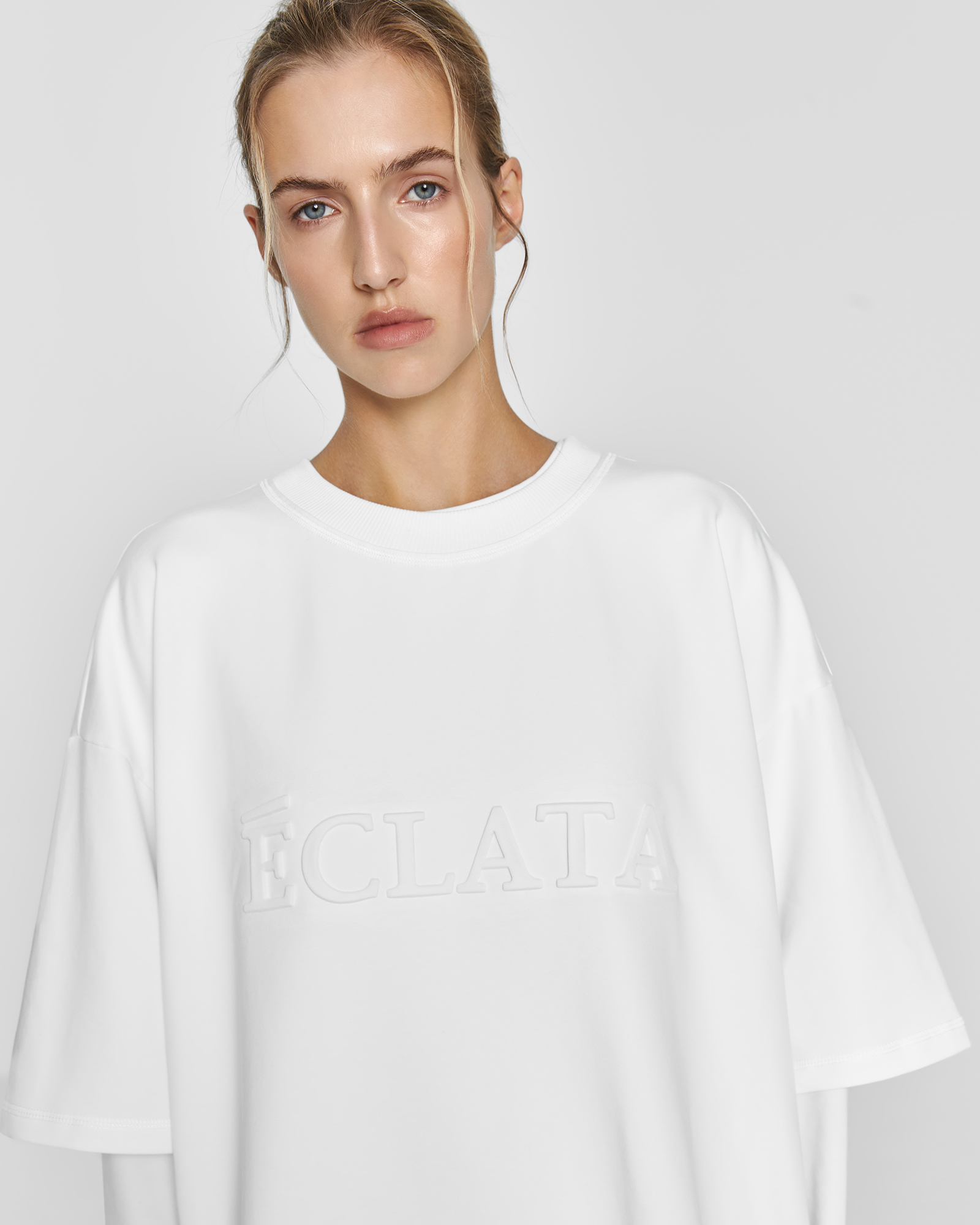Белая футболка с логотипом ECLATA имеет прямой крой со