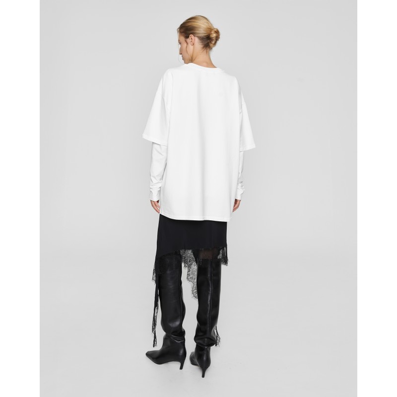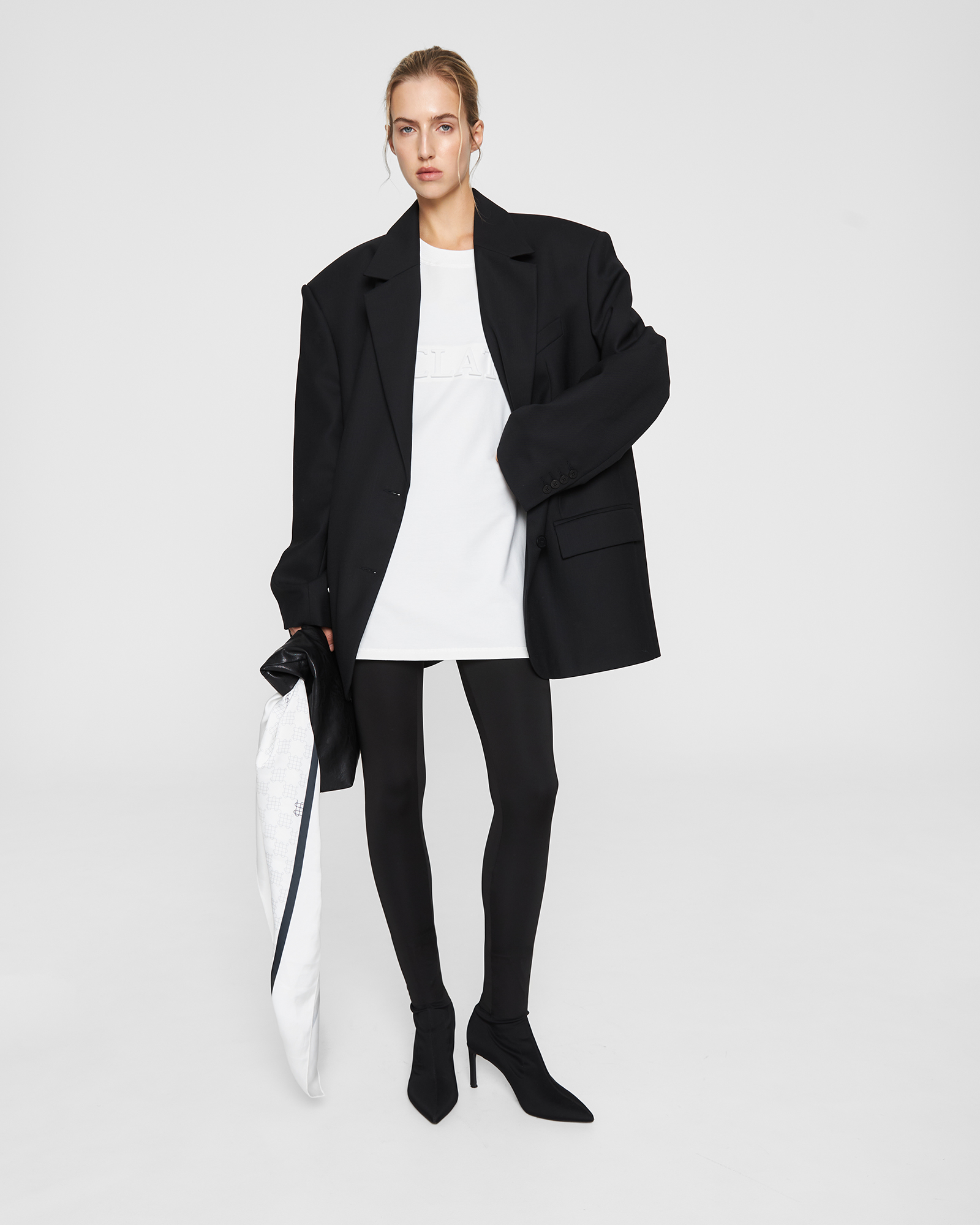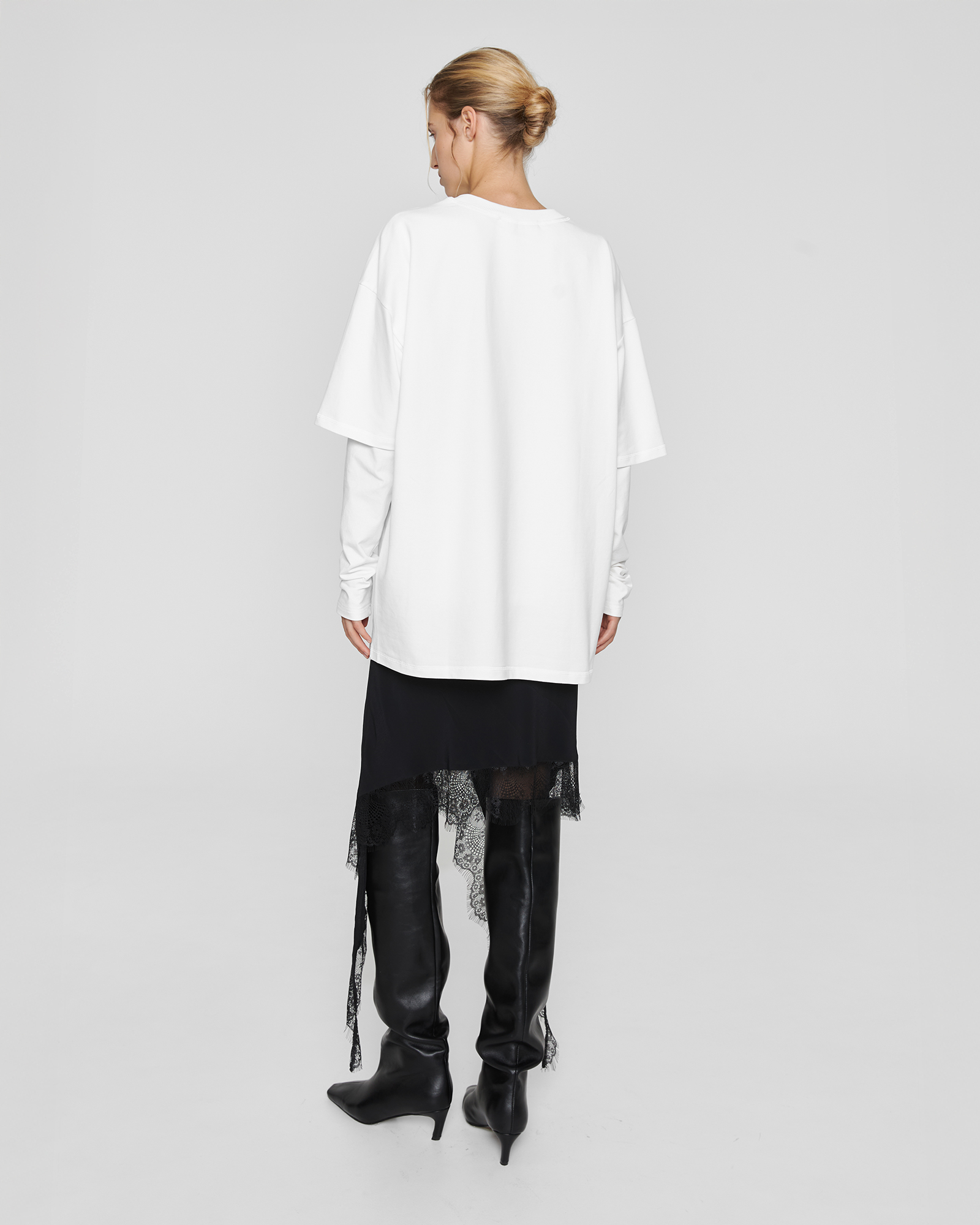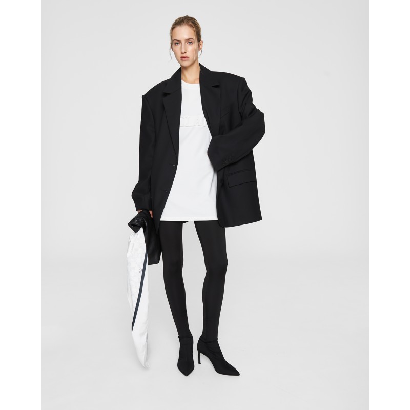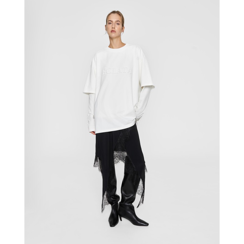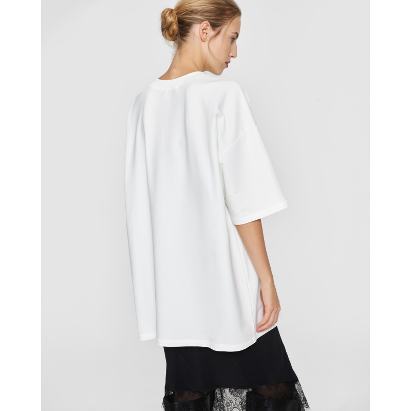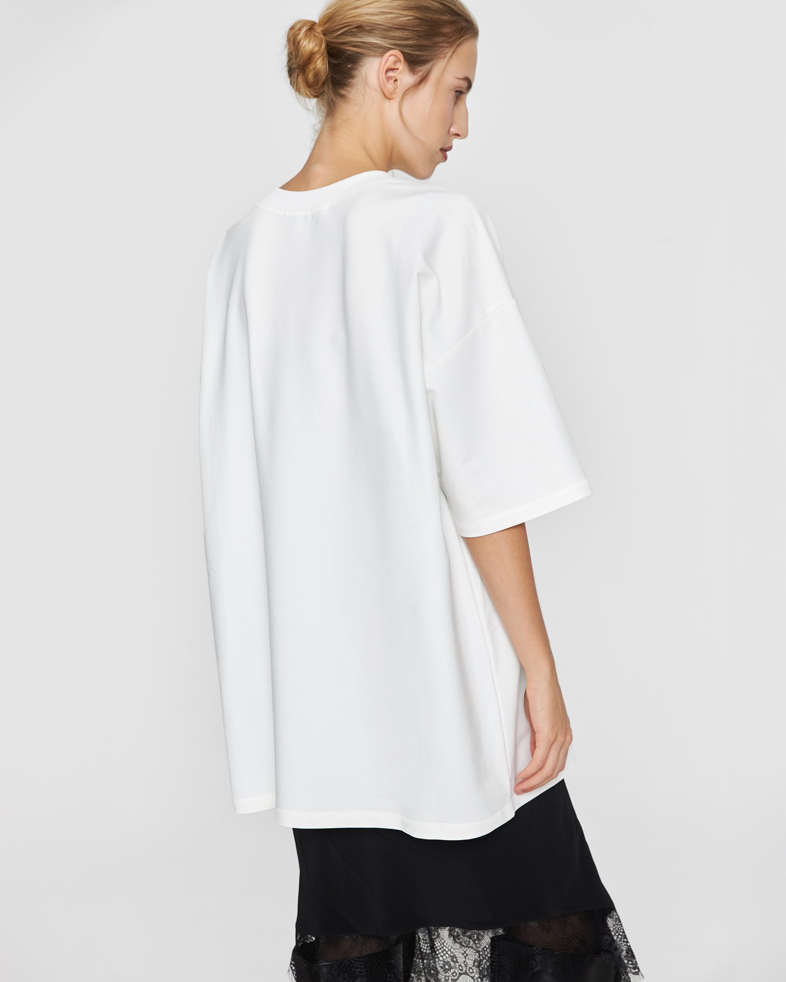 спущенным плечом длиной до середины бедра и рукавом ниже локтя. Акцентной деталью является объемный рельефный логотип бренда в тон цвета