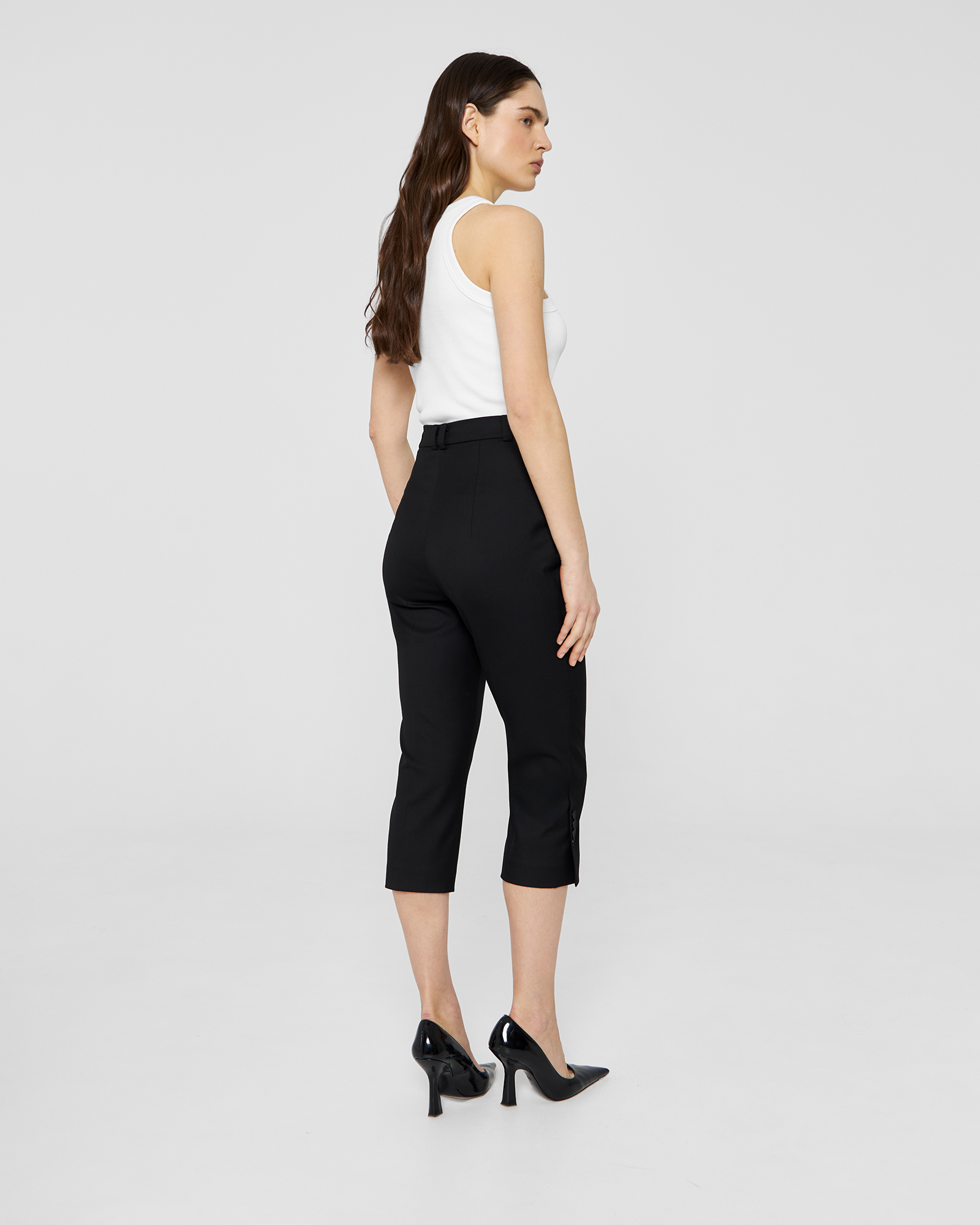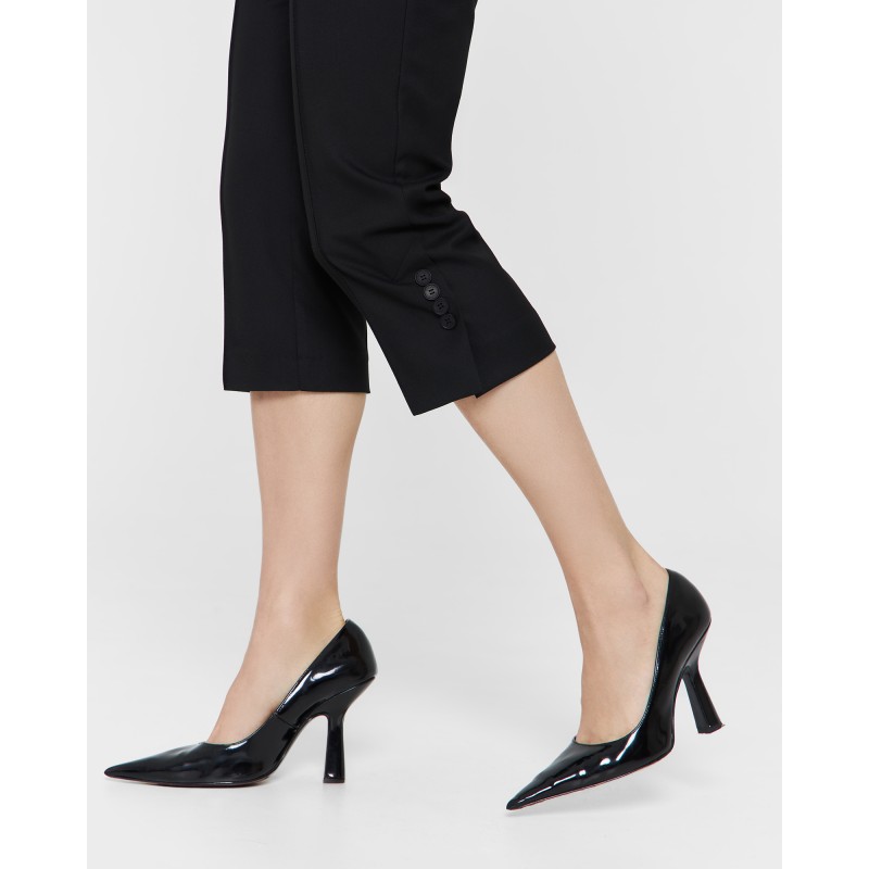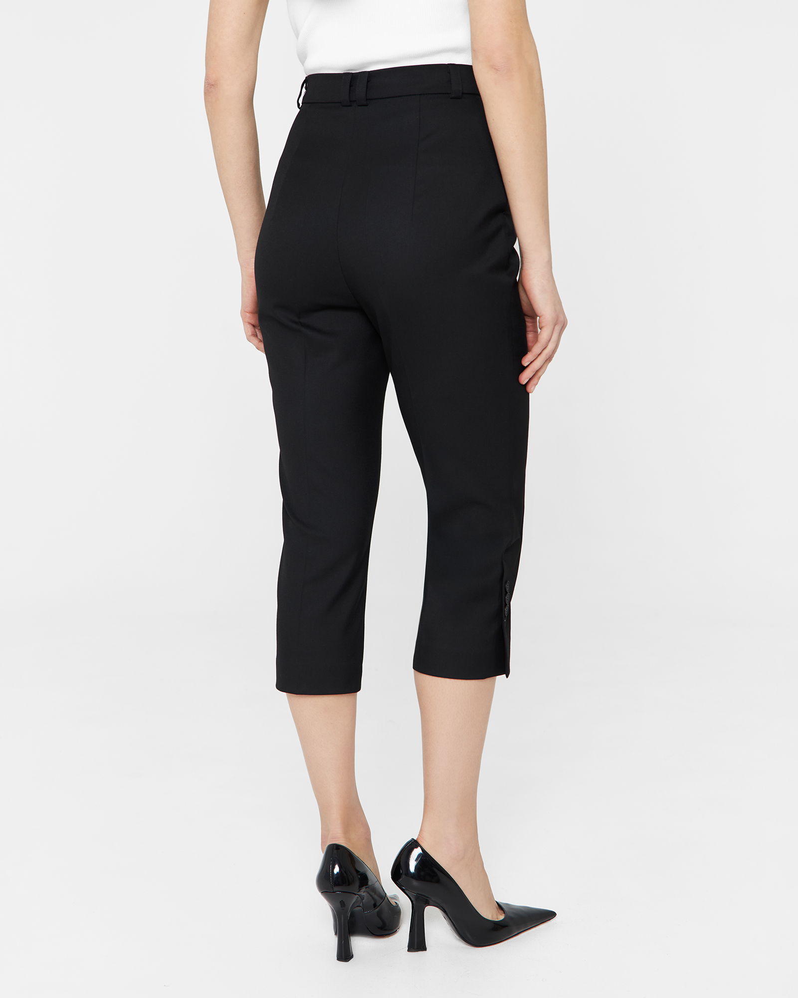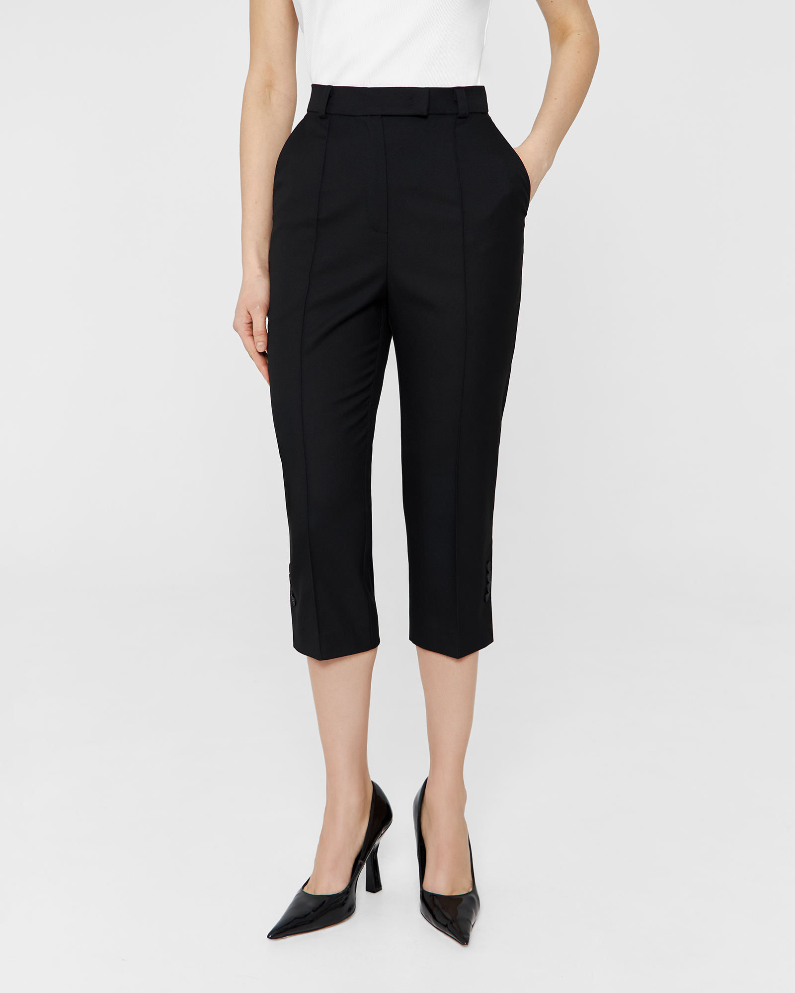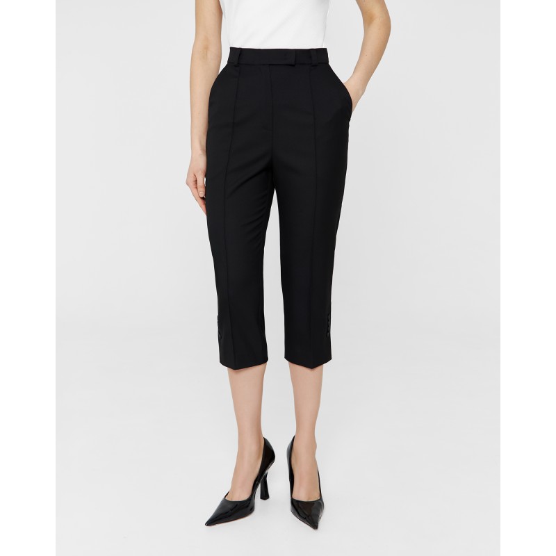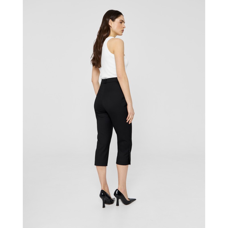 Зауженные брюки - капри выполнены из костюмной ткани чёрного цвета и имеют длину чуть ниже колена. Шлицы в боковых швах декорированы четырьмя брендированными пуговицами. Изделие может стилизоваться в качестве самодостаточного, так и быть частью комплекта с кроп-пиджаком из той же костюмной ткани.