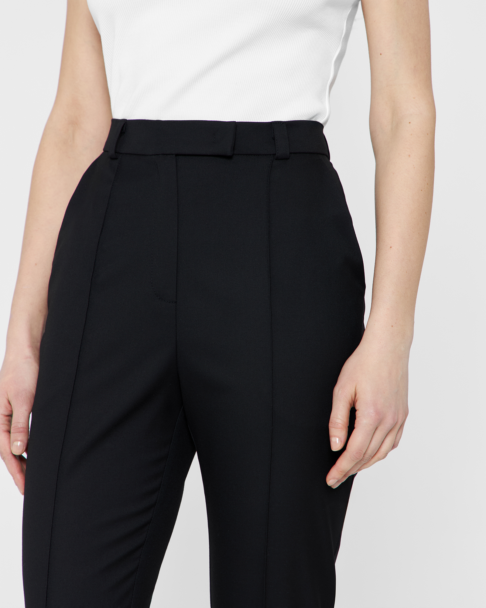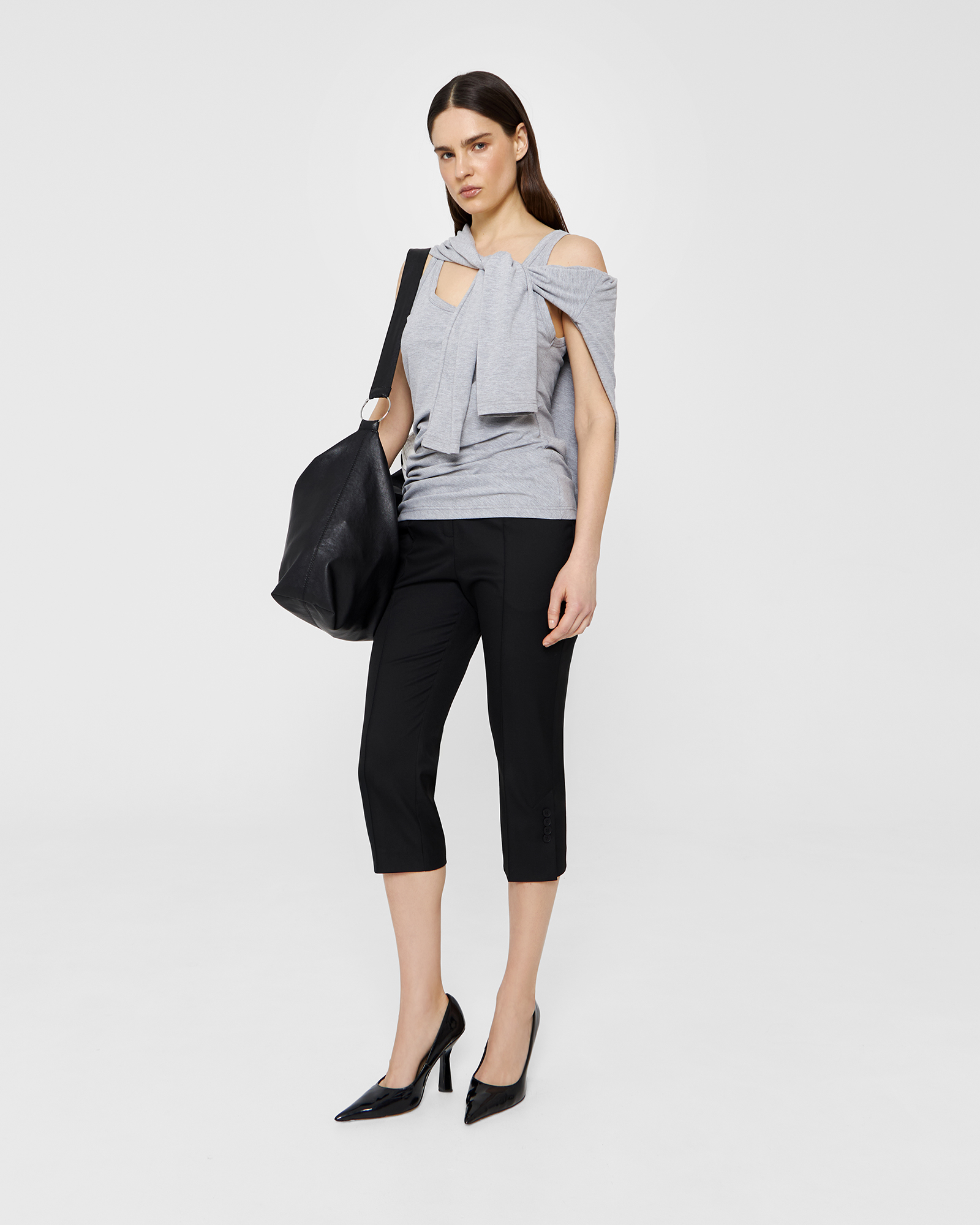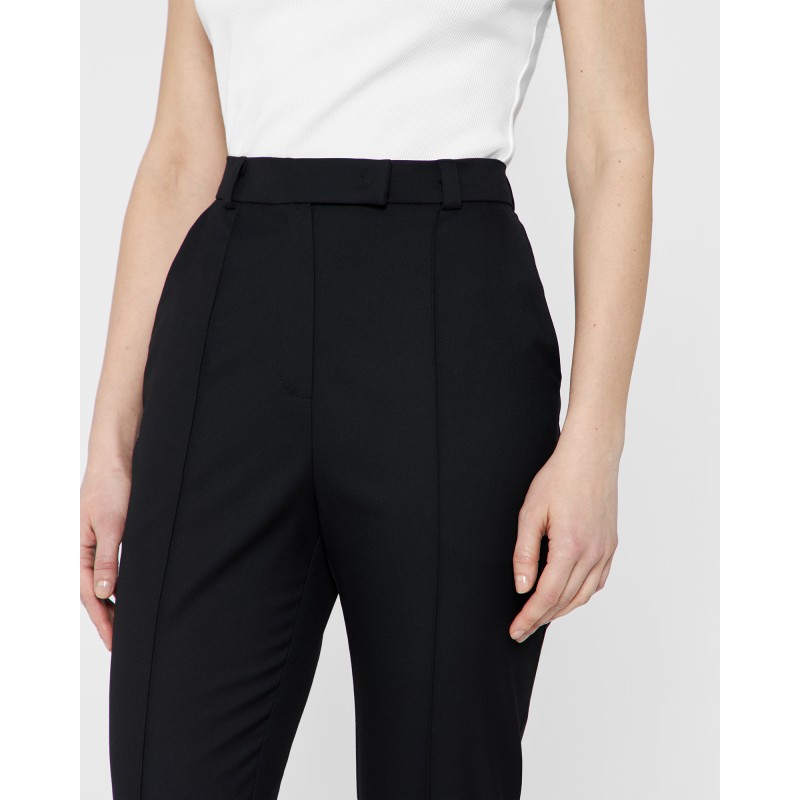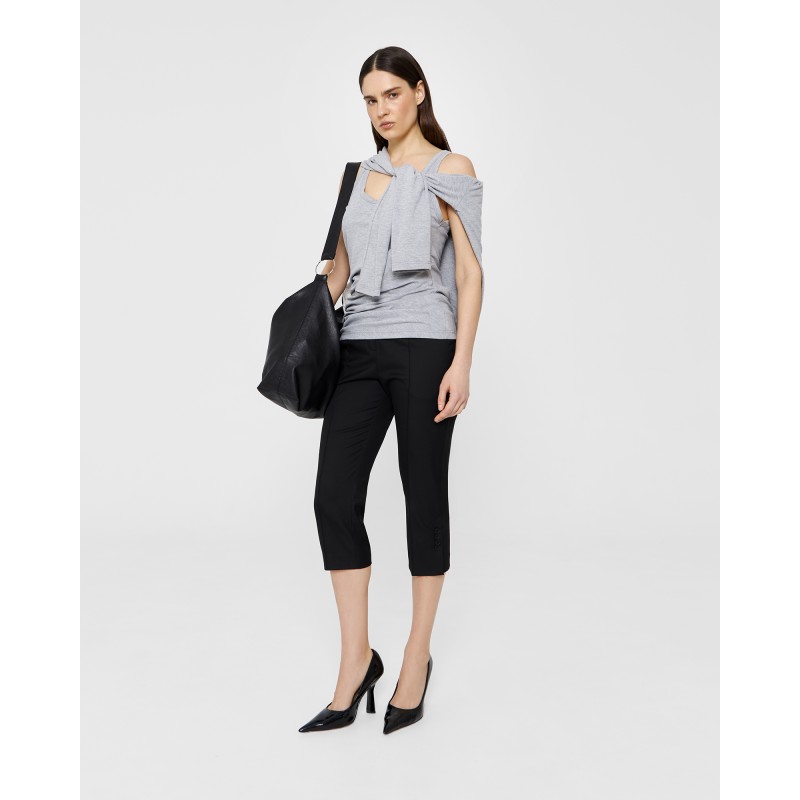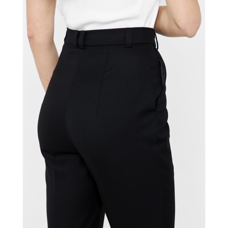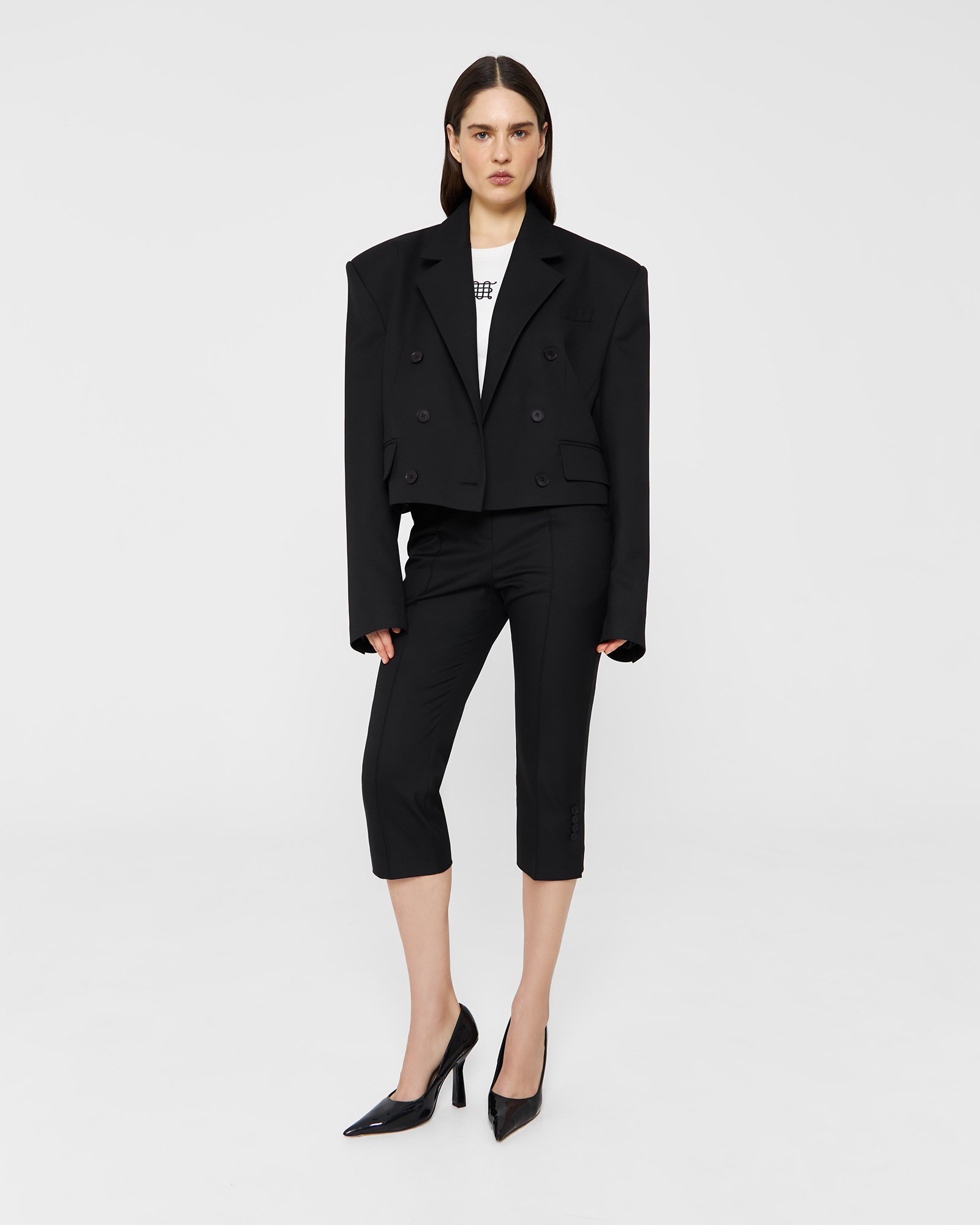 Зауженные брюки - капри выполнены из костюмной ткани чёрного цвета и имеют длину чуть ниже колена. Шлицы в боковых швах декорированы четырьмя брендированными пуговицами. Изделие может стилизоваться в качестве самодостаточного, так и быть частью комплекта с кроп-пиджаком из той же костюмной ткани.