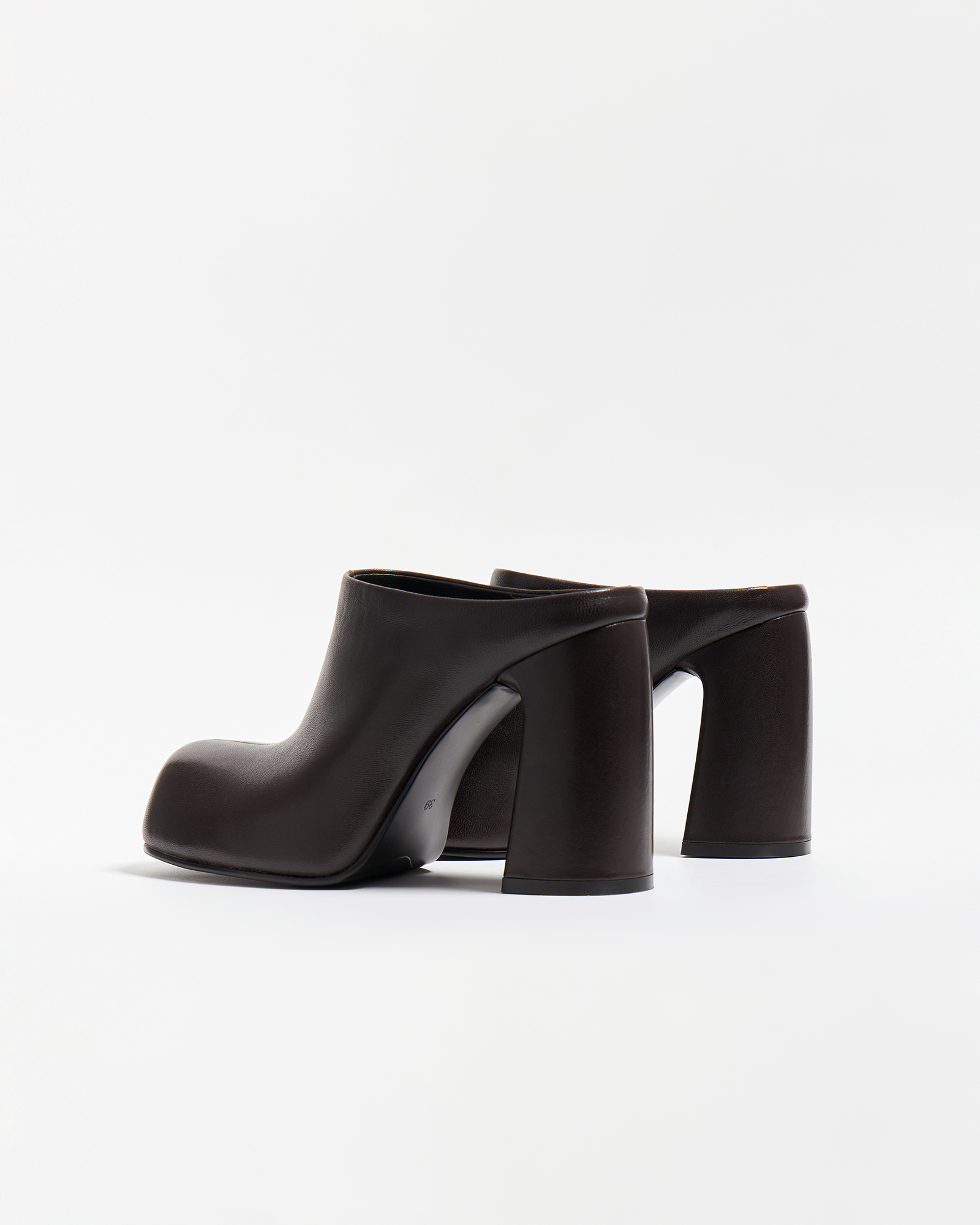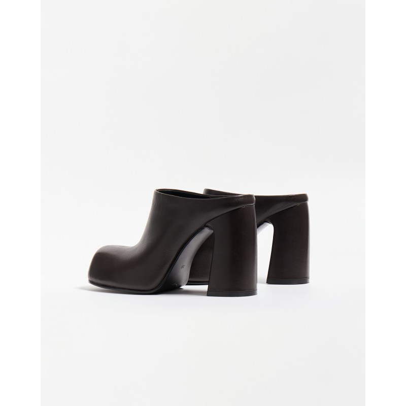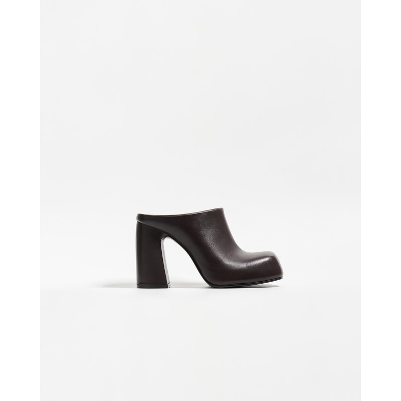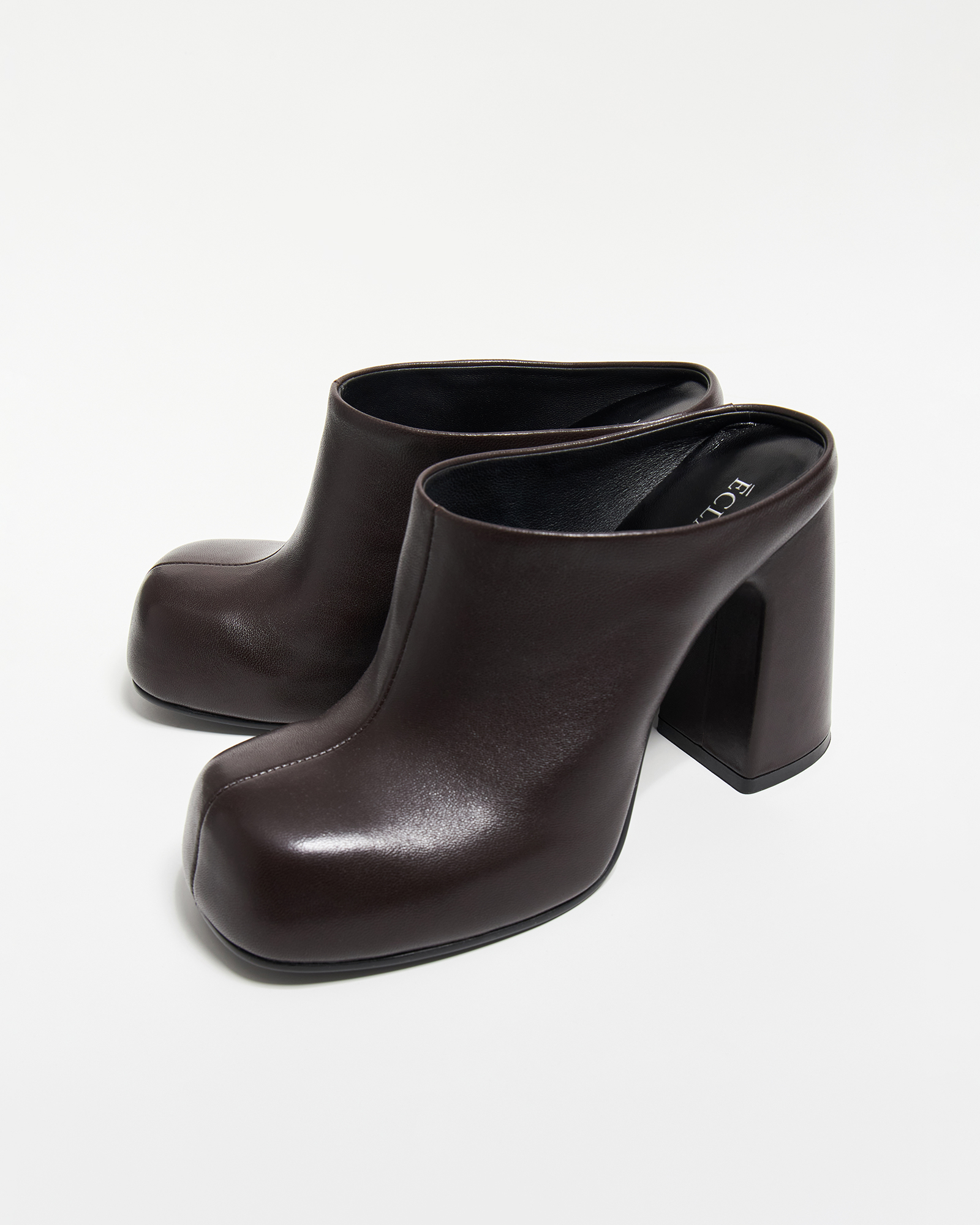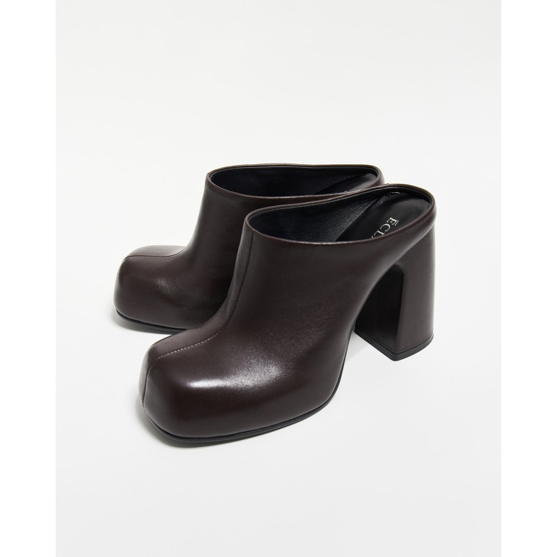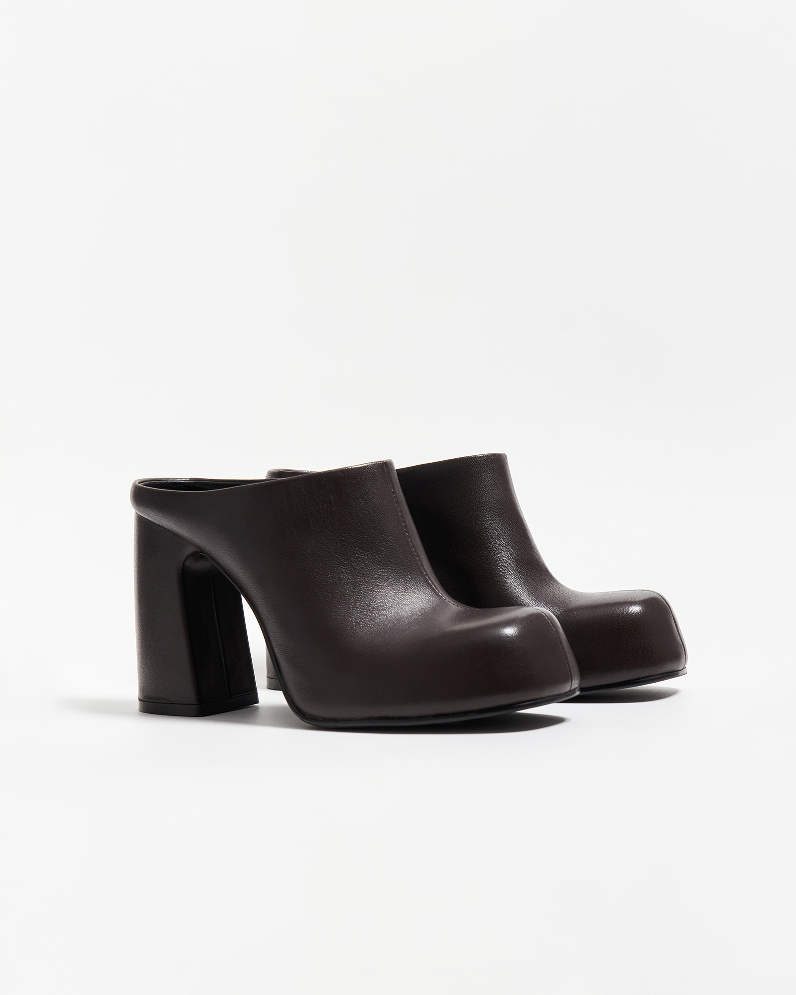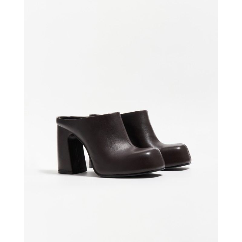 Клоги с квадратным мысом выполнены из натуральной кожи в коричневом цвете. Модель дополнена широким плато и высоким, устойчивым каблуком.