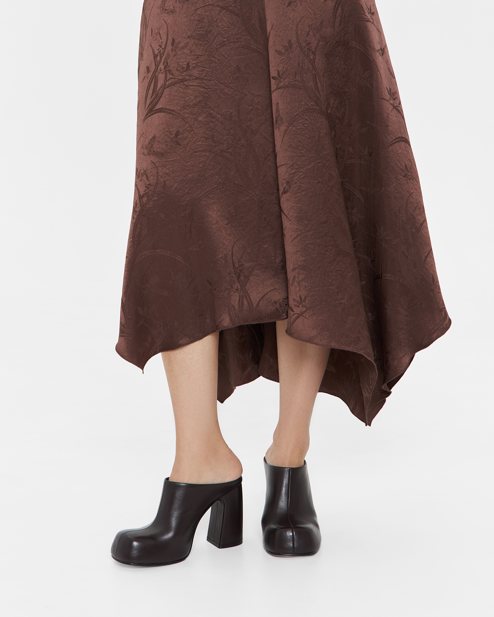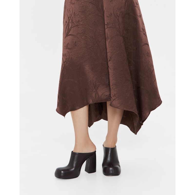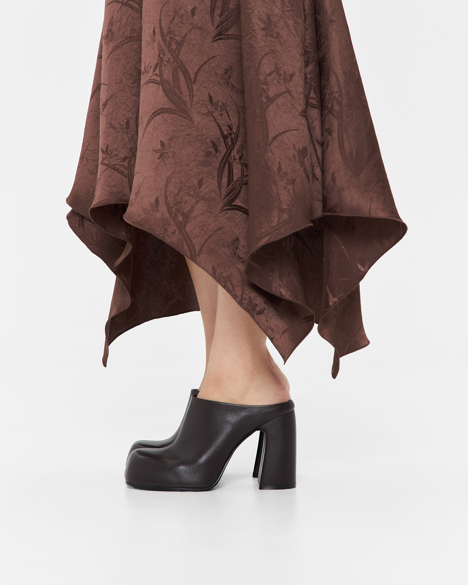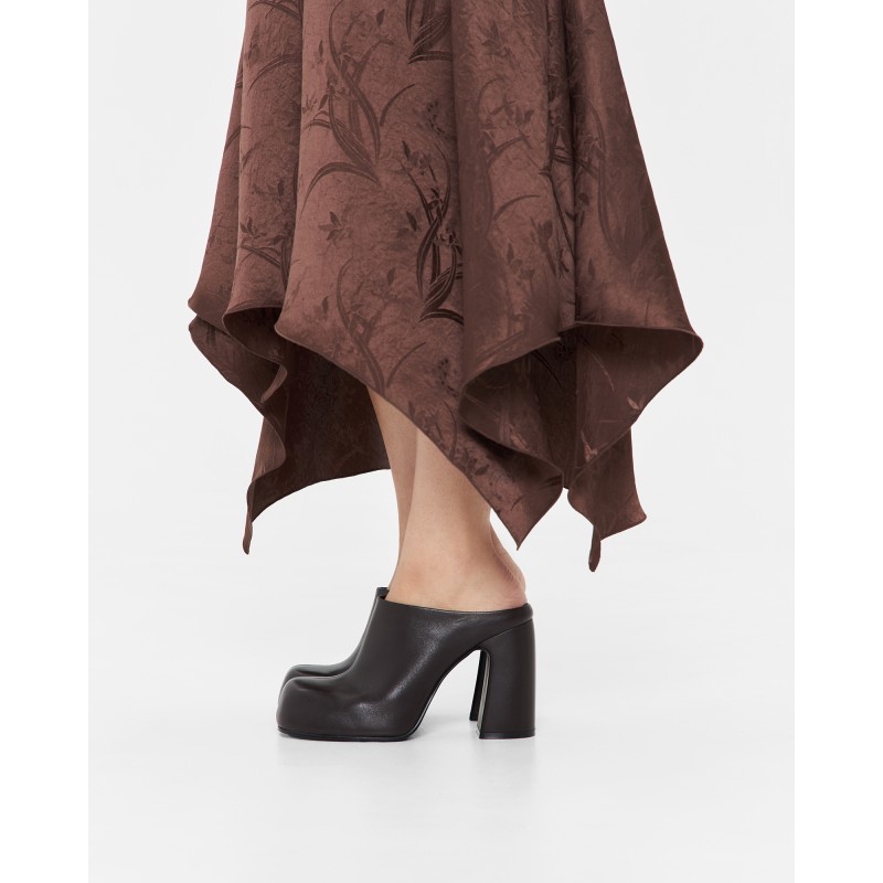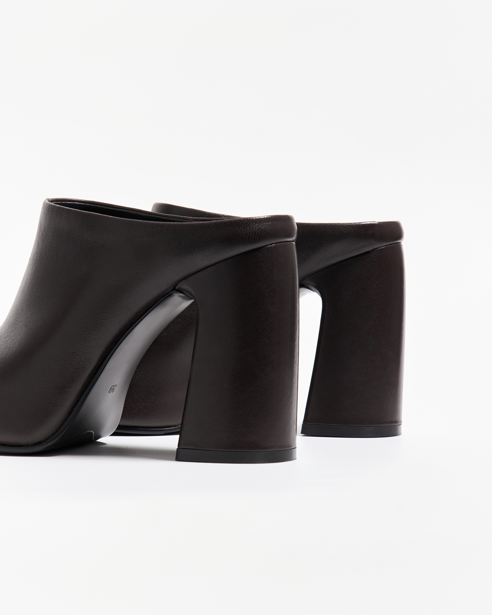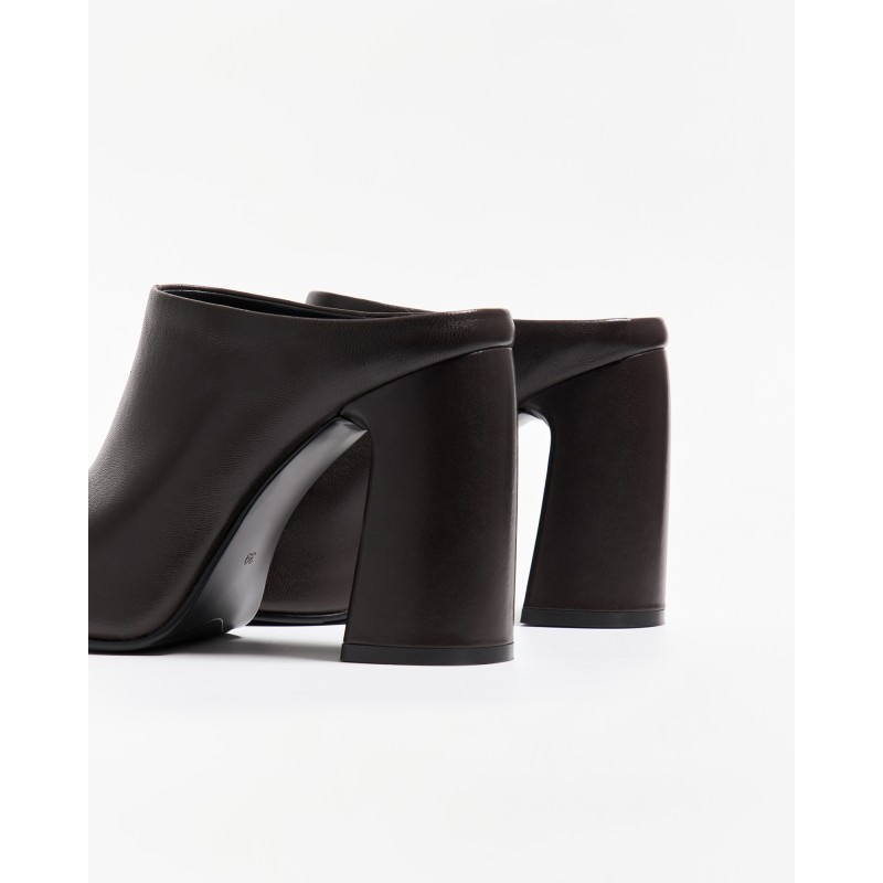 Клоги с квадратным мысом выполнены из натуральной кожи в коричневом цвете. Модель дополнена широким плато и высоким, устойчивым каблуком.
