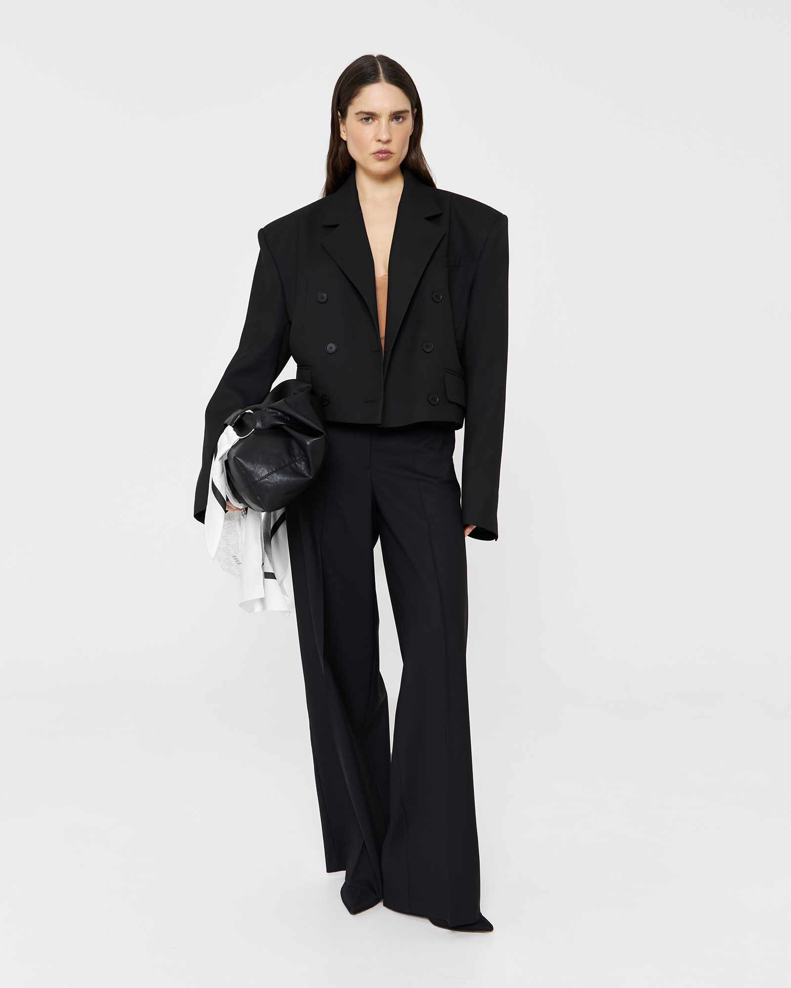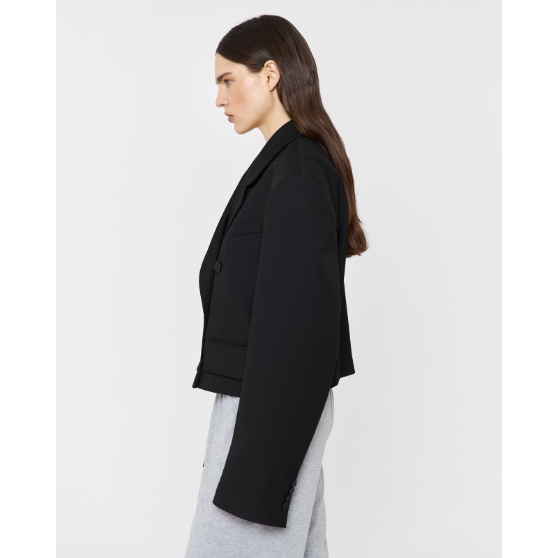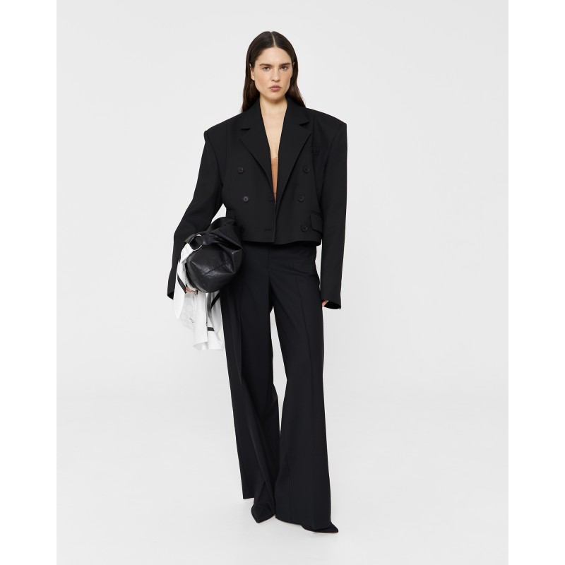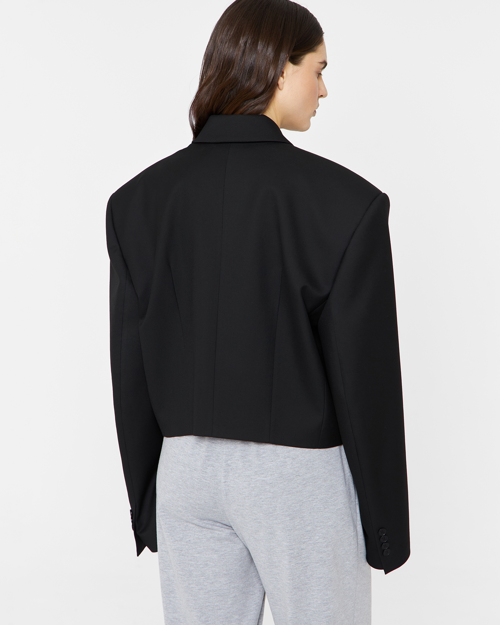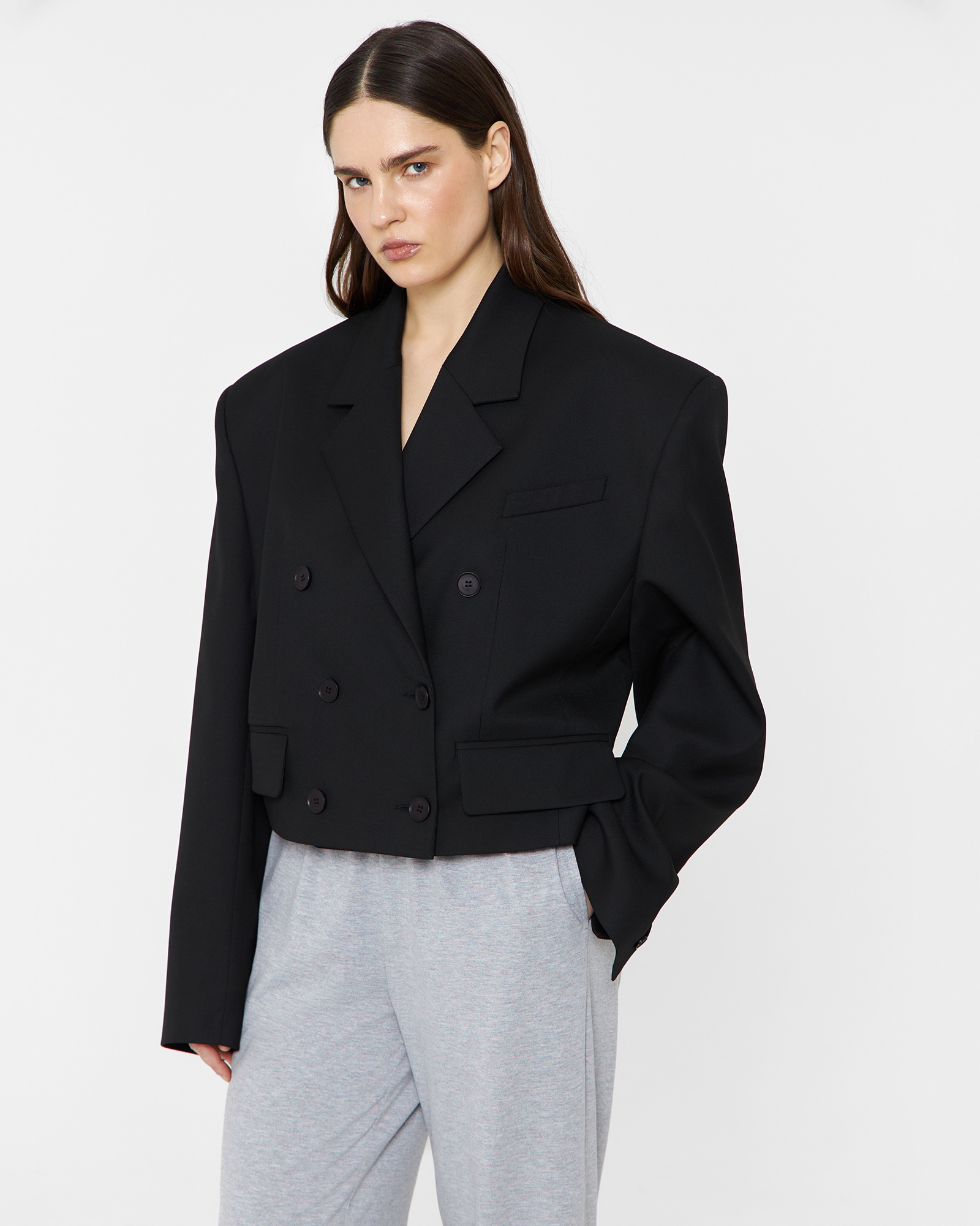 Двубортный укороченный пиджак оверсайз силуэта выполнен из костюмной ткани чёрного цвета. Изделие создано в эстетике классического мужского костюма: увеличенная линия плеча, карманы в рамку с клапаном, нагрудная листочка.