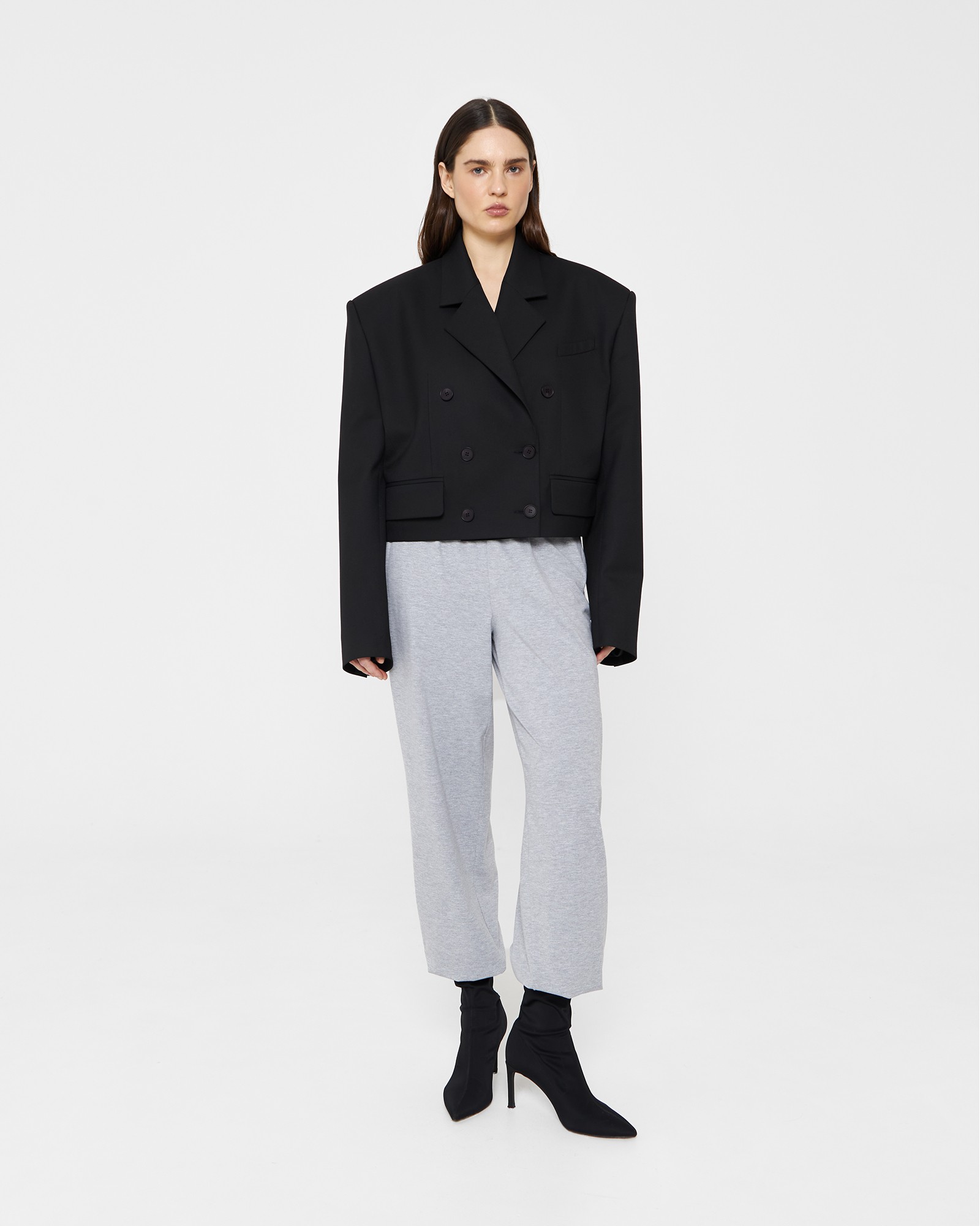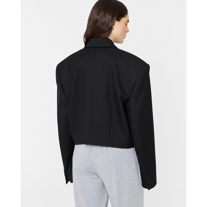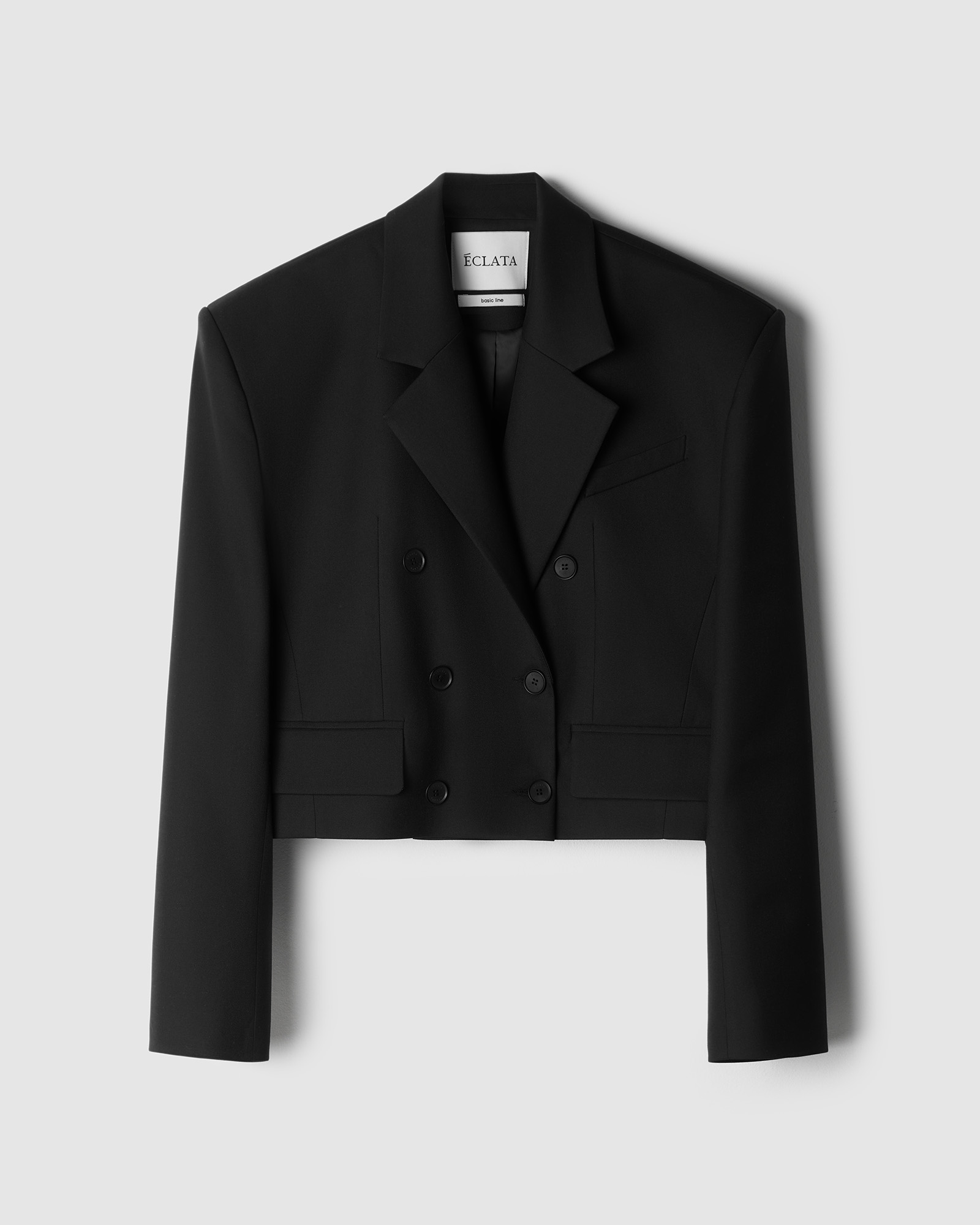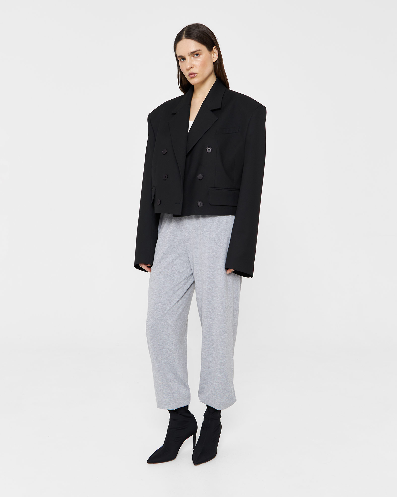 Двубортный укороченный пиджак оверсайз силуэта выполнен из костюмной ткани чёрного цвета. Изделие создано в эстетике классического мужского костюма: увеличенная линия плеча, карманы в рамку с клапаном, нагрудная листочка.