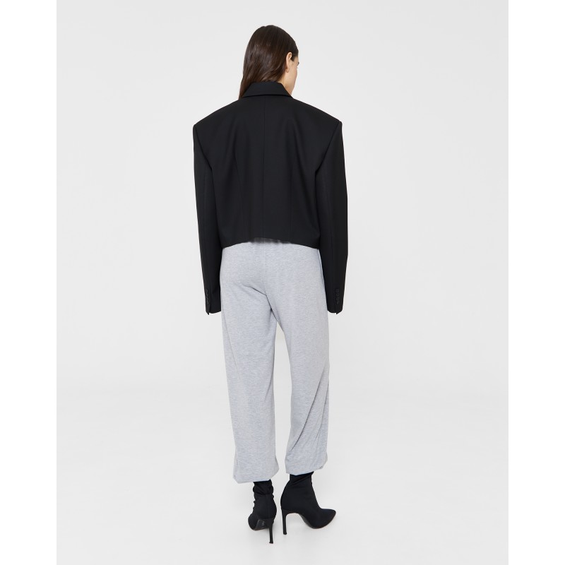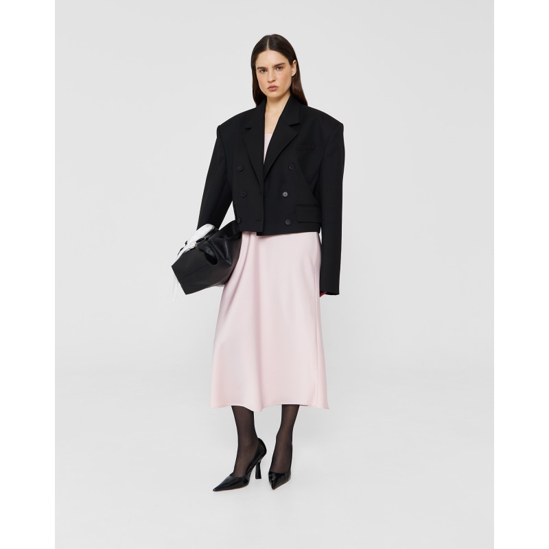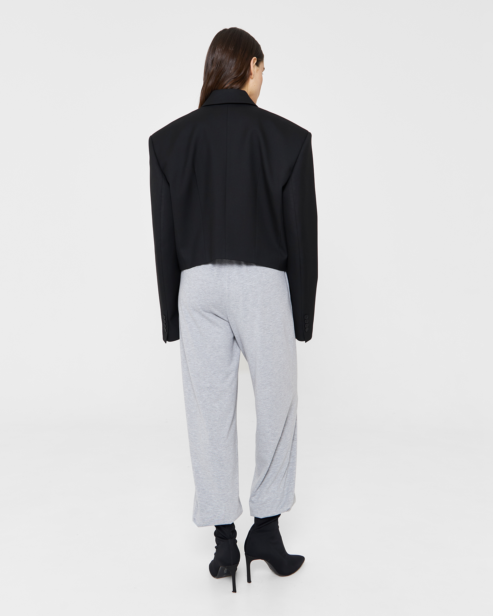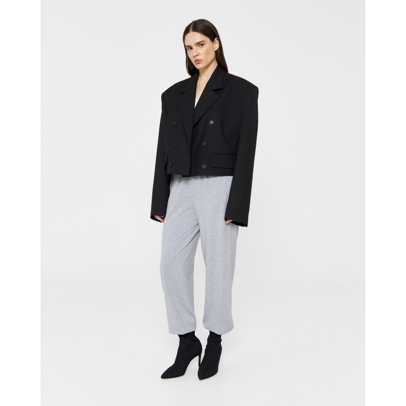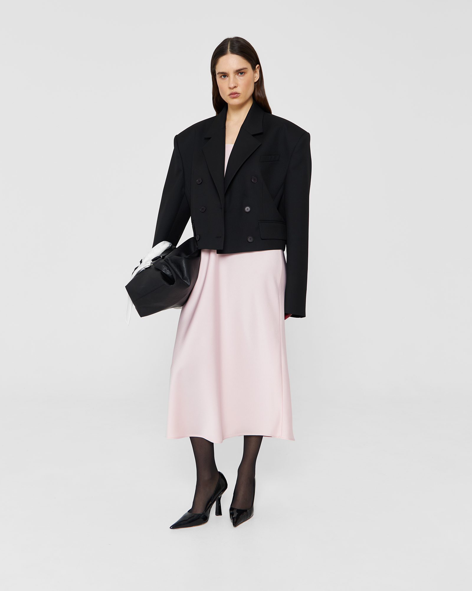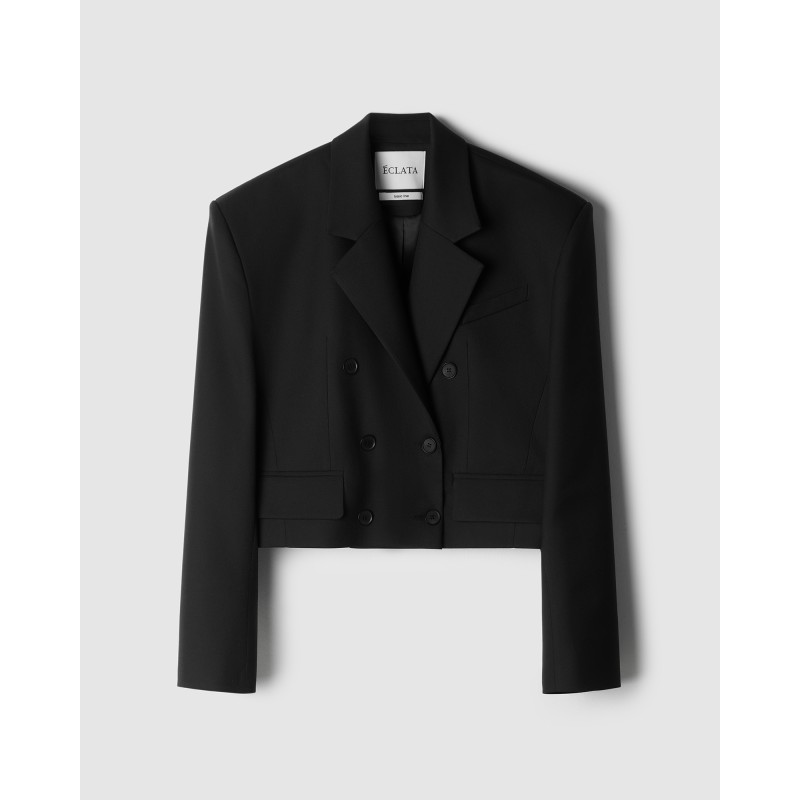 Двубортный укороченный пиджак оверсайз силуэта выполнен из костюмной ткани чёрного цвета. Изделие создано в эстетике классического мужского костюма: увеличенная линия плеча, карманы в рамку с клапаном, нагрудная листочка.