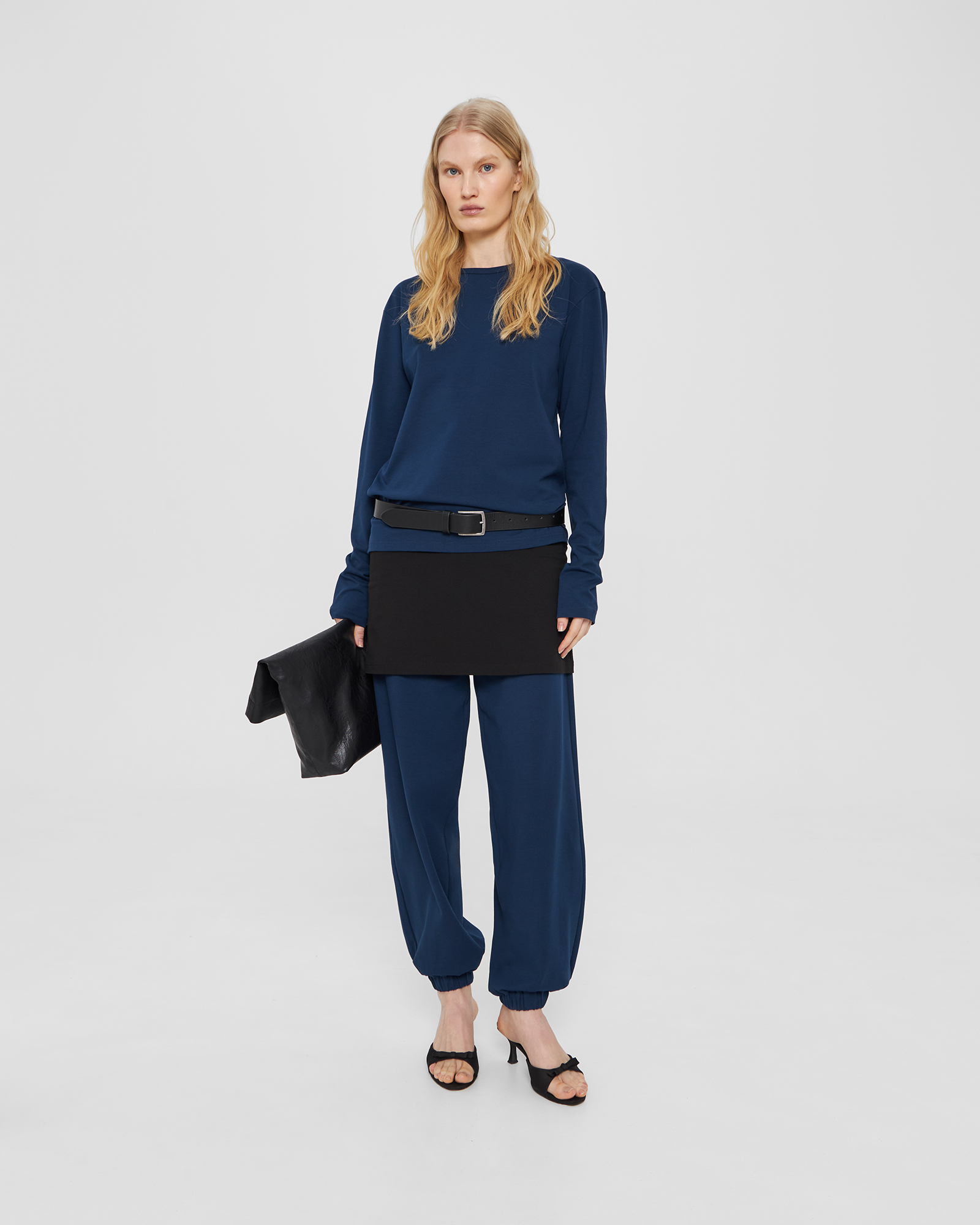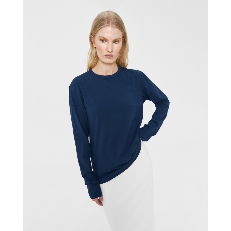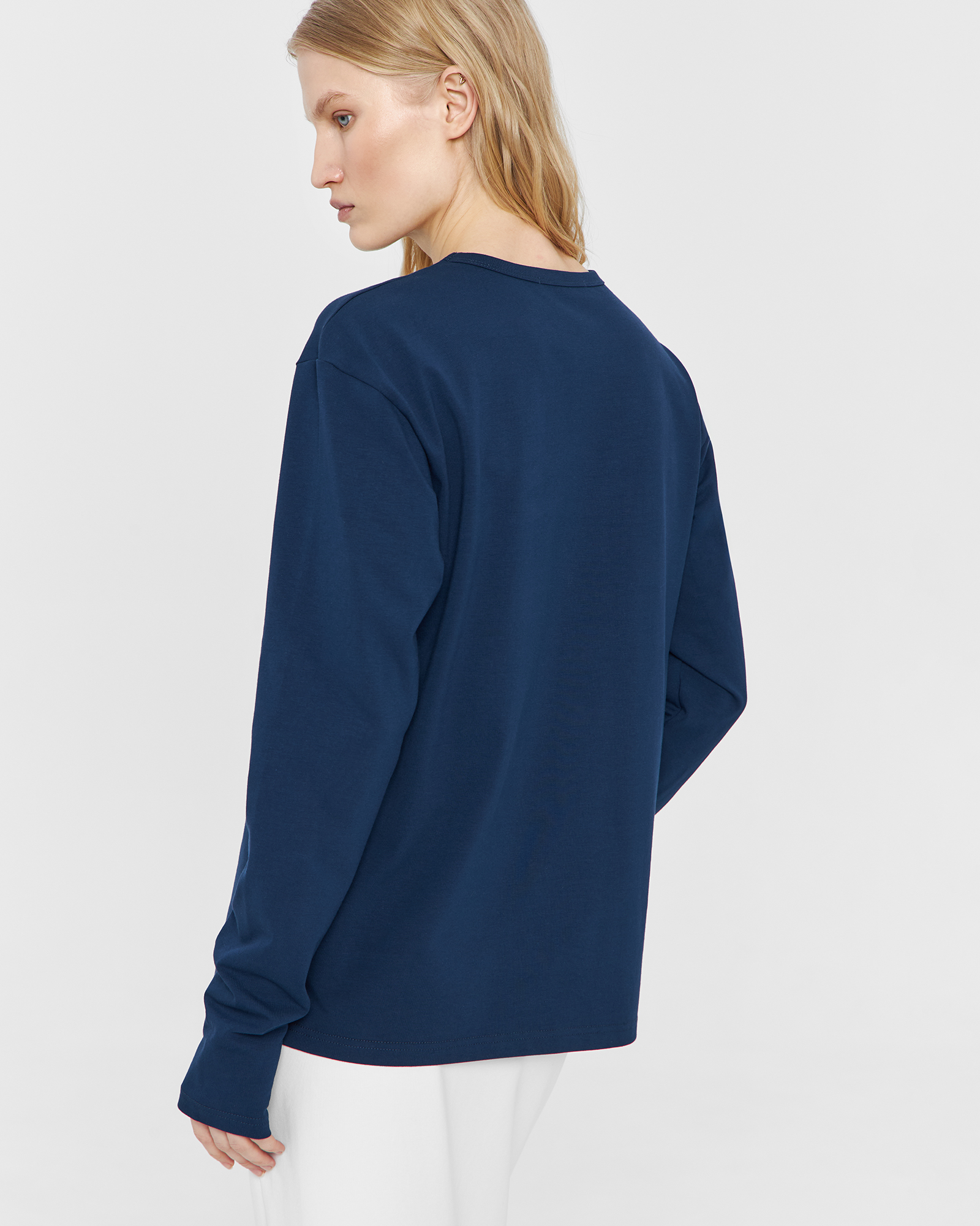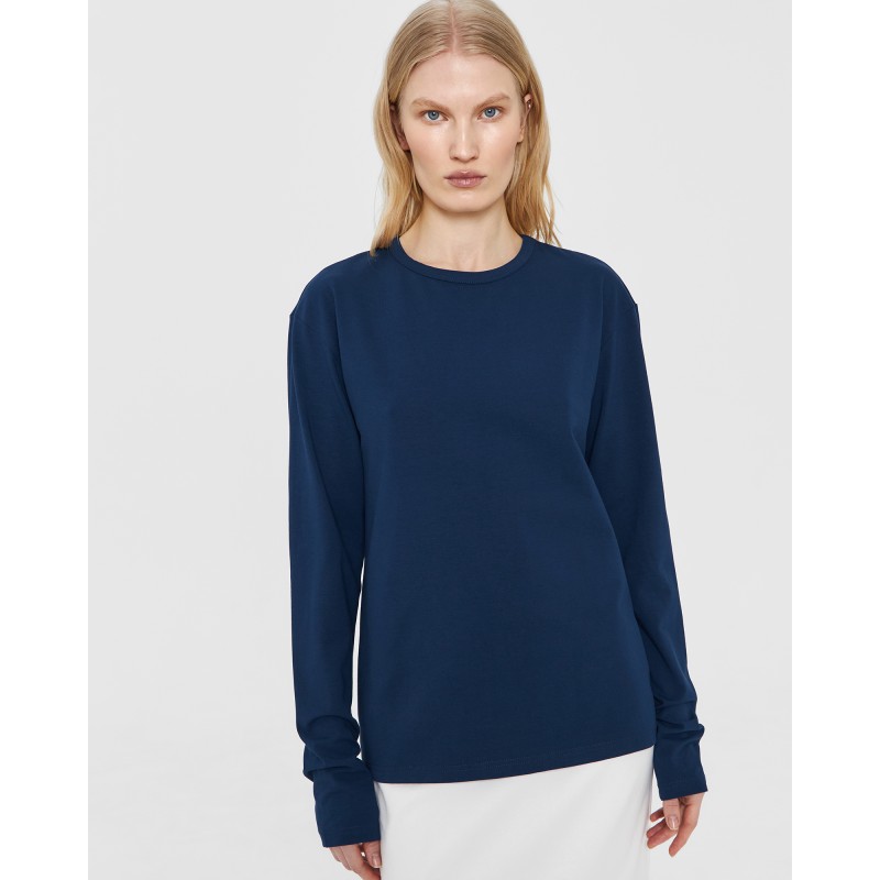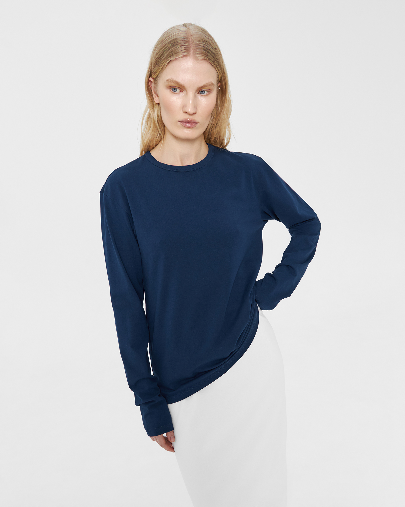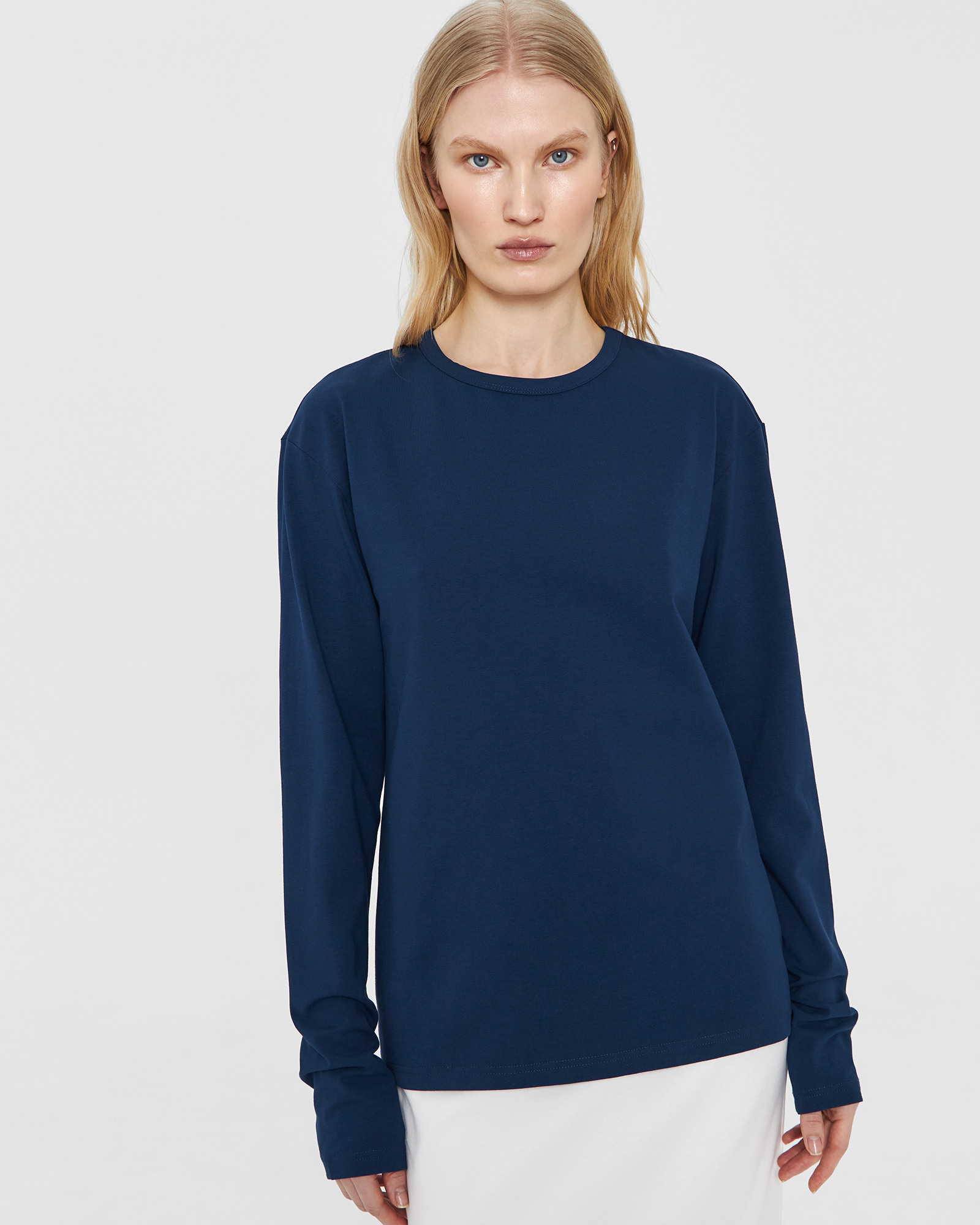 Базовый лонгслив прямого силуэта выполнен из мягкого хлопка с эластаном. Средний объём позволяет легко использовать изделие в качестве первого слоя.