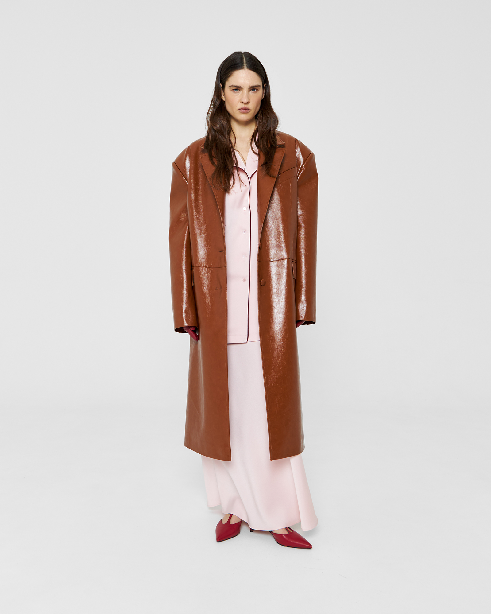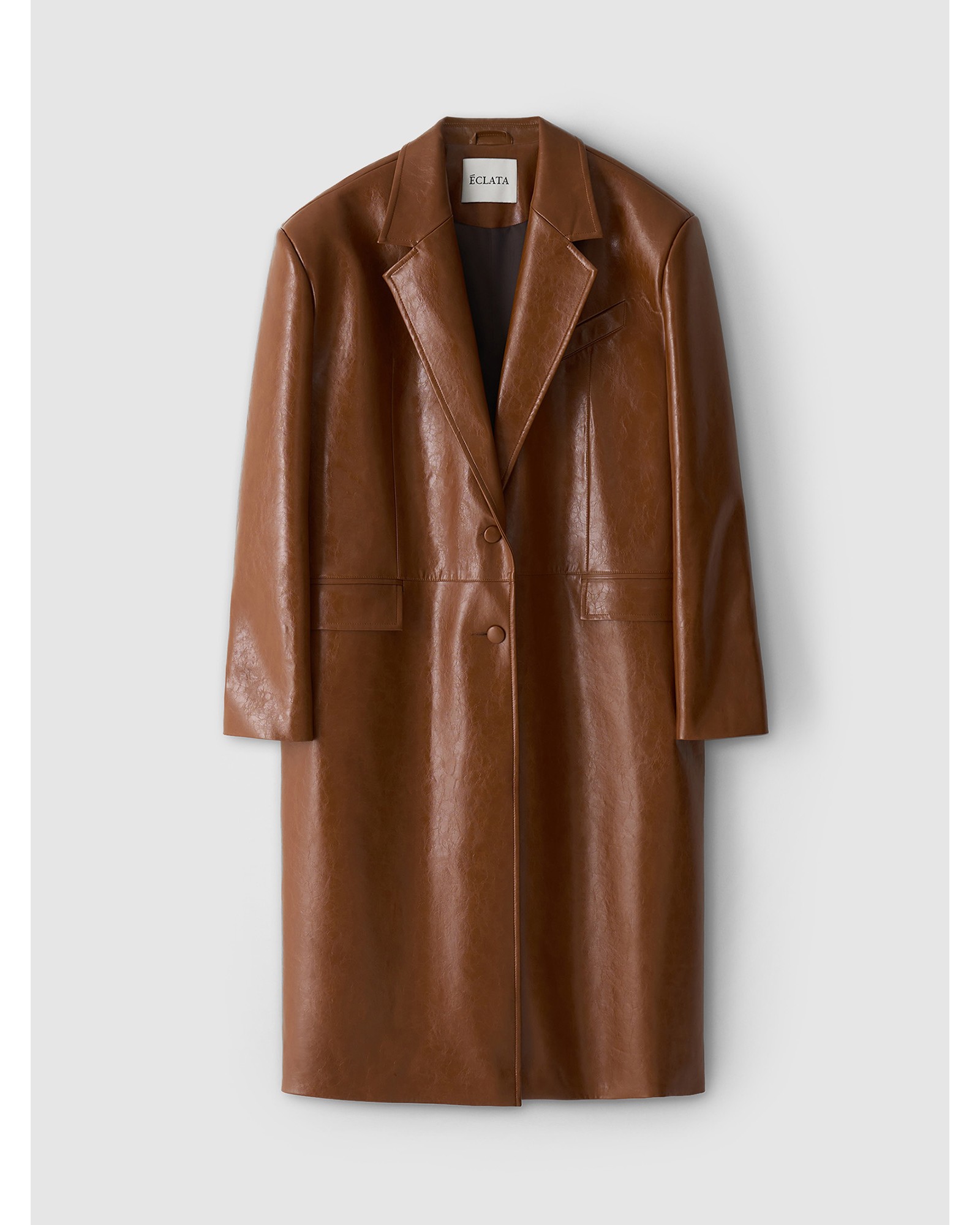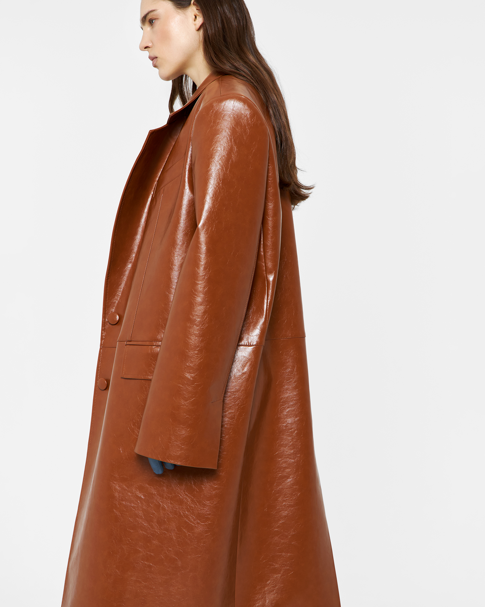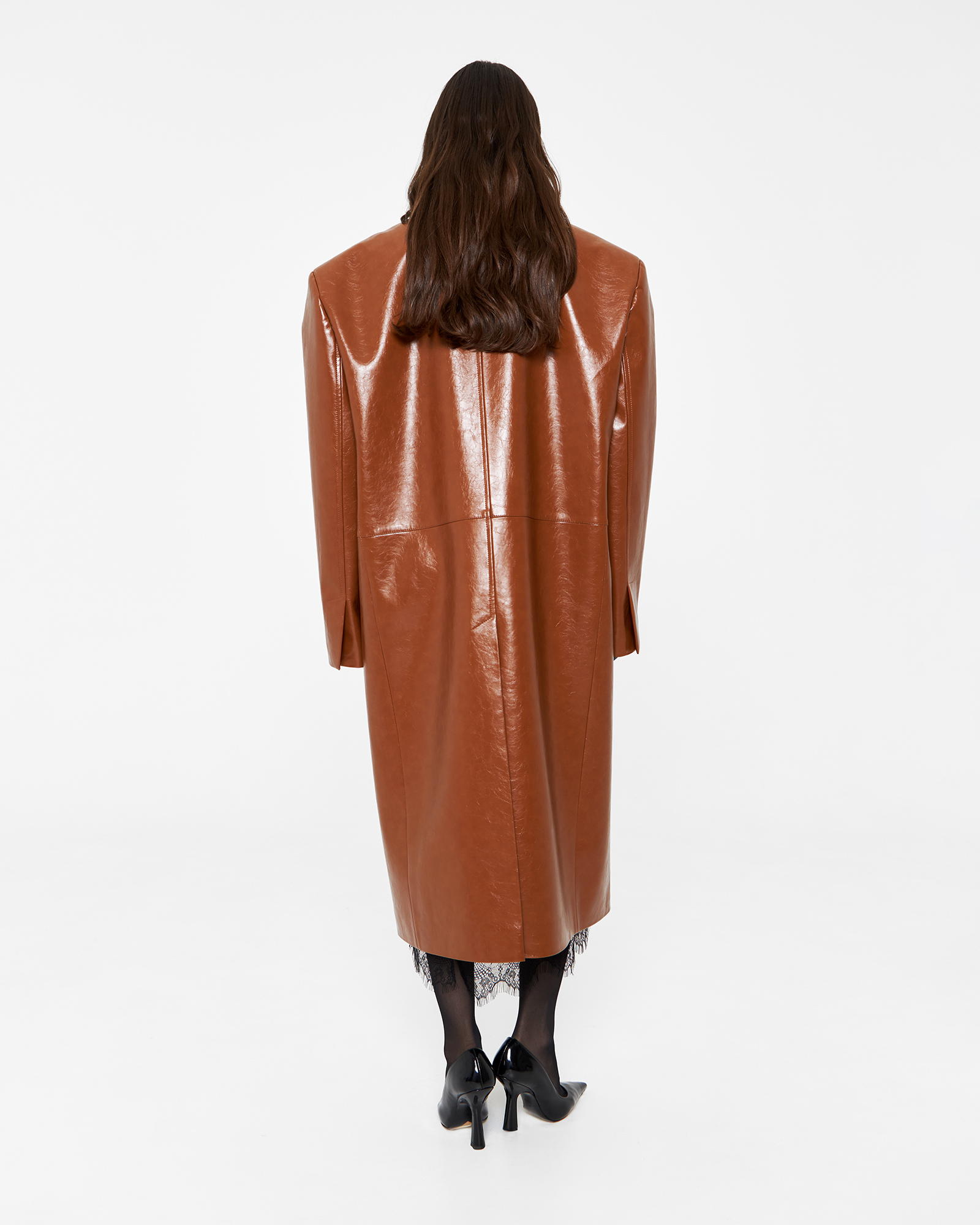 Пиджак длины миди из экокожи в карамельном цвете