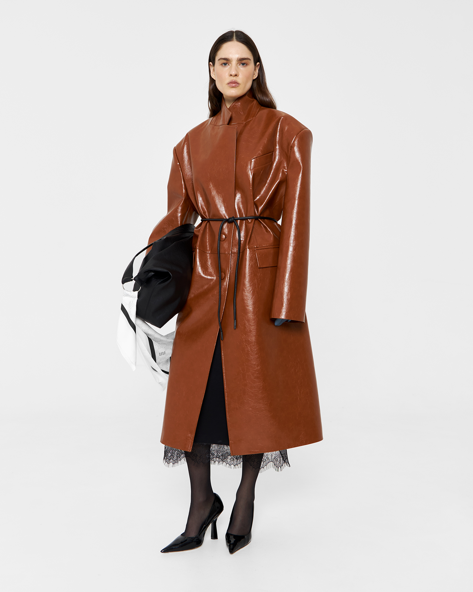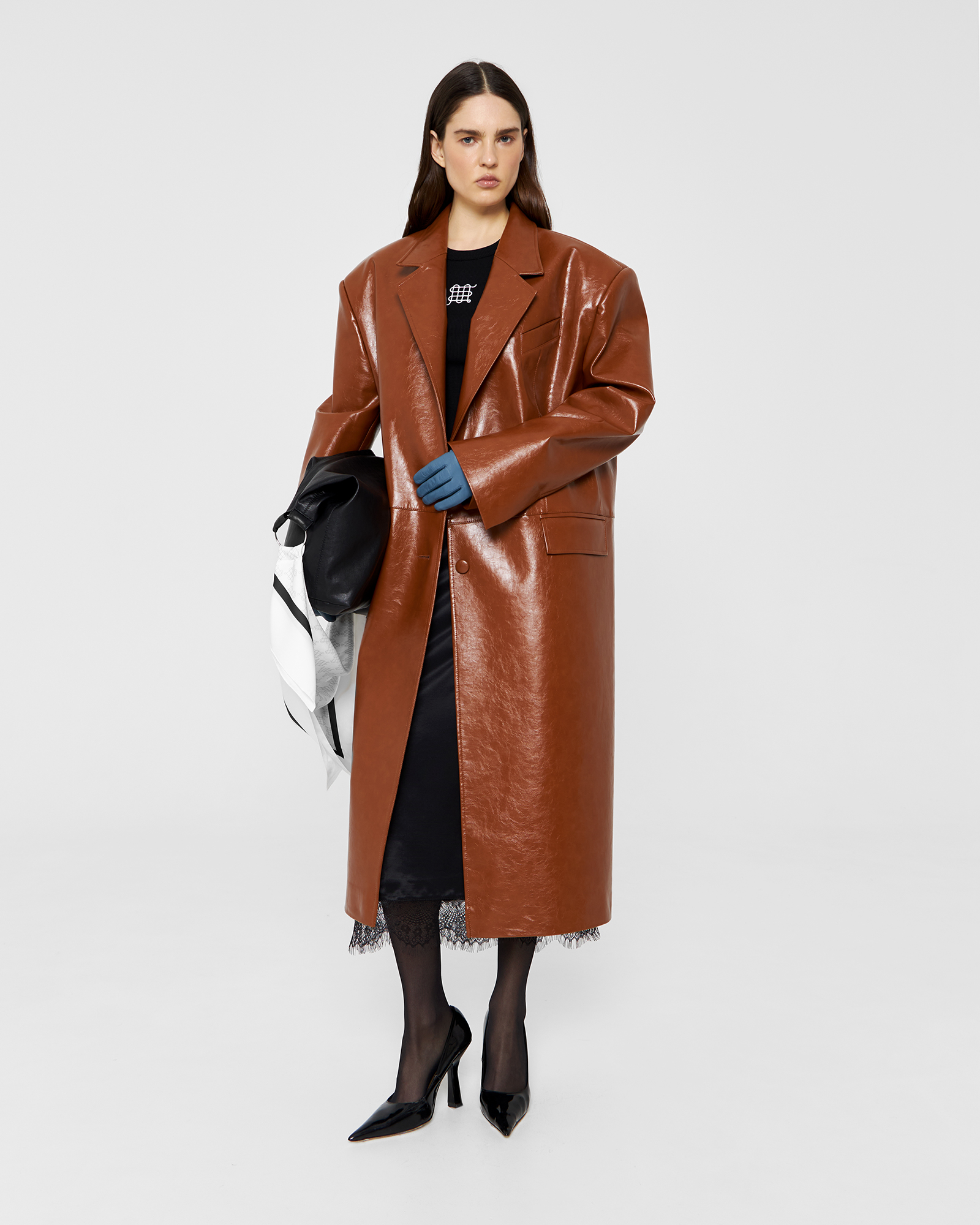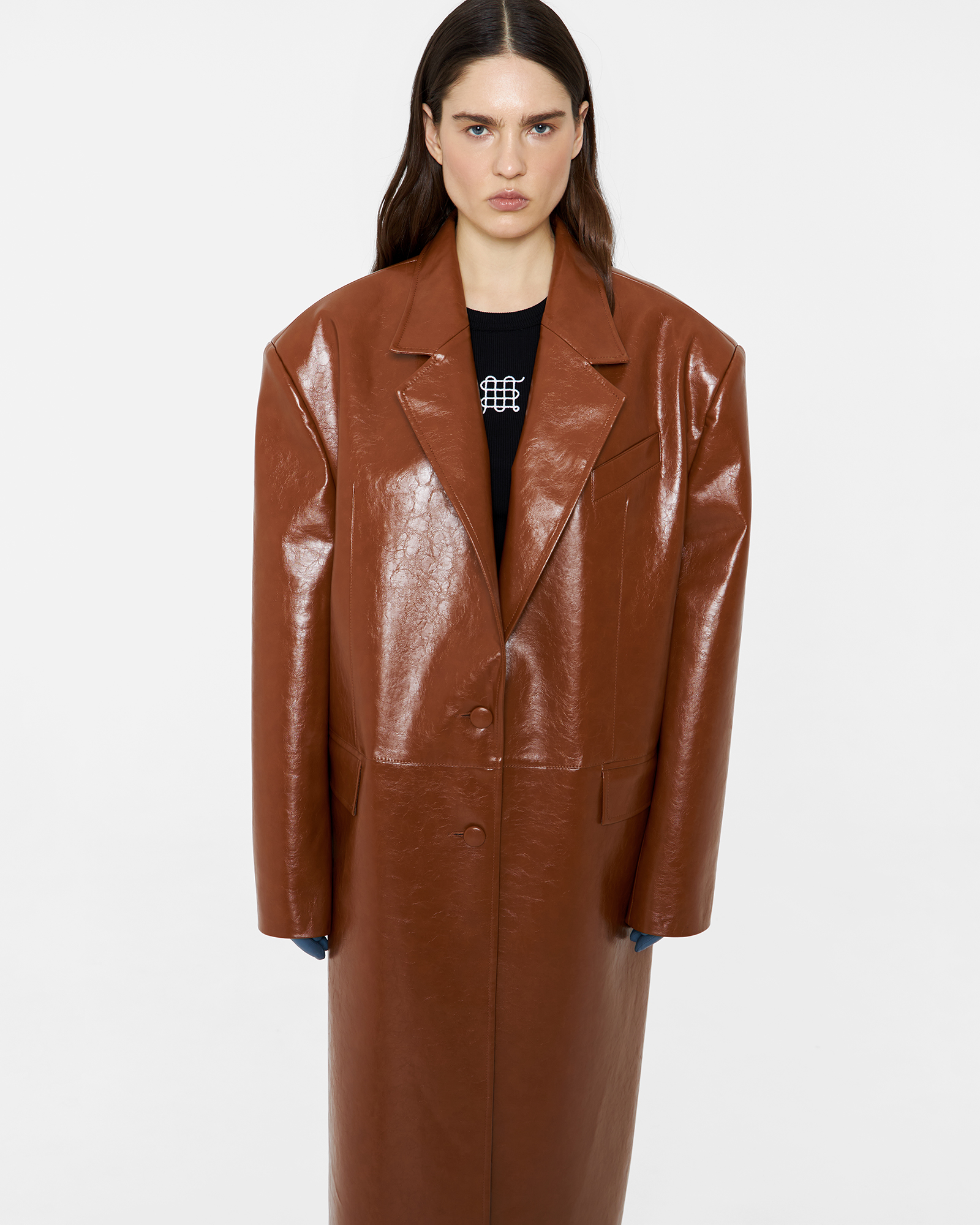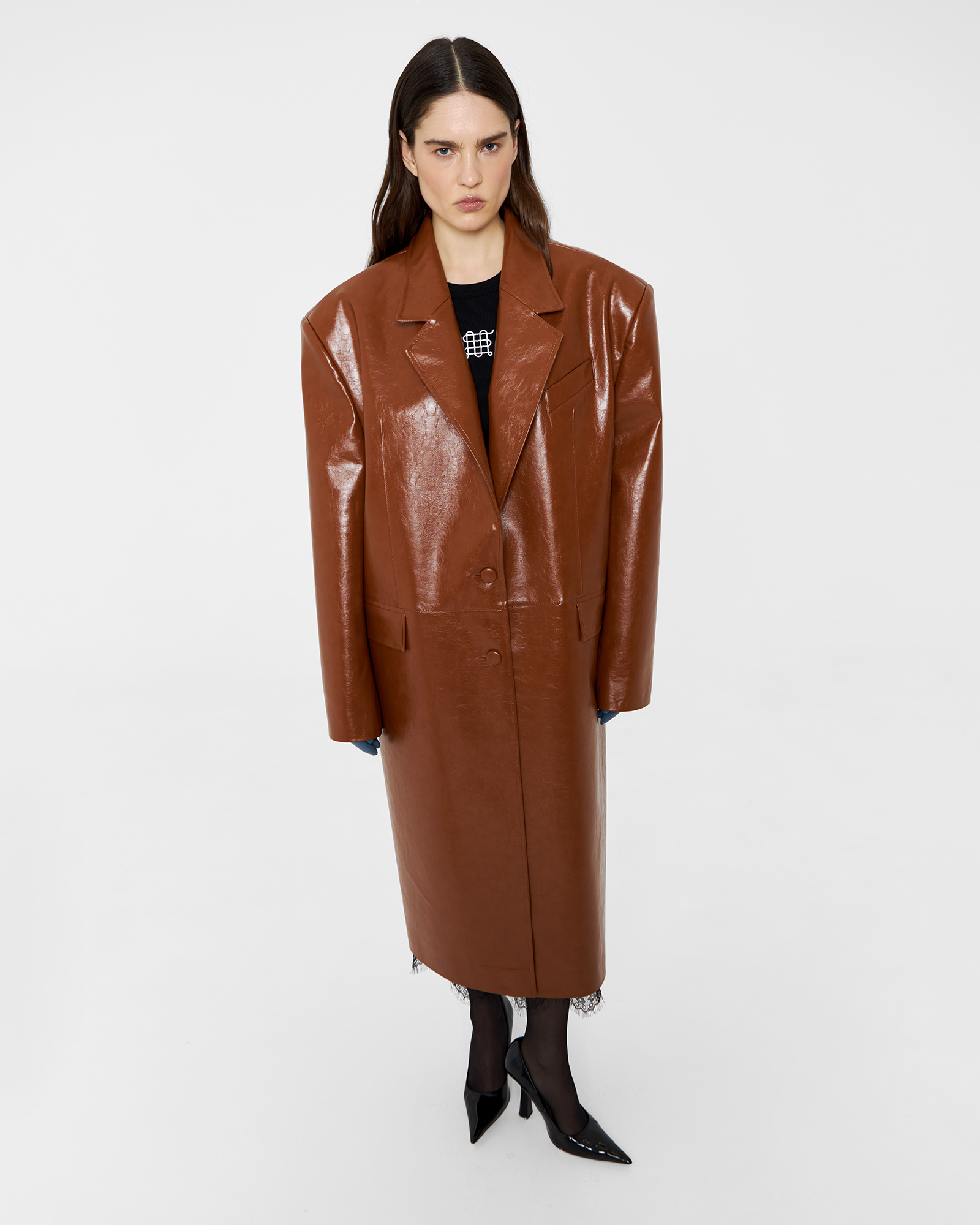 Оверсайз-модель пиджака стала вариацией кожаного плаща на температурный режим от +10 до +20 градусов. Жакет с увеличенной линией плеча сконструирован из отдельных деталей полочек, соединенных декоративным горизонтальным швом на линии заниженной талии.