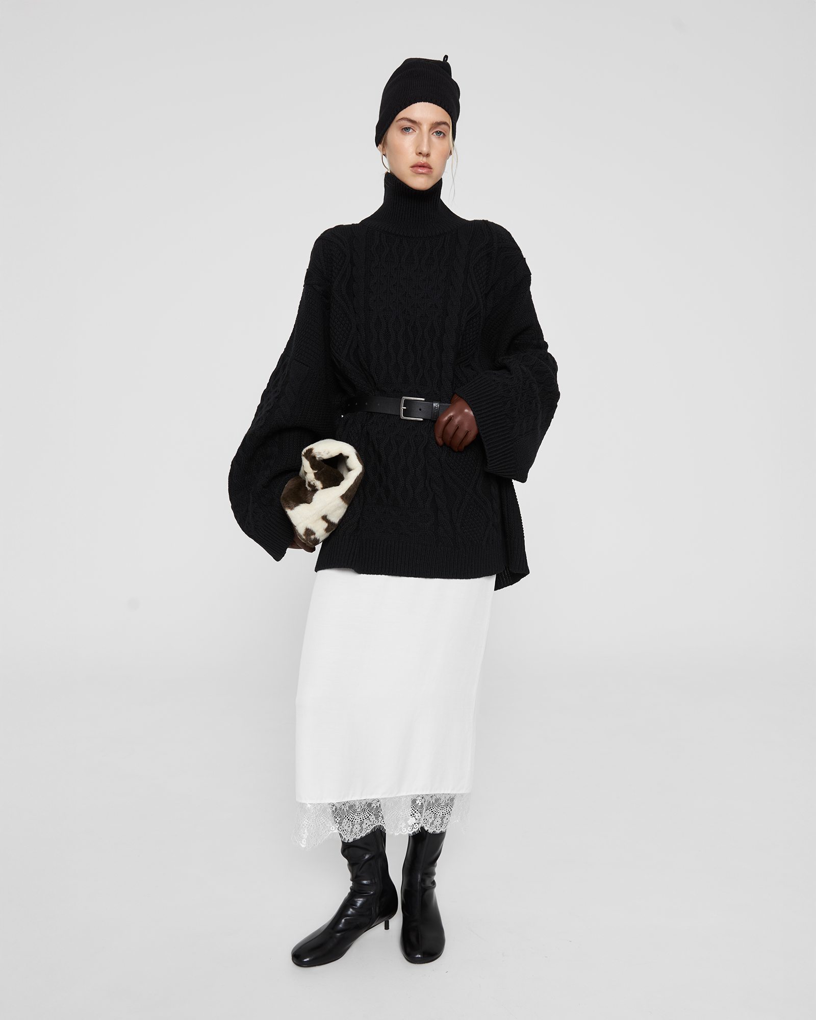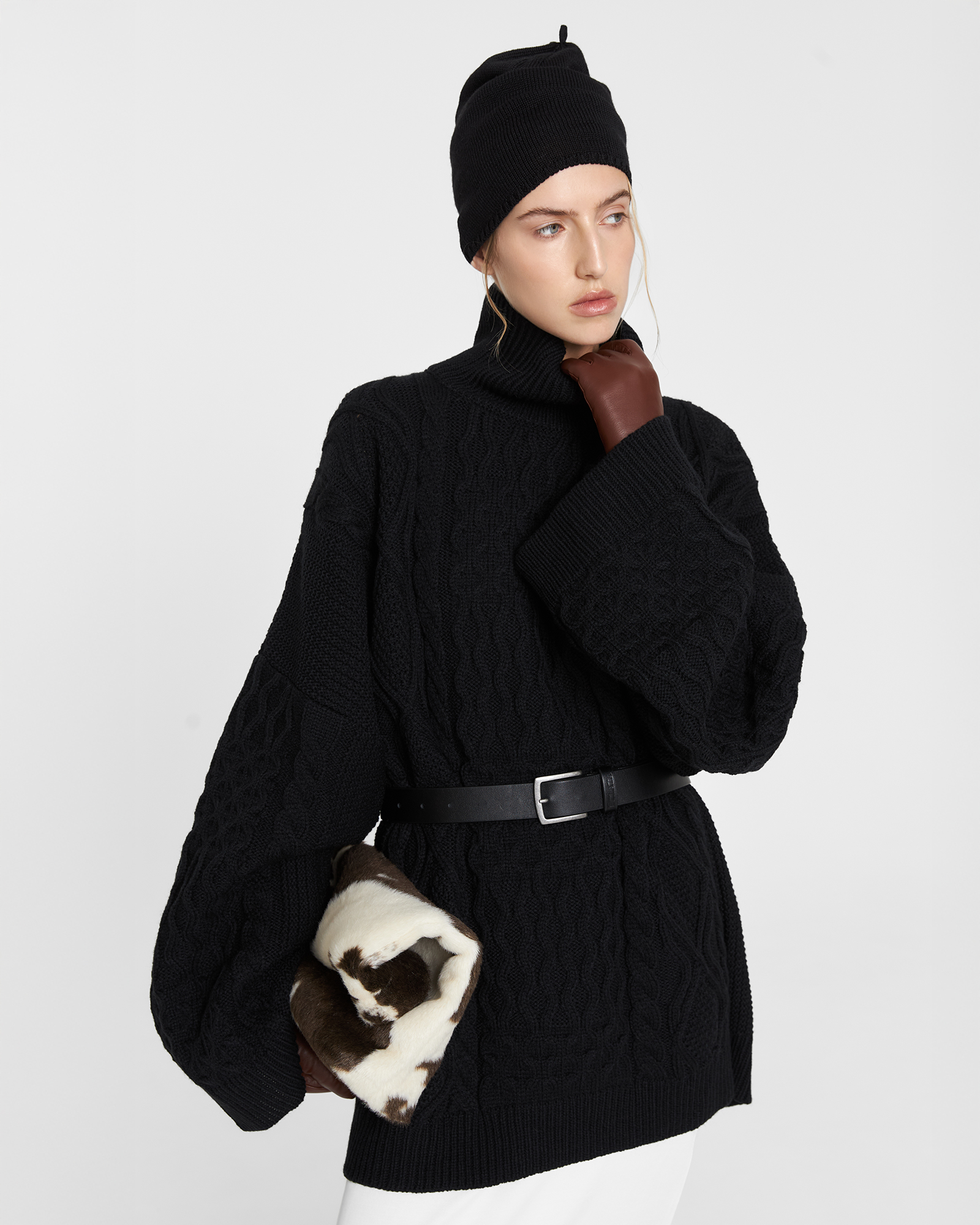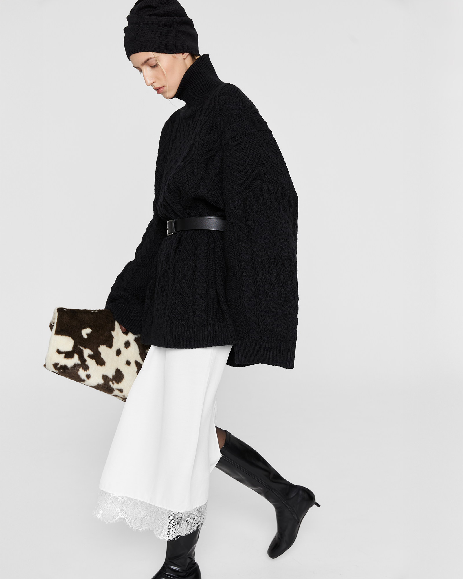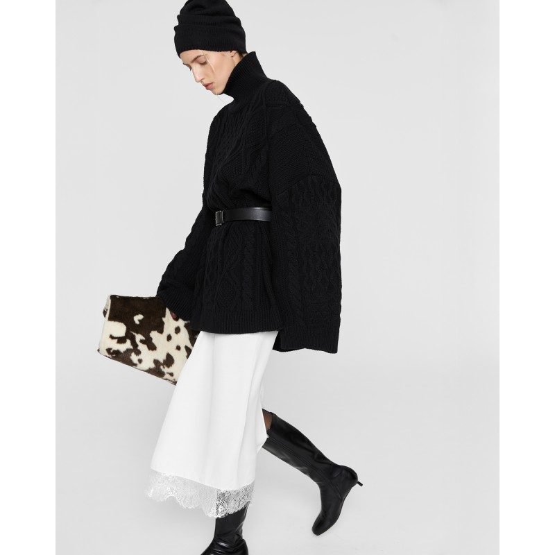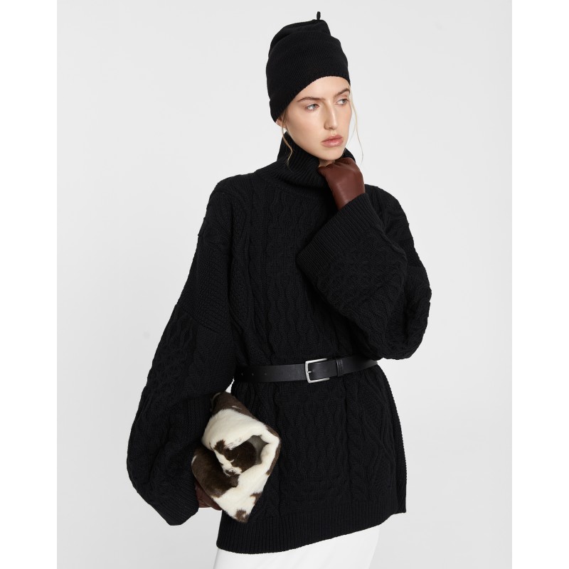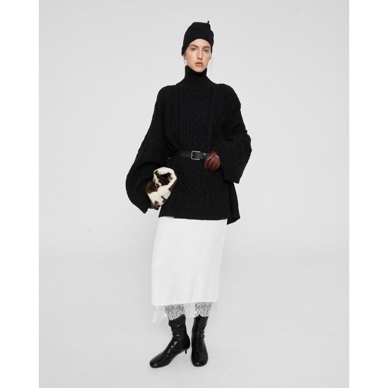 Свитер Daddy’s органично соединил в себе винтажное настроение и отсылку коллекции к стилю ар-нуво. Мягкое уютное изделия оверсайз объема с шерстью мериноса в составе как будто снято с папиного плеча. Свитер имеет прямой крой, широкие рукава и воротник стойку.