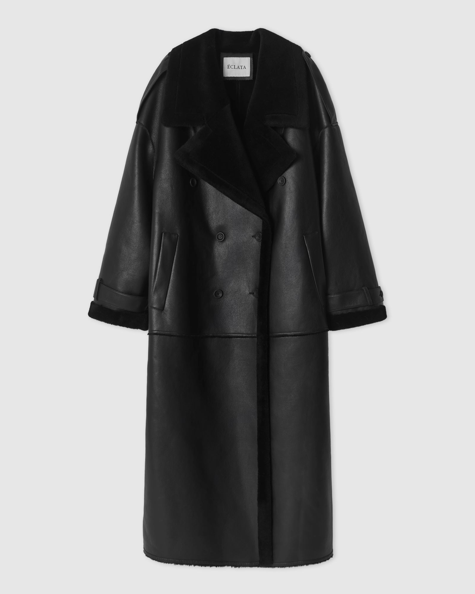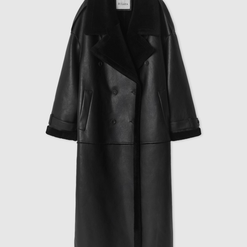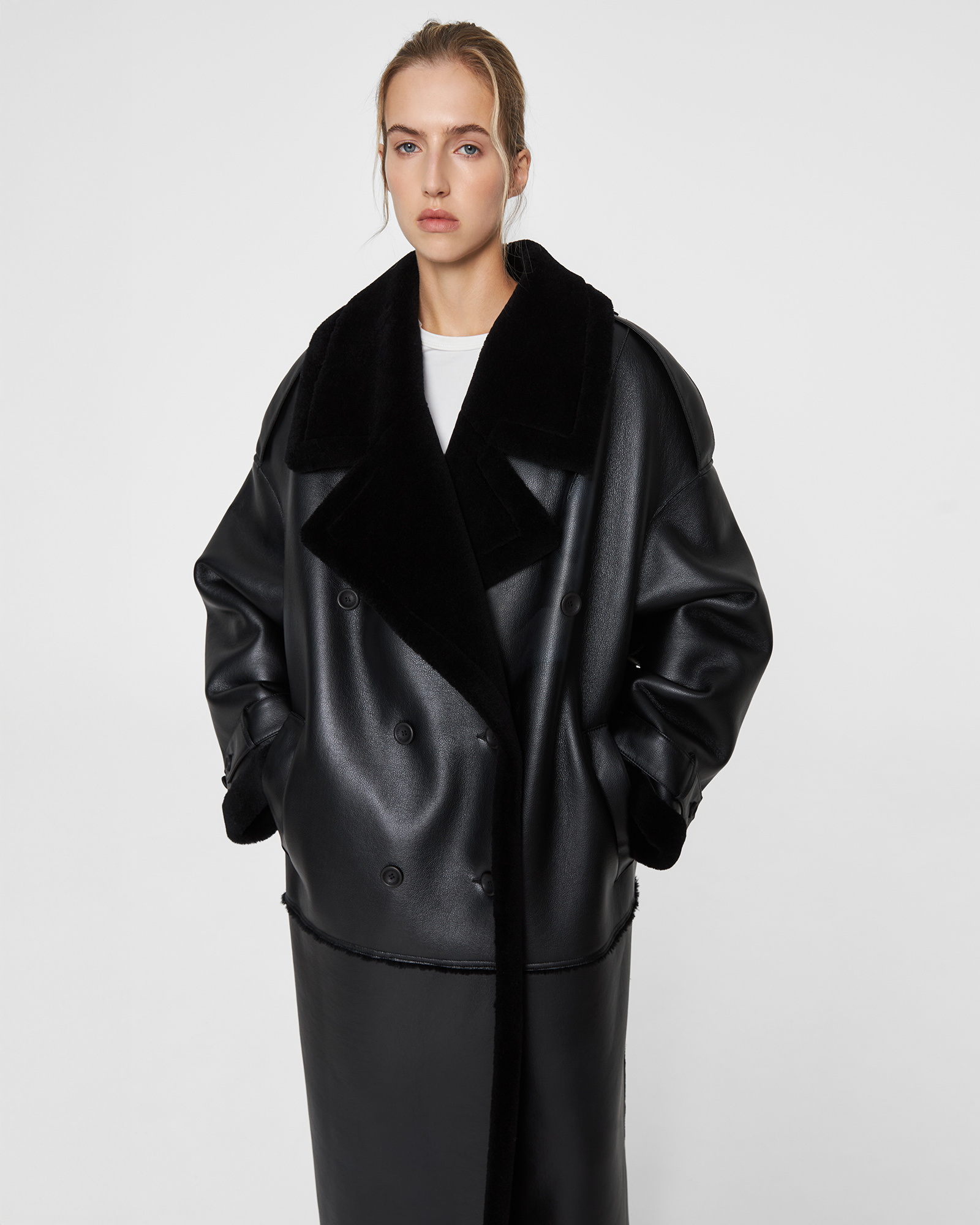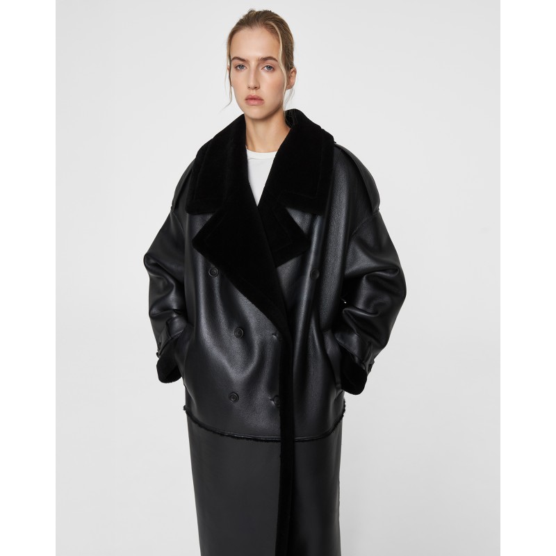 брендированными пуговицами. Дубленка имеет двубортную застежку, глубокие