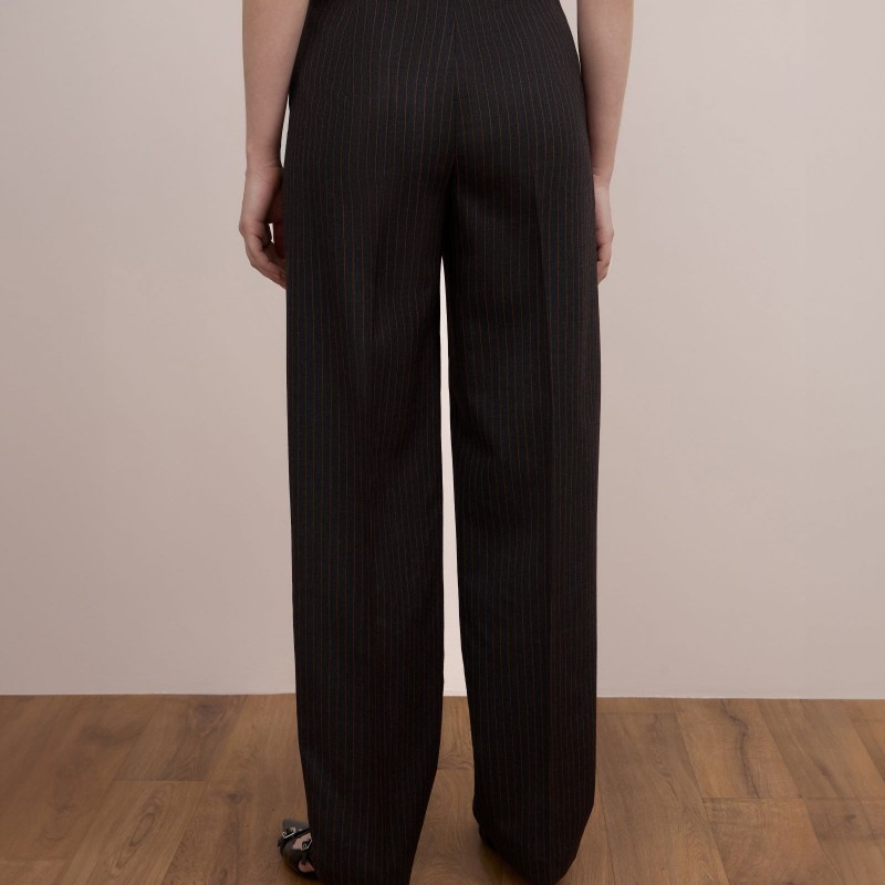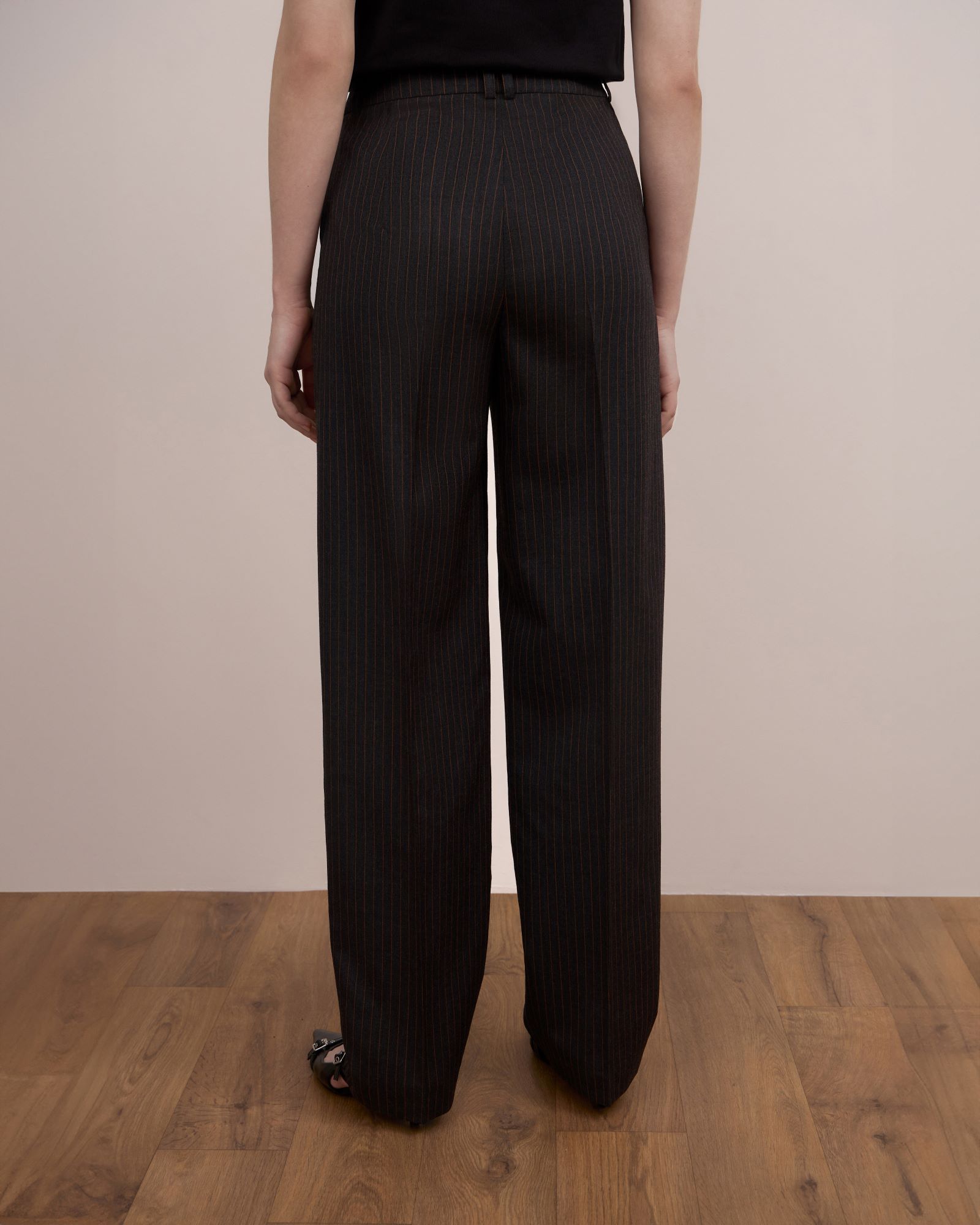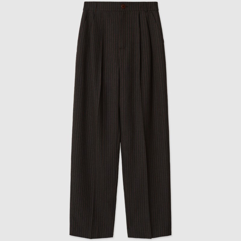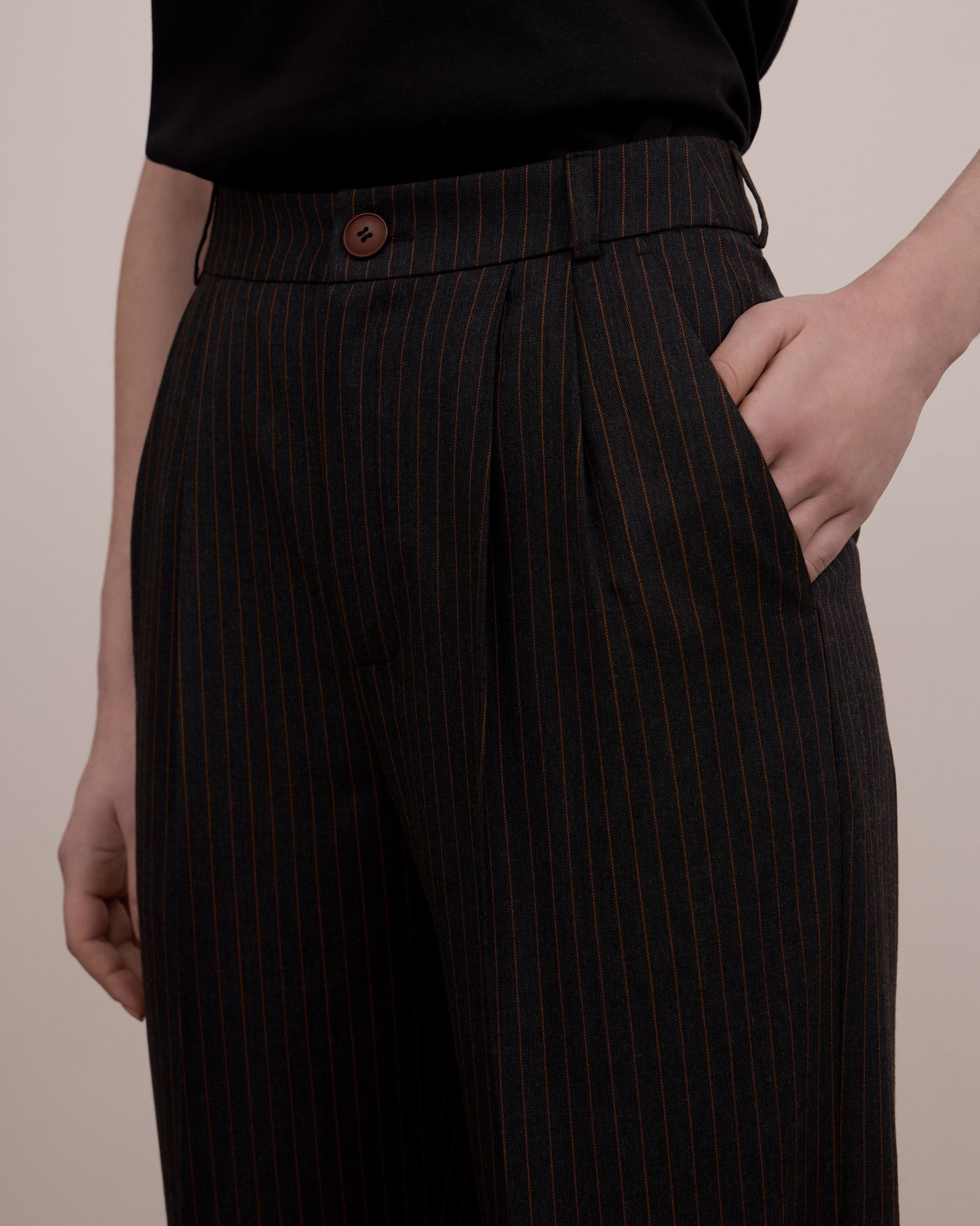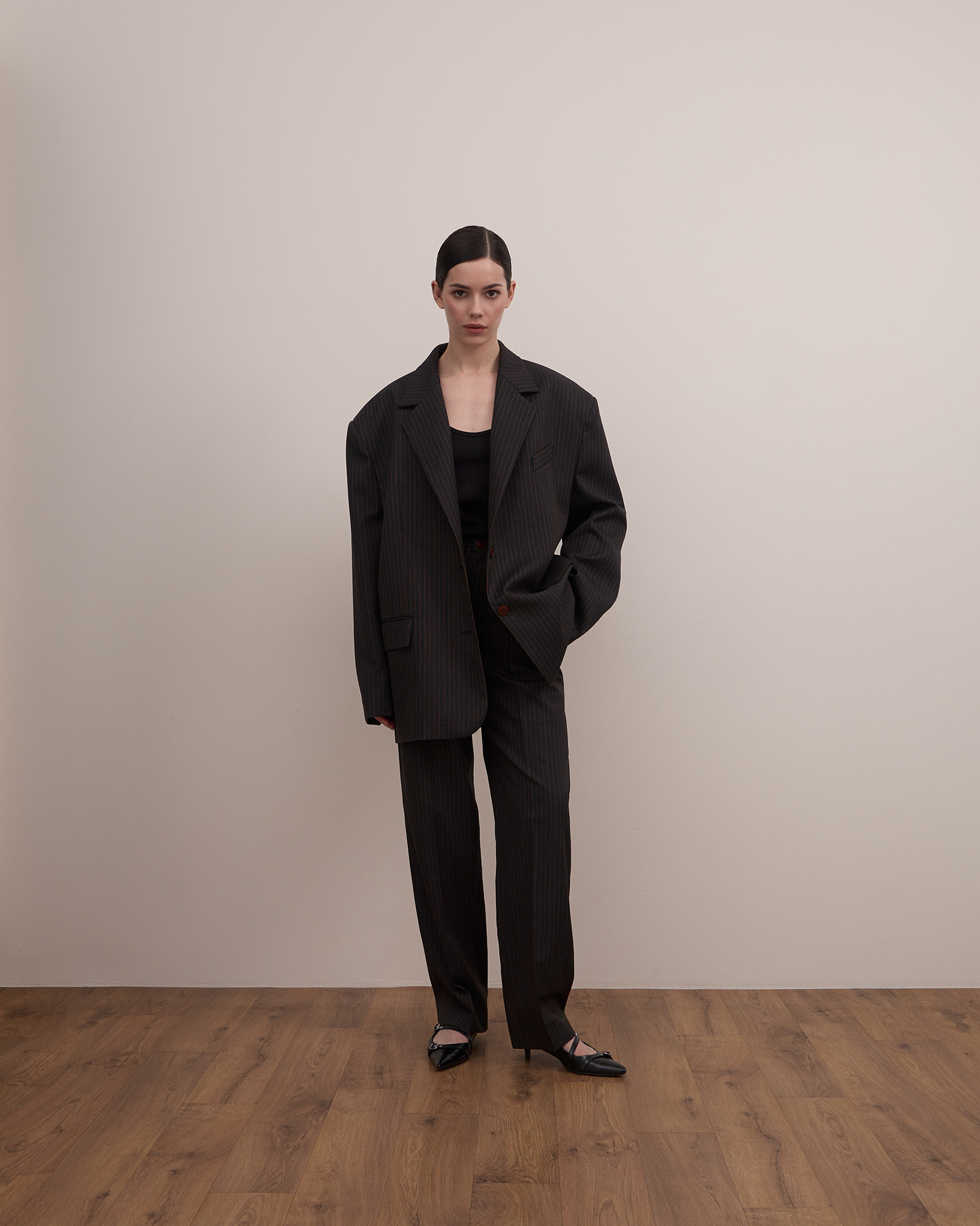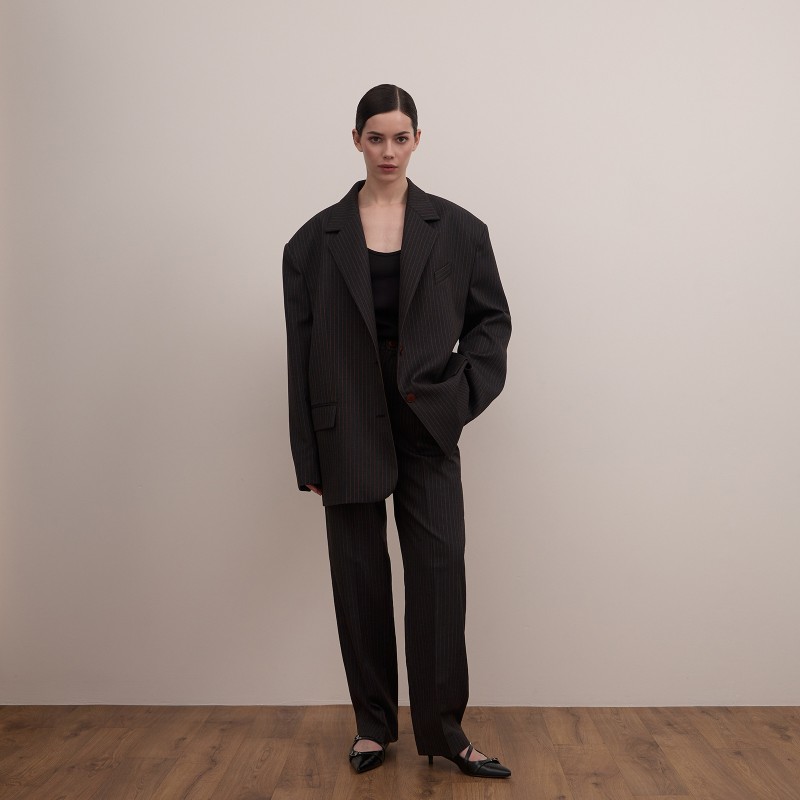 Брюки – бананы с посадкой чуть ниже талии в противовес пиджаку имеют более сдержанный объем. Изделие имеет боковые карманы и широкий пояс на талии со шлевками, в которые возможно вставить ремень, усилив  брутальный характер модели.