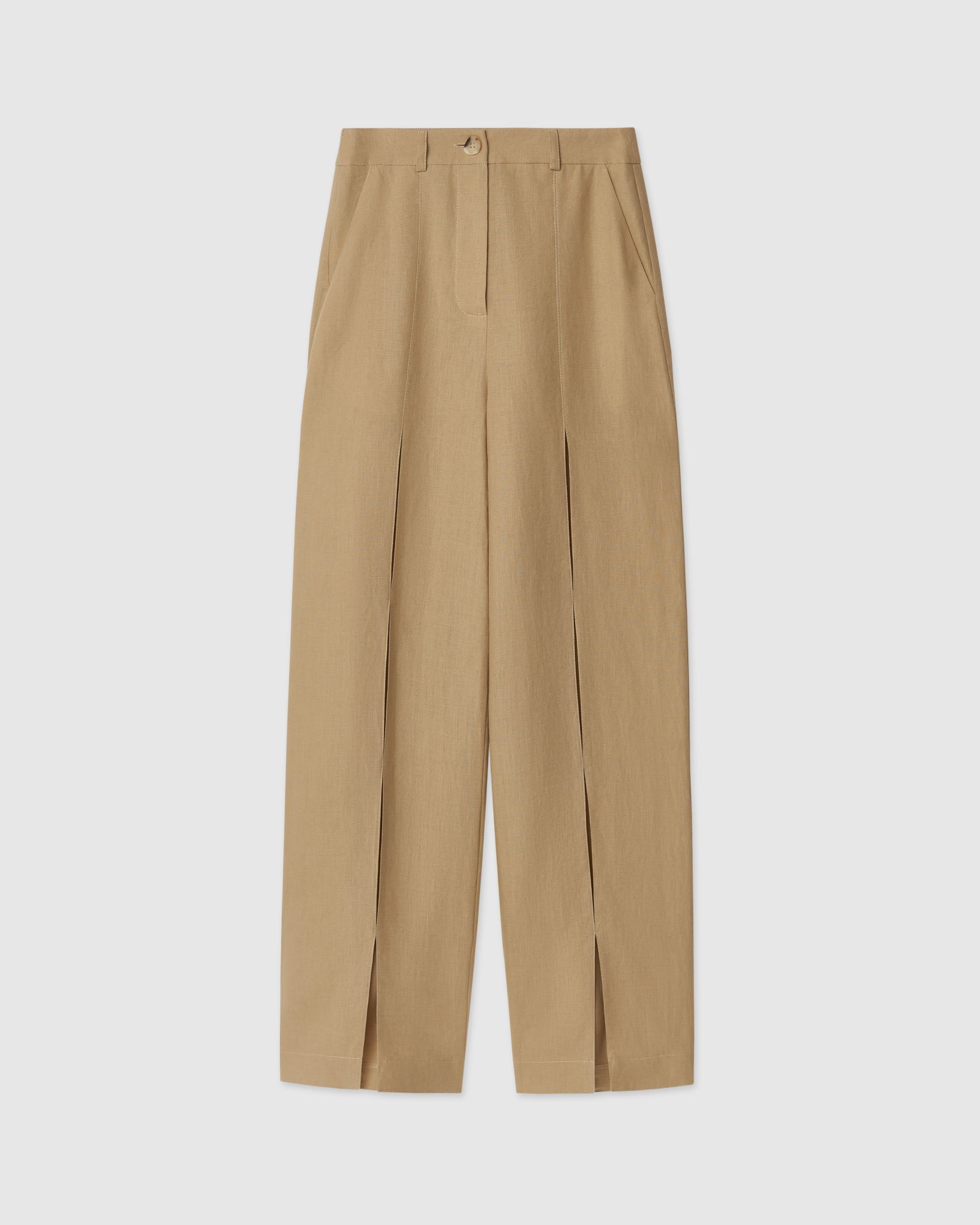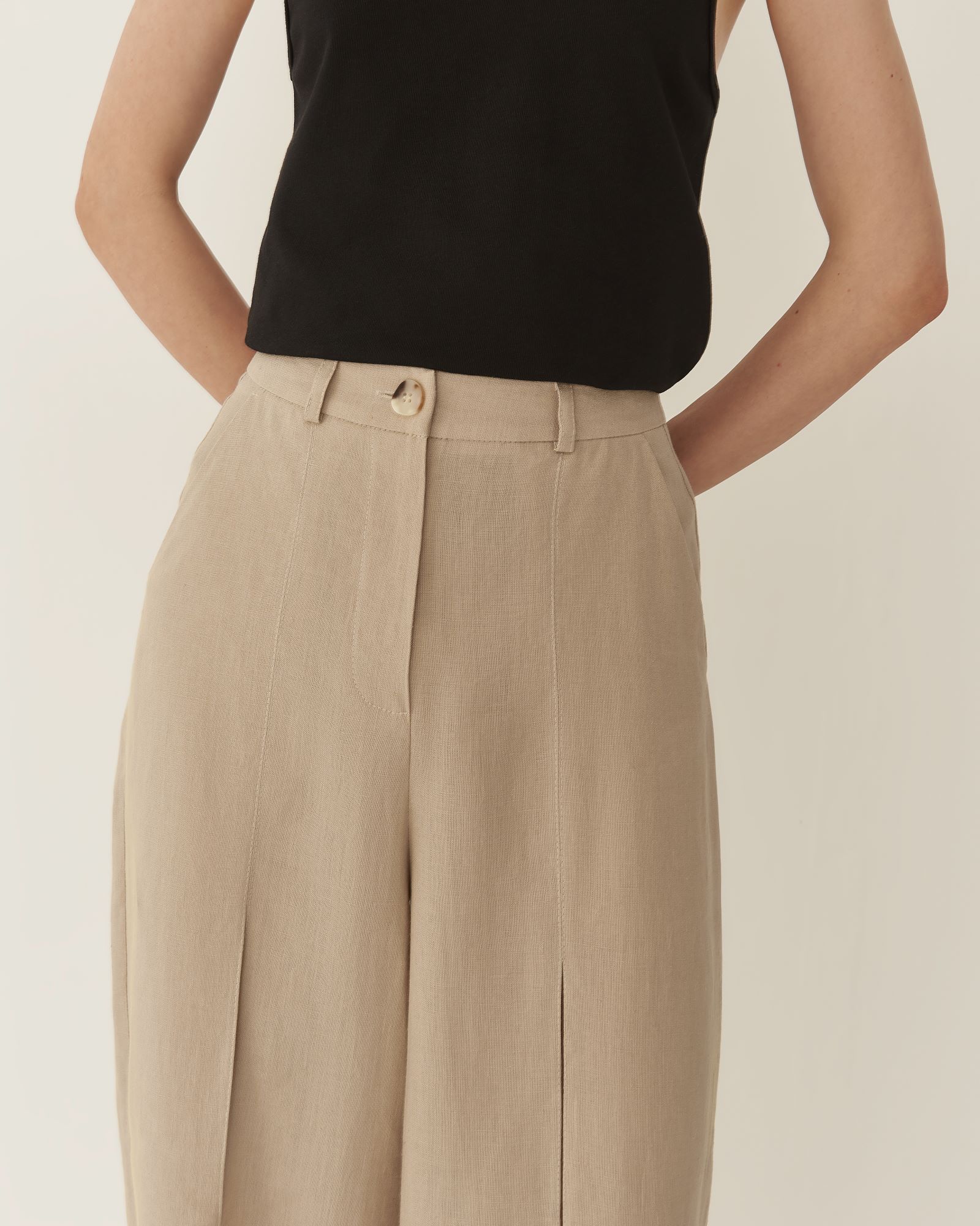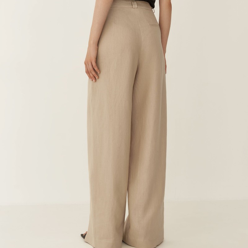 Акцентом прямых брюк из льна являются разрезы вдоль вертикальной линии по передней стороне изделия. Такая деталь, а также исполнение из 100% льна обеспечивают комфорт в жаркие дни лета. Брюки с посадкой на талии имеют два глубоких боковых кармана и декоративный карман-обманку на спинке изделия.