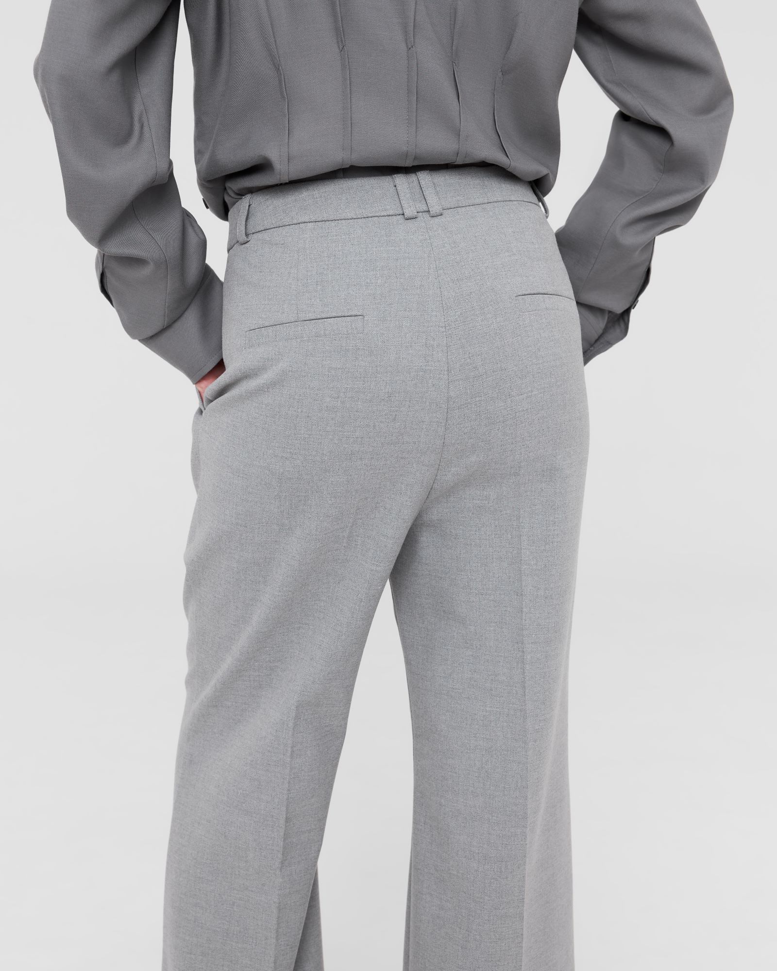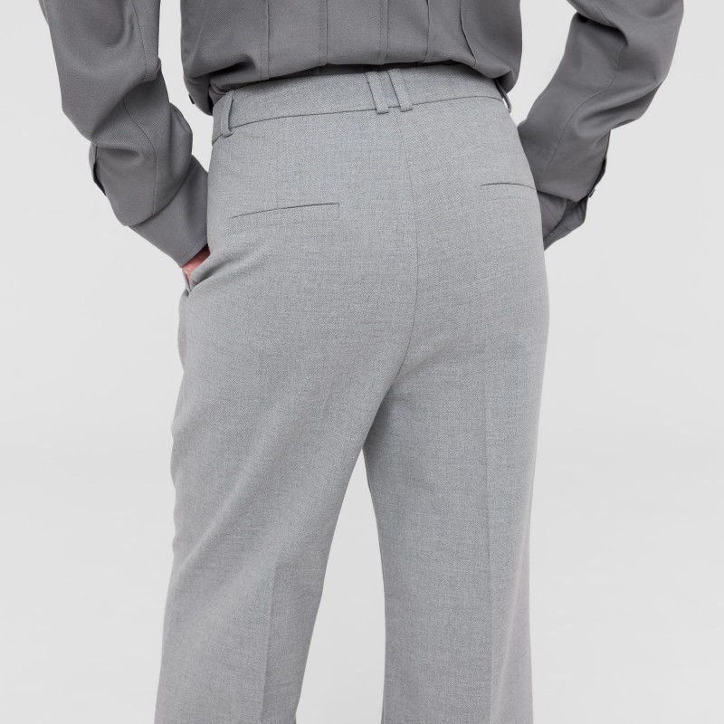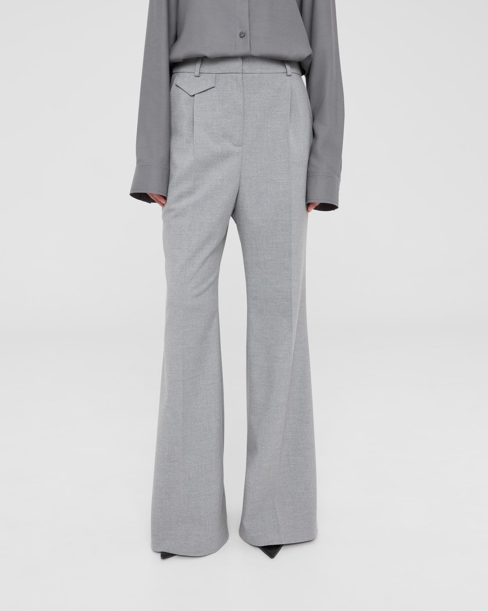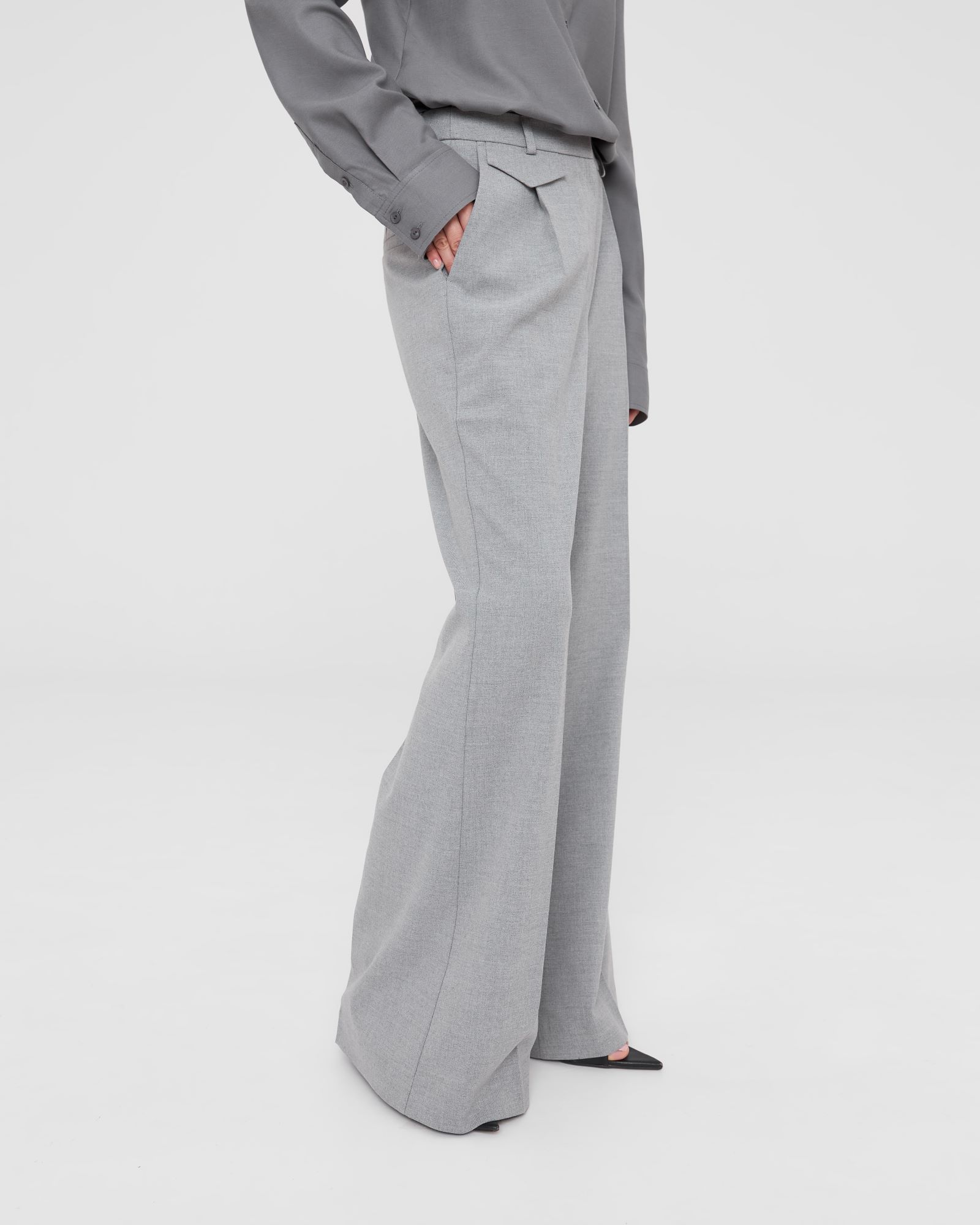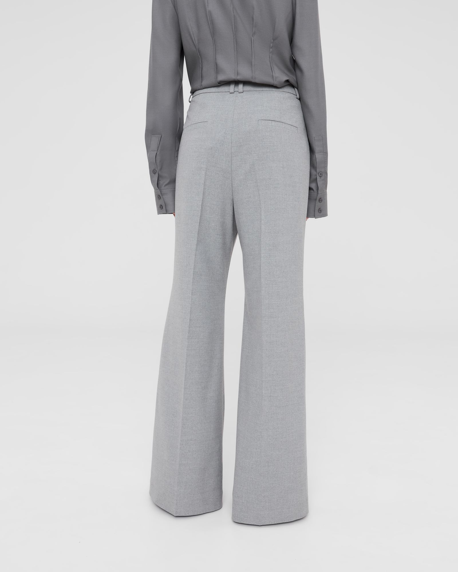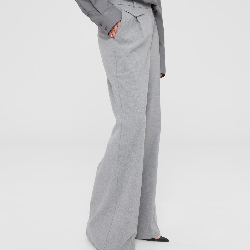 Брюки–клёш из коллекции «FLOREALE» представляют собой гармоничное сочетание традиционной классики и духа свободы. Такую модель брюк можно назвать олицетворением вольного делового стиля. Изделие на заниженной посадке имеет защипы для создания легкого объёма до колена и ненавязчивое расклешение от колена. На широком поясе со стрелками расположены шлевки для ремня и декоративный клапан. Брюки–клёш имеют глубокие боковые карманы и карманы-обманки на задней части изделия. Углубленная высота сидения позволяет зафиксировать брюки на талии ремнем.Наиболее ярко модель брюк раскрывается в тандеме с жакетом SLIM-FIT.