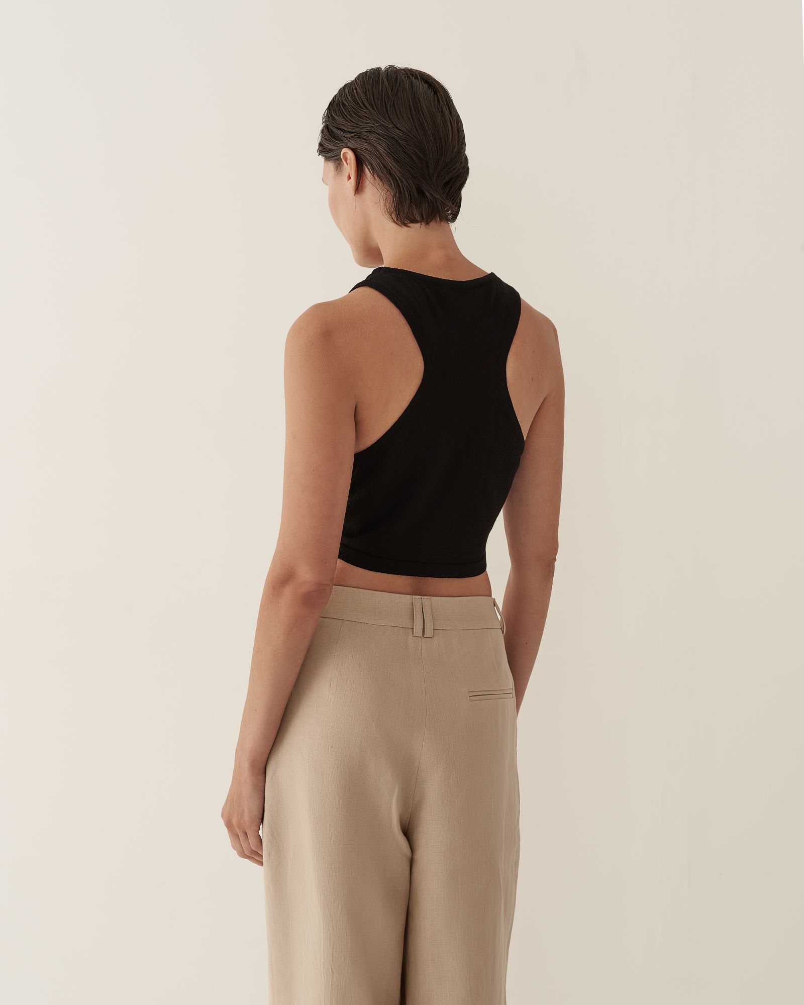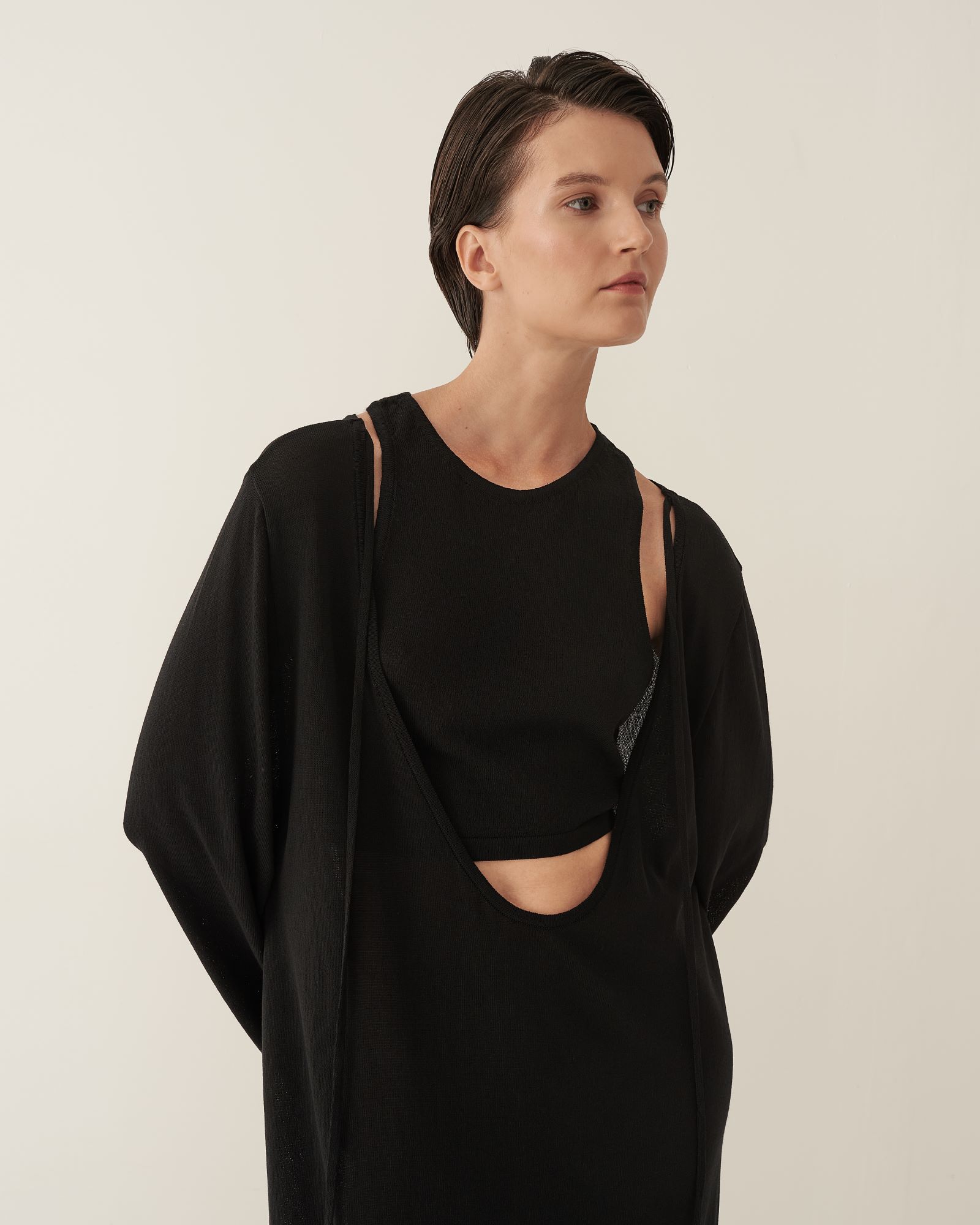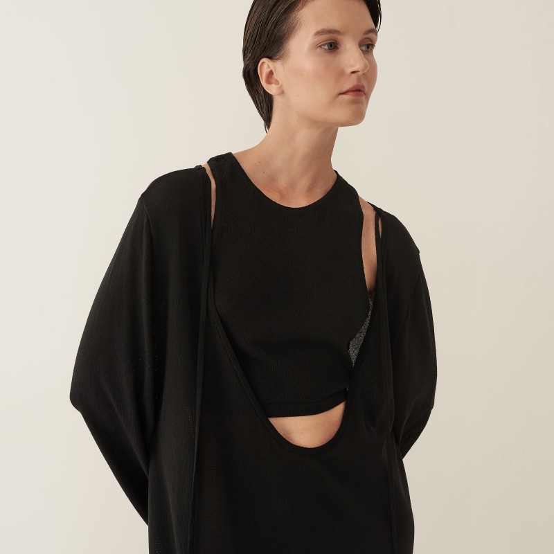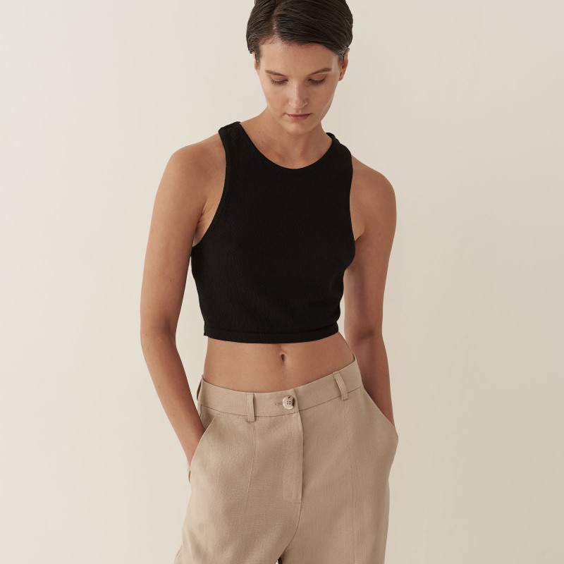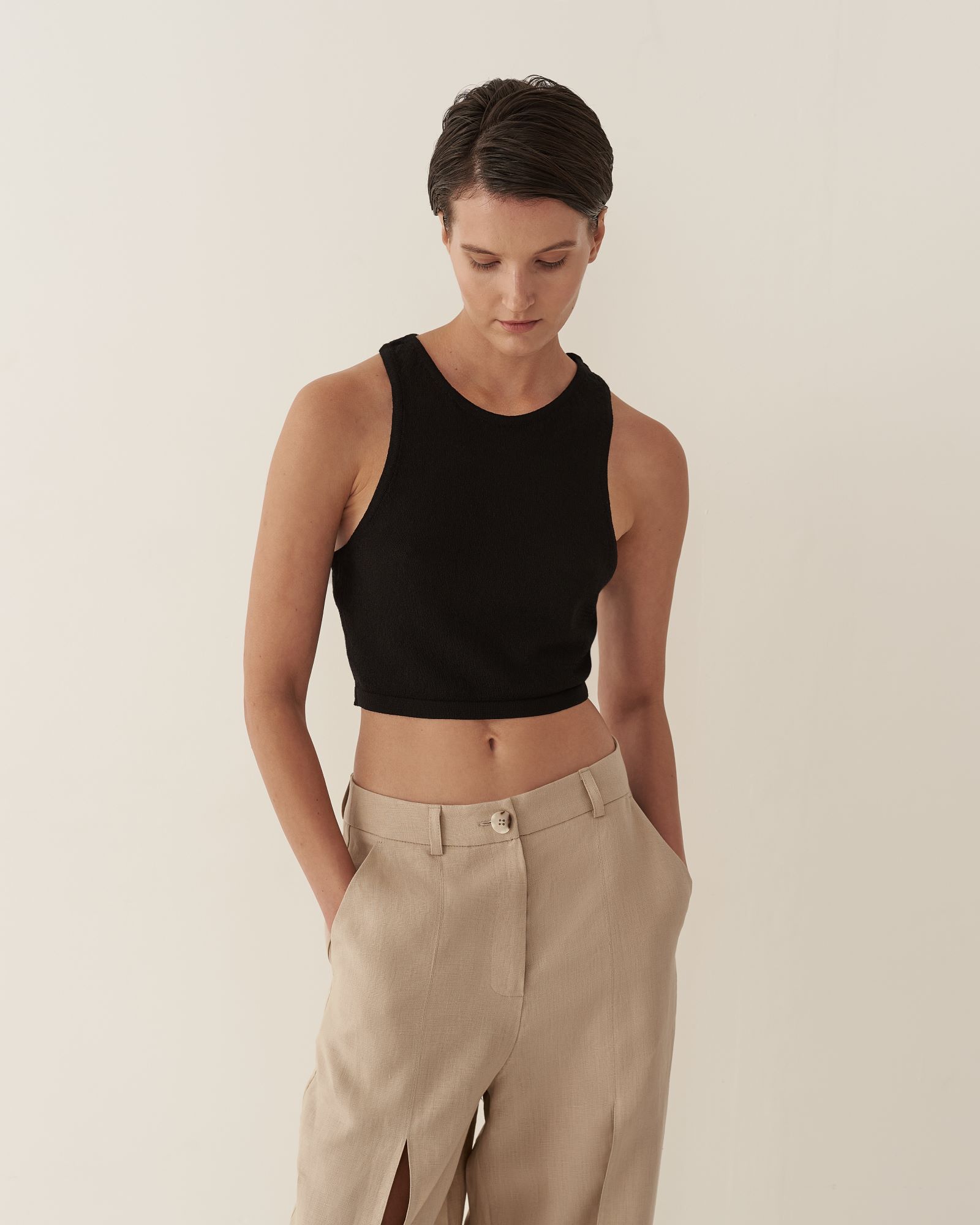 Кроп-топ из тонкого трикотажа предлагается как партнер к платью длины макси с глубоким вырезом или самостоятельное изделие. Топ имеет глубокую пройму на спинке изделия, подчеркивая красоту женского стана. Благодаря исполнению из тонкого трикотажа, топ создает ощущение невесомой второй кожи.