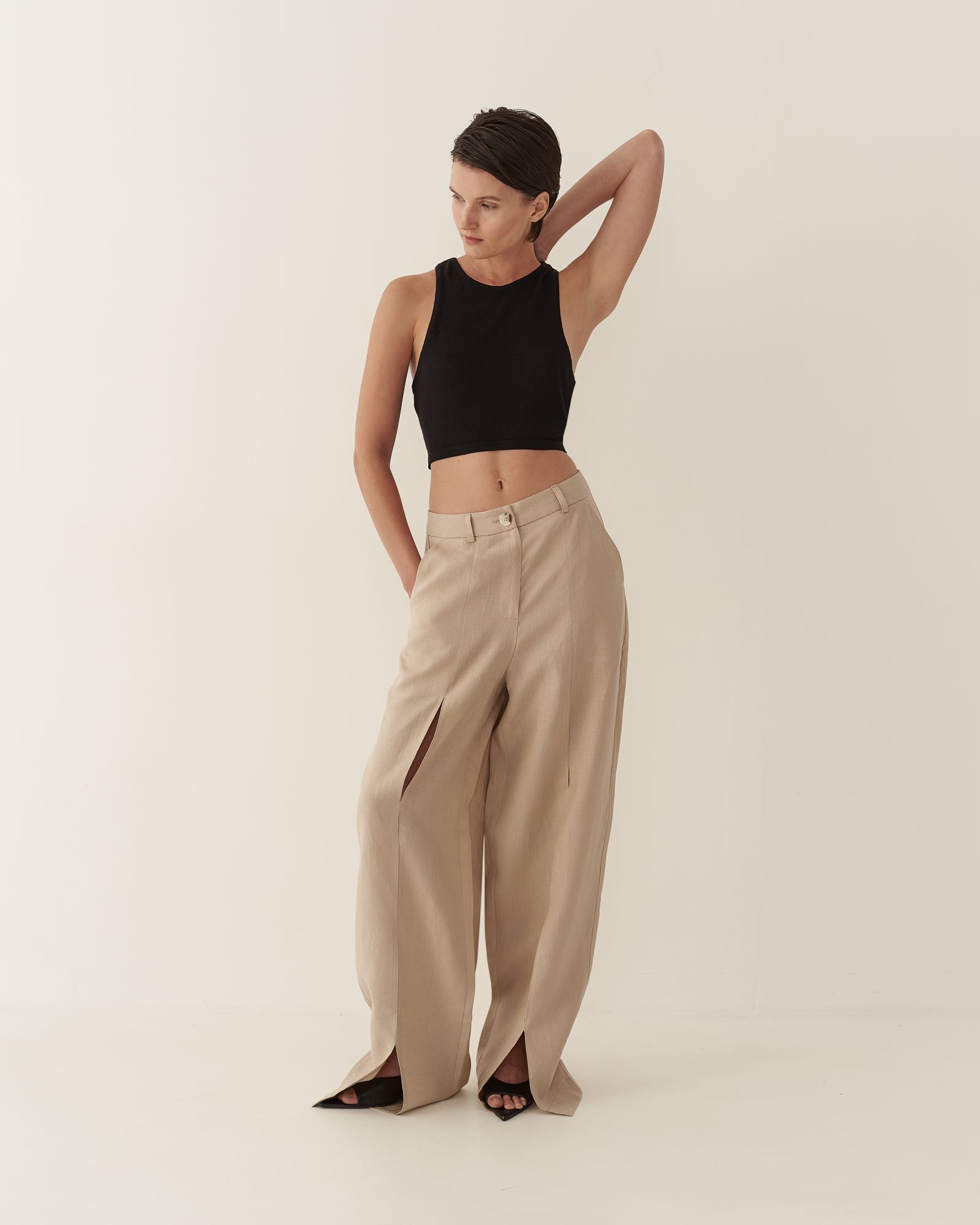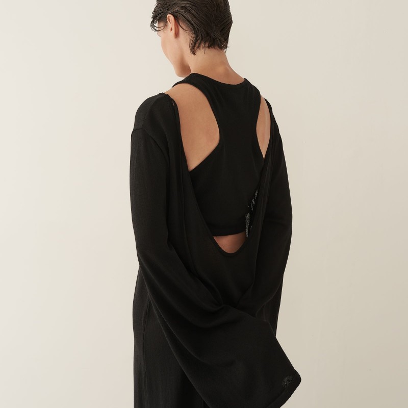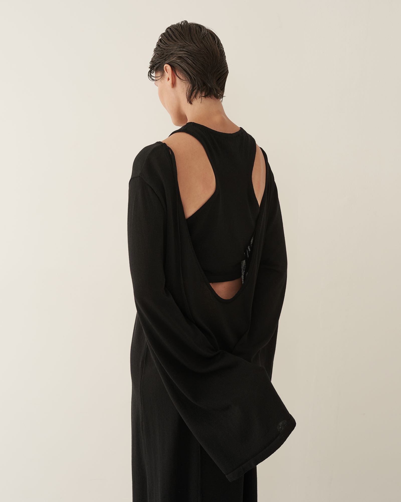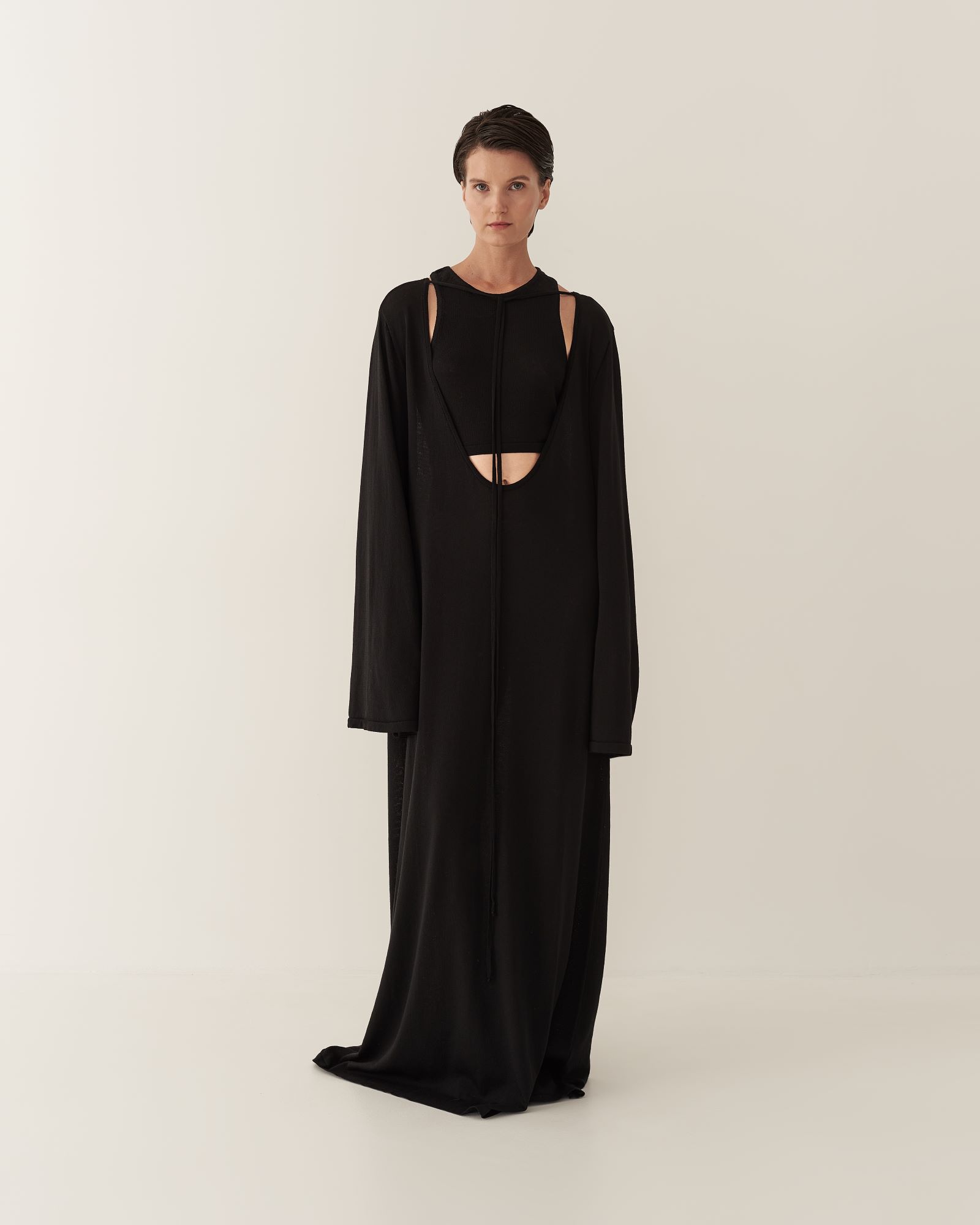 Кроп-топ из тонкого трикотажа предлагается как партнер к платью длины макси с глубоким вырезом или самостоятельное изделие. Топ имеет глубокую пройму на спинке изделия, подчеркивая красоту женского стана. Благодаря исполнению из тонкого трикотажа, топ создает ощущение невесомой второй кожи.