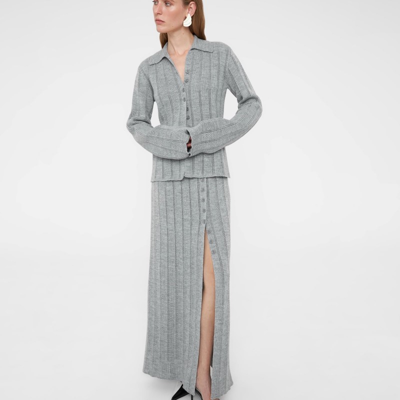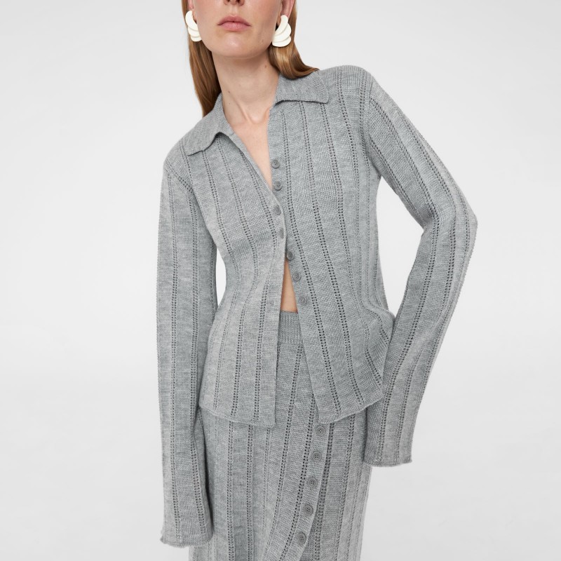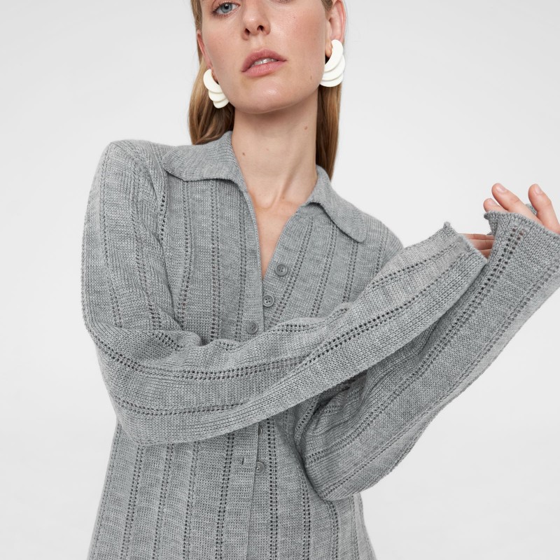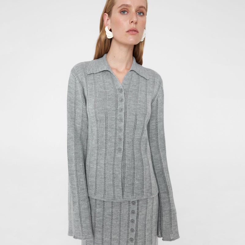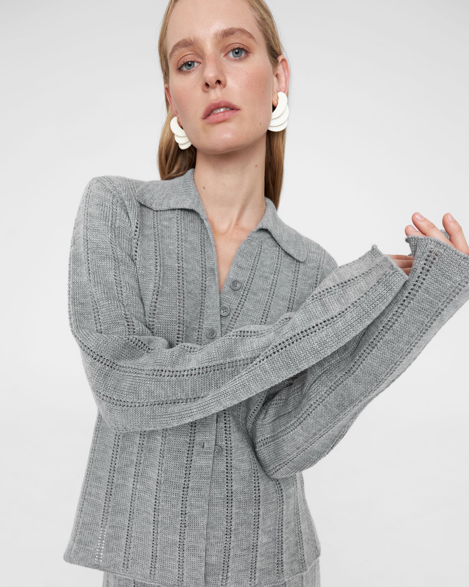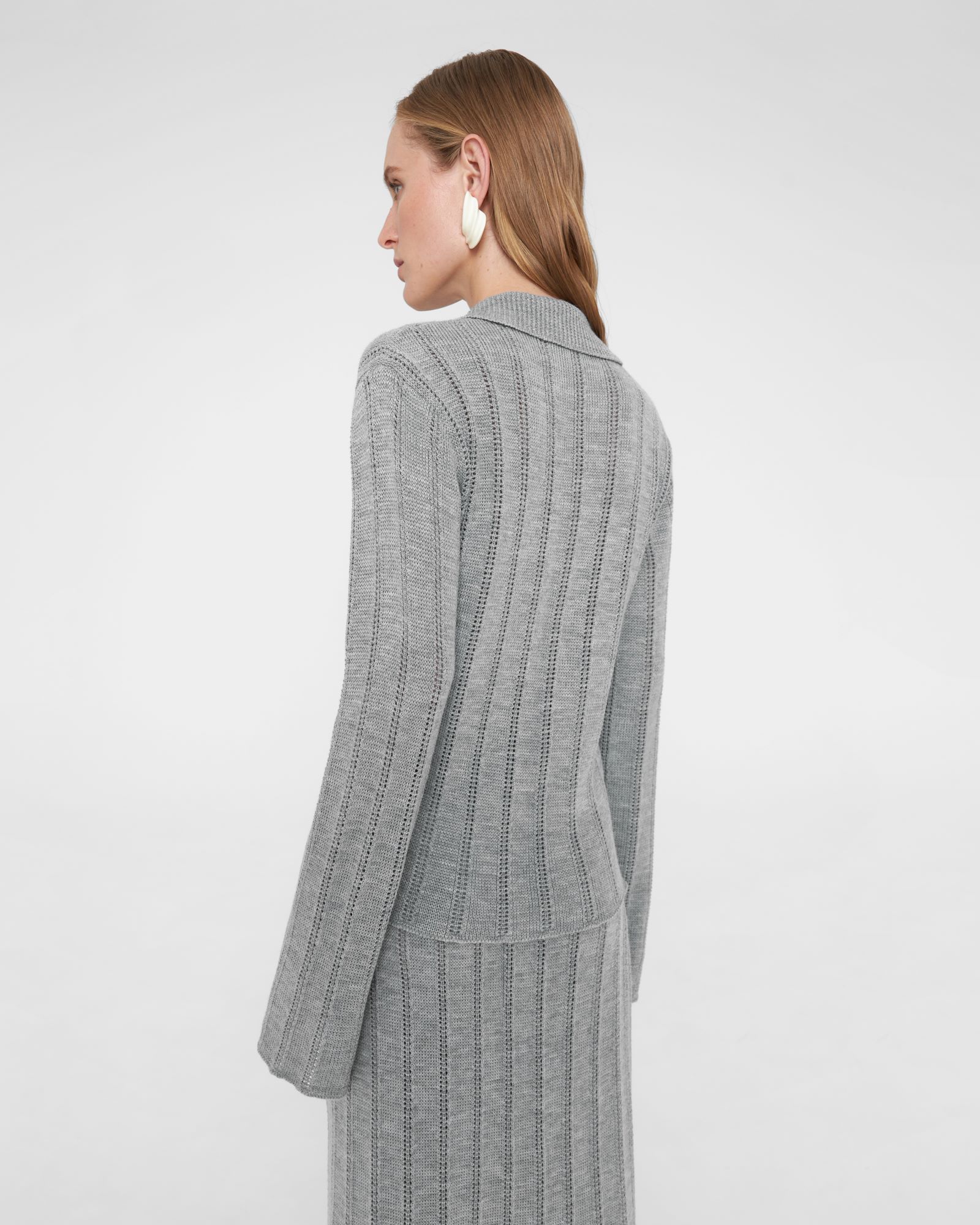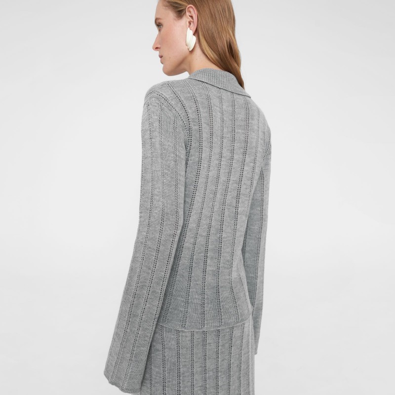 Кроп – жакет «кроше» представляет собой союз комфорта и декоративности, а именно плавных женственных линии и трикотажноого полотна с шерстью мериноса в составе. Изделие имеет полуприталенный силуэт, удлиненные рукава с легким расклешением, лаконичный отложной воротник и застежку на ряд миниатюрных брендированных  пуговиц. Ритмичный рисунок из вертикальных полос добавляет изделию рельефность, а светлому серому цвету модели  — полутона. Изделие наиболее полно раскрывается в сочетании с юбкой «кроше» с разрезом.