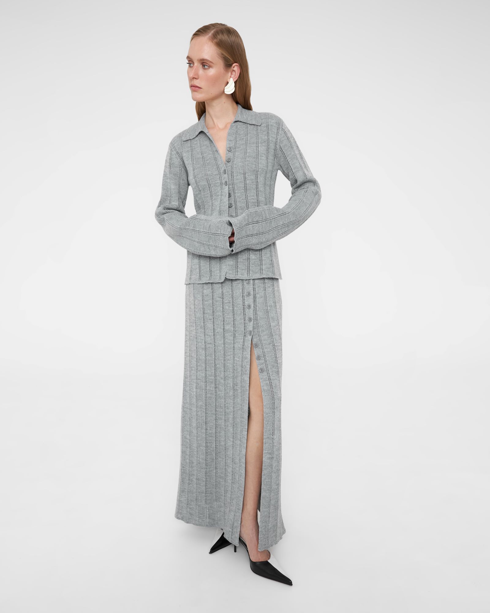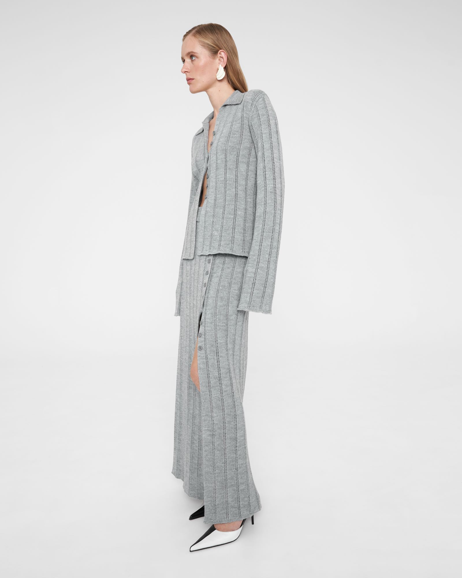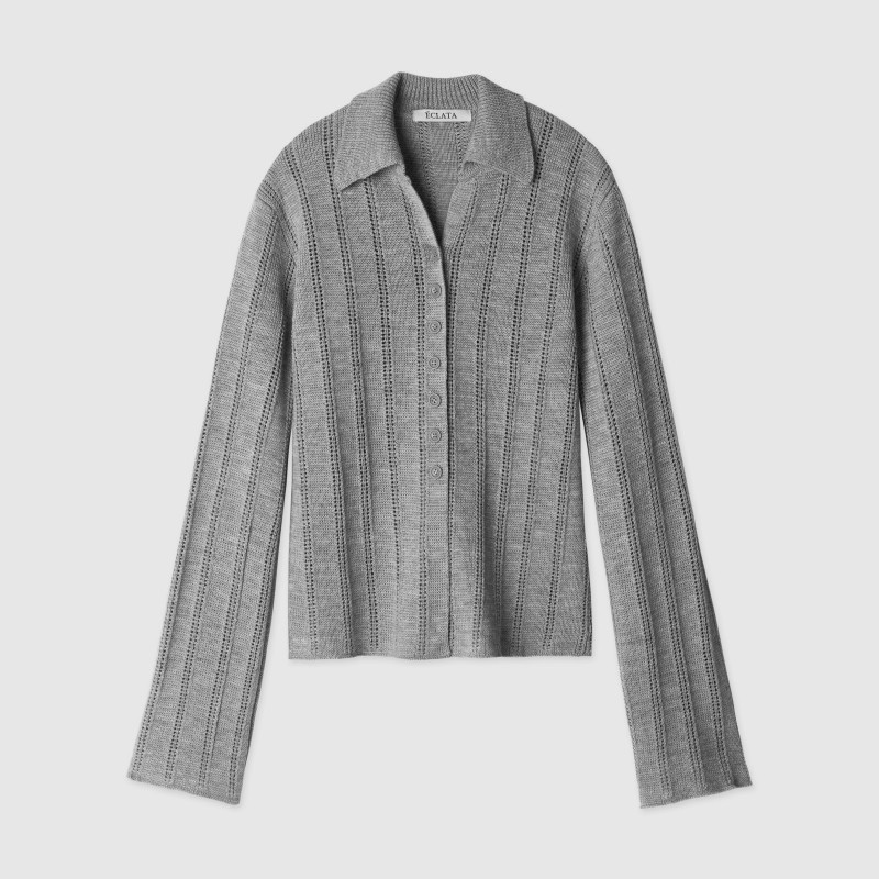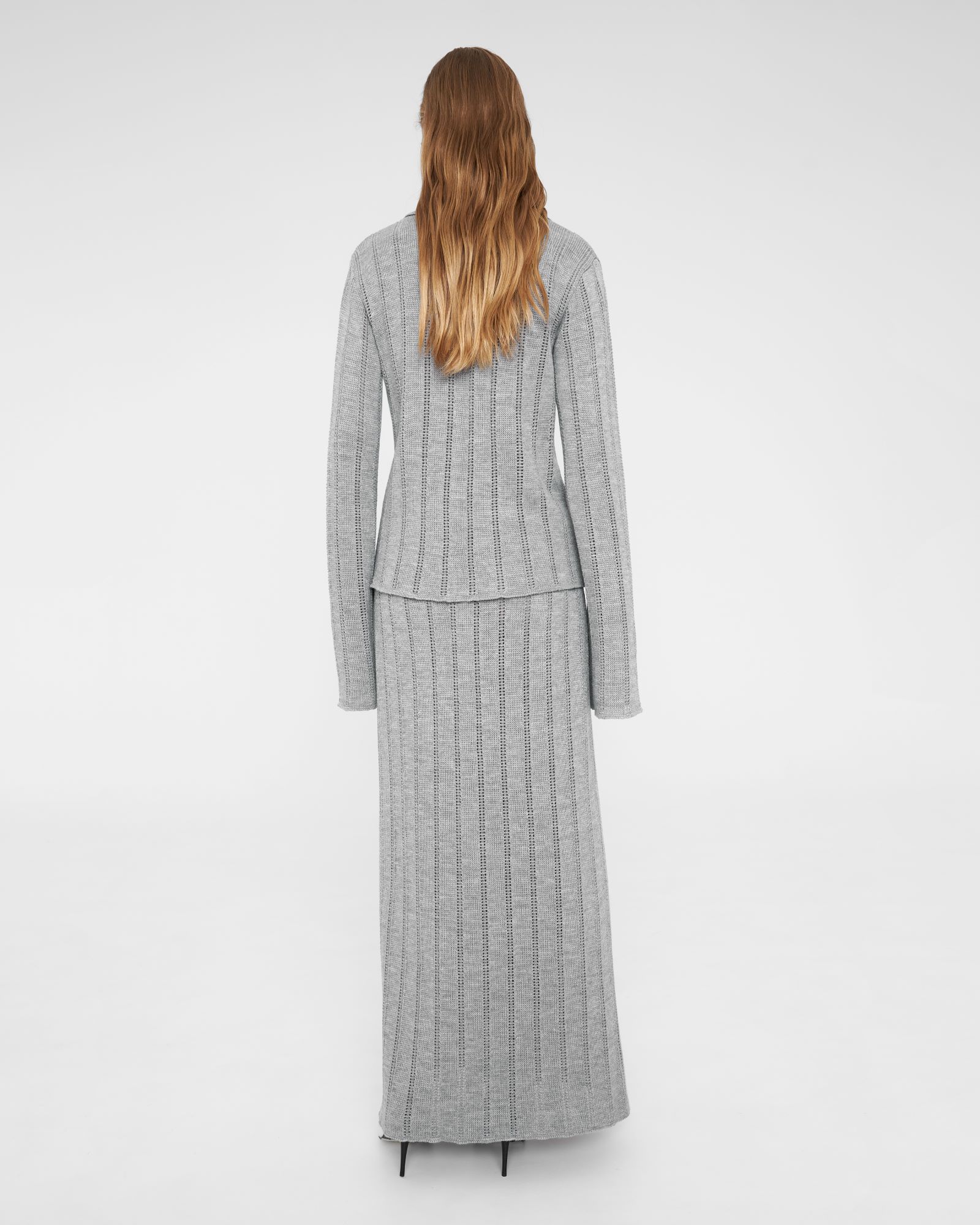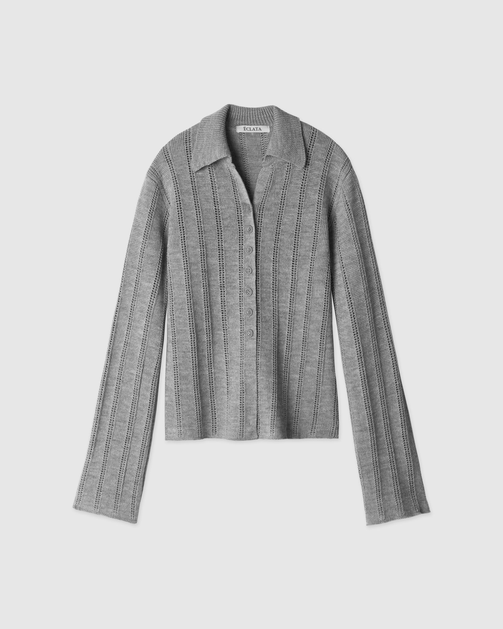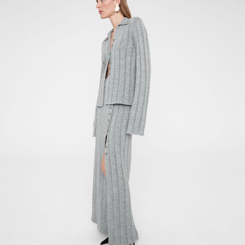 Кроп – жакет «кроше» представляет собой союз комфорта и декоративности, а именно плавных женственных линии и трикотажноого полотна с шерстью мериноса в составе. Изделие имеет полуприталенный силуэт, удлиненные рукава с легким расклешением, лаконичный отложной воротник и застежку на ряд миниатюрных брендированных  пуговиц. Ритмичный рисунок из вертикальных полос добавляет изделию рельефность, а светлому серому цвету модели  — полутона. Изделие наиболее полно раскрывается в сочетании с юбкой «кроше» с разрезом.