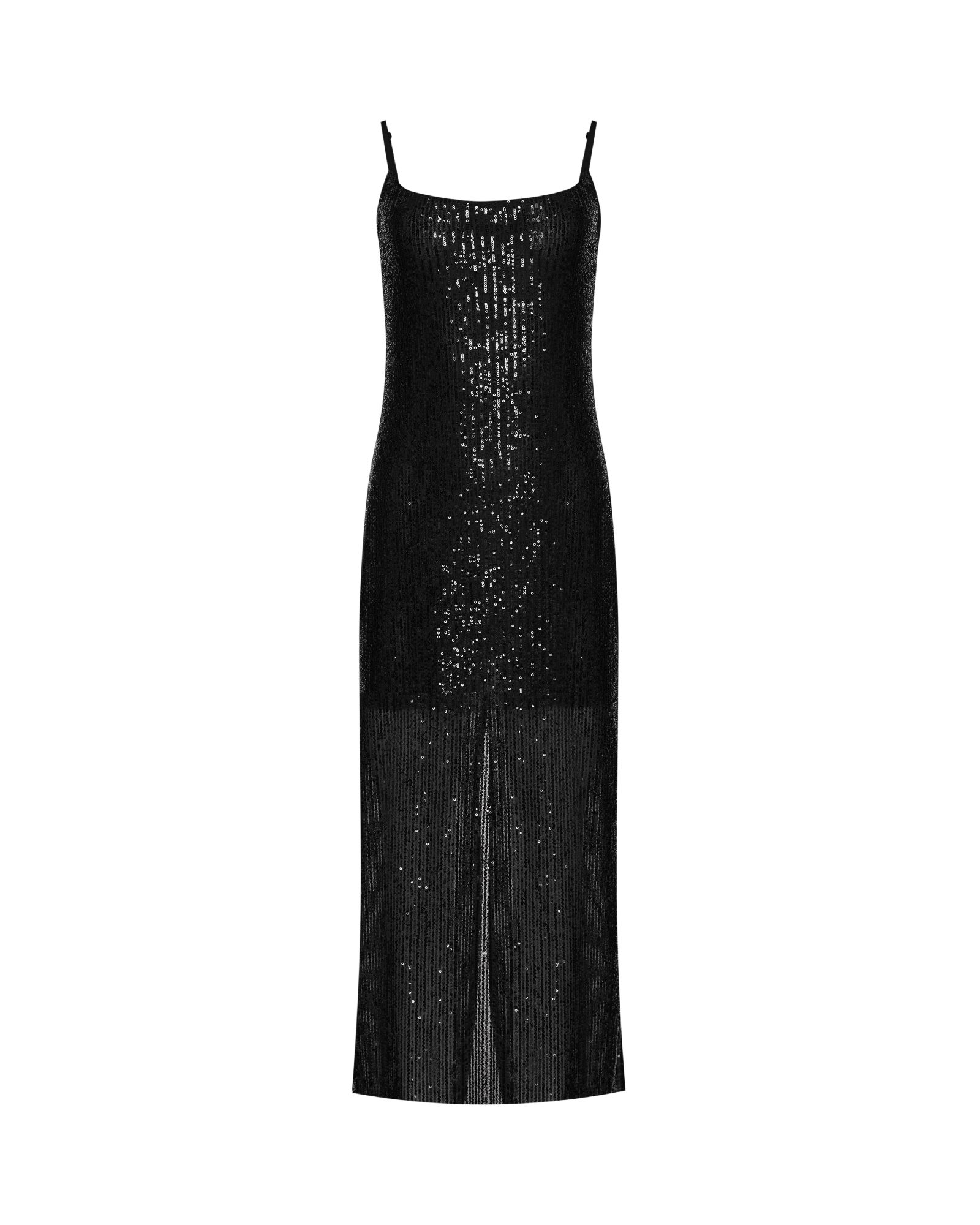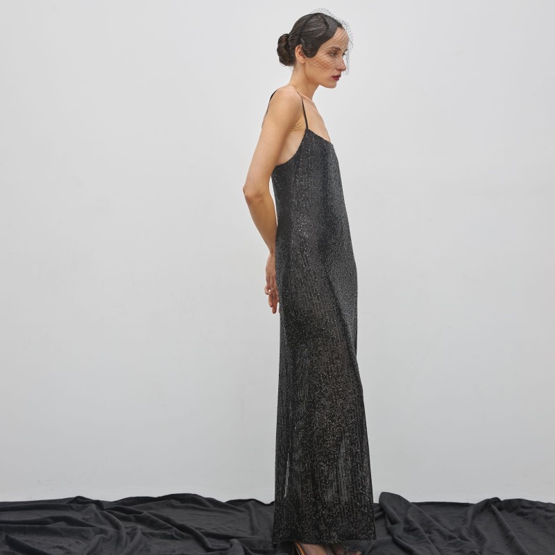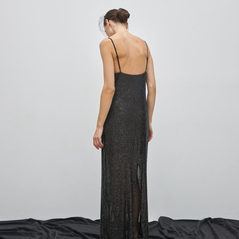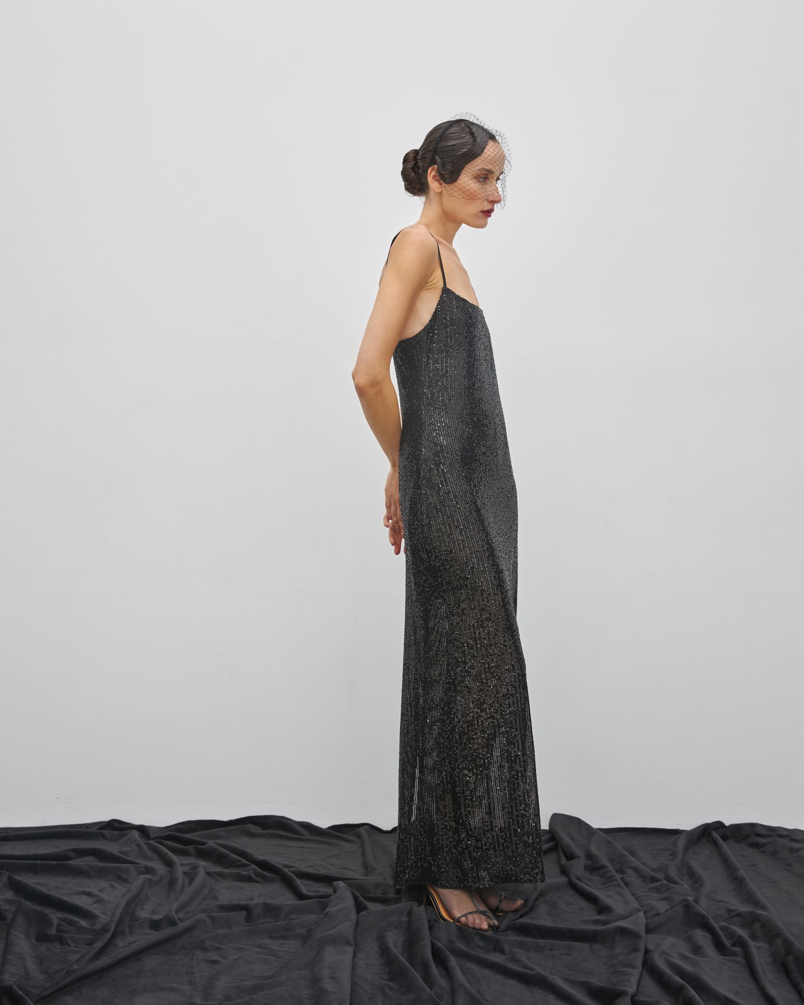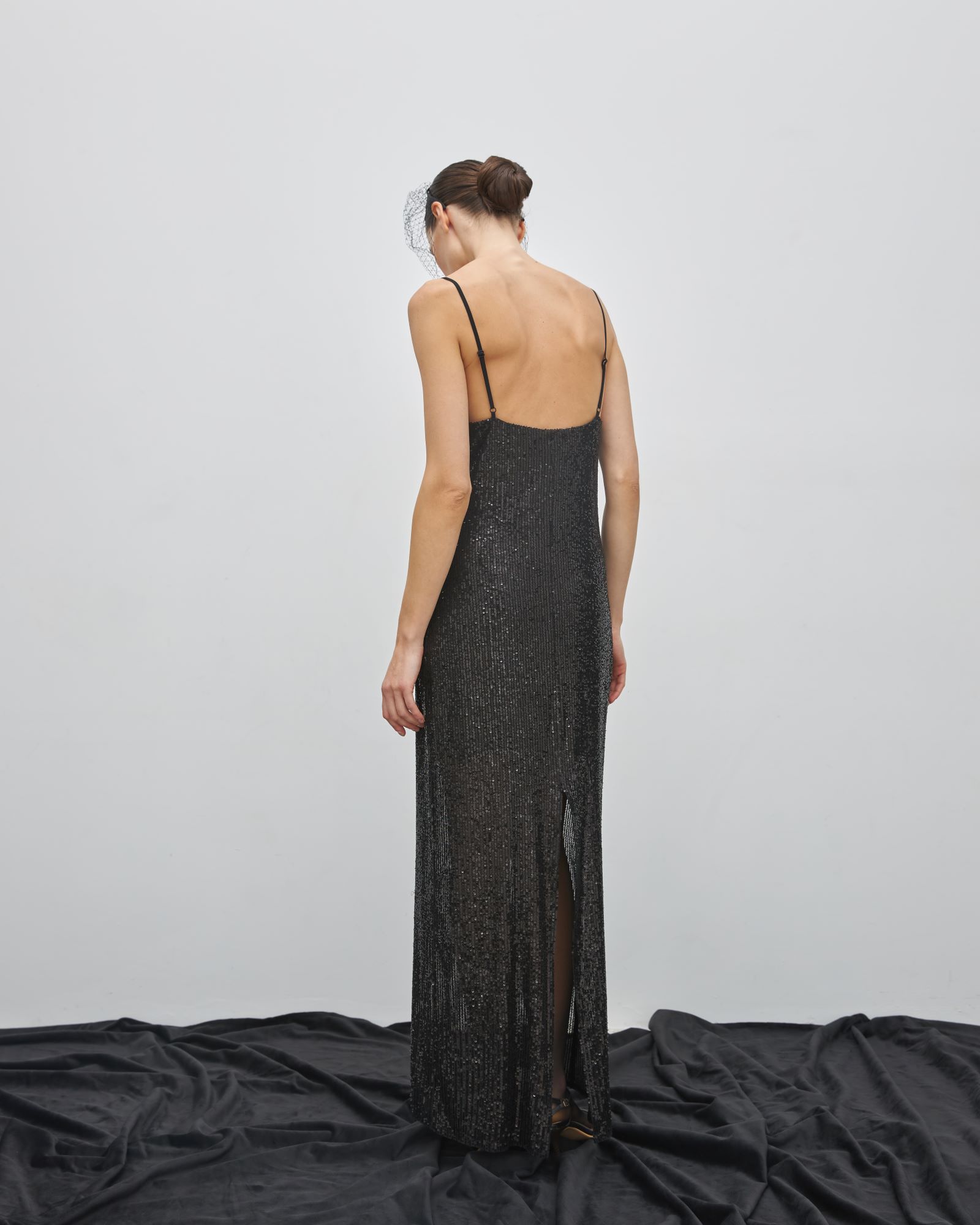 Платье длины макси из матовых пайеток с деликатным блеском имеет подклад из мягкой сетки и разрез на