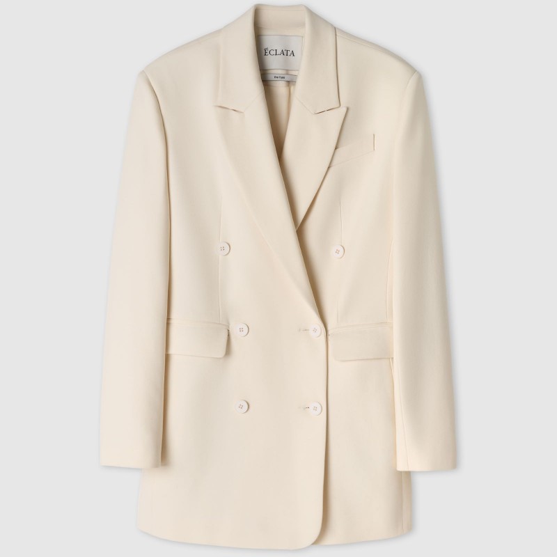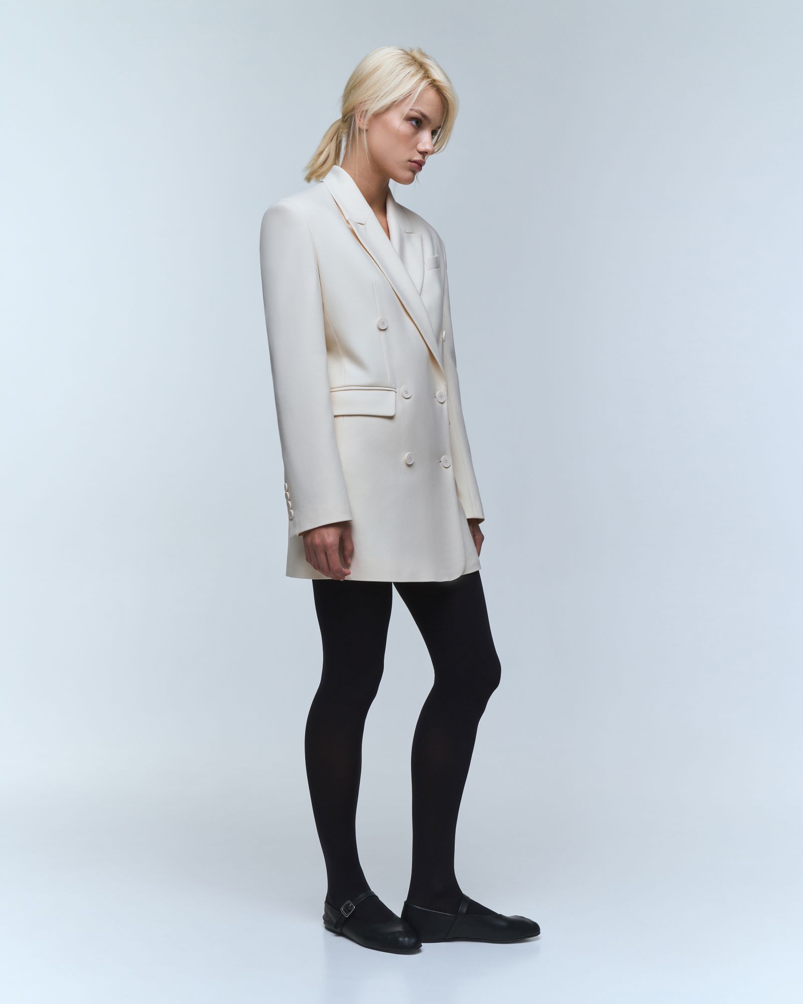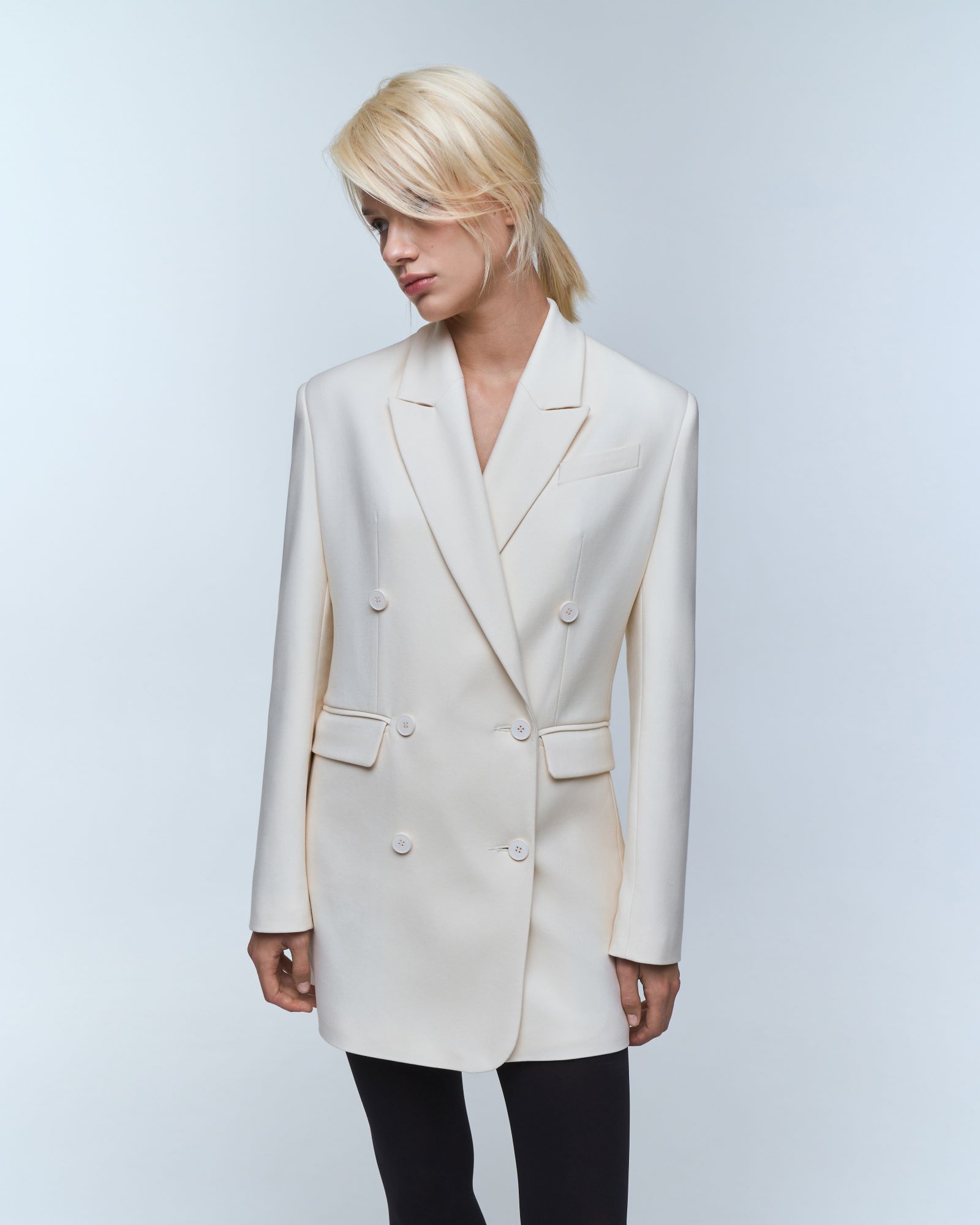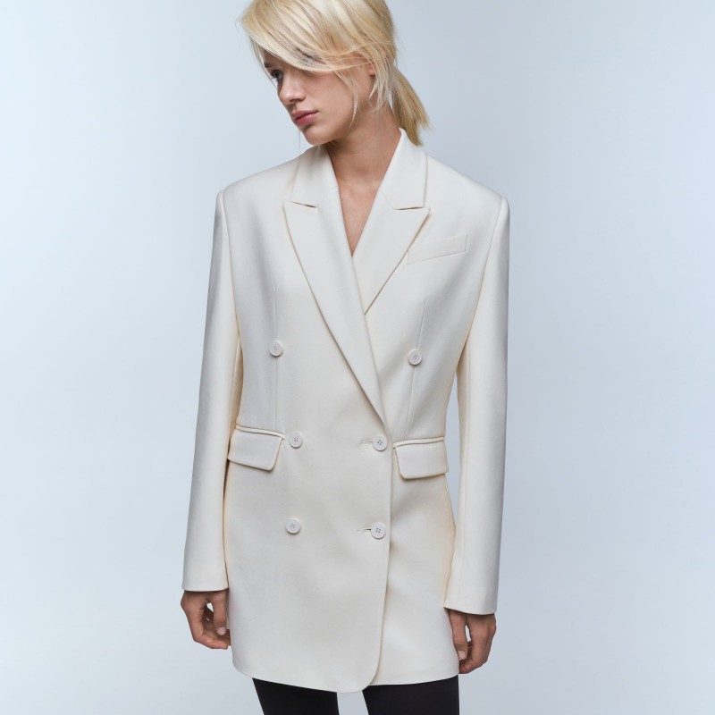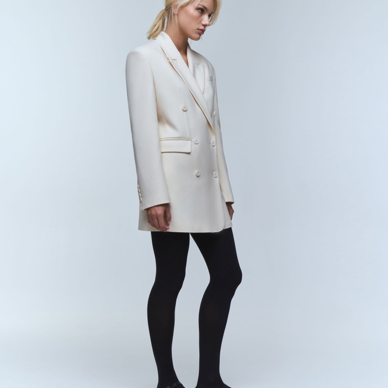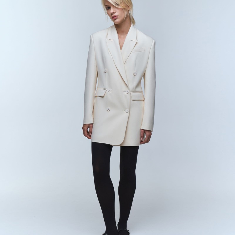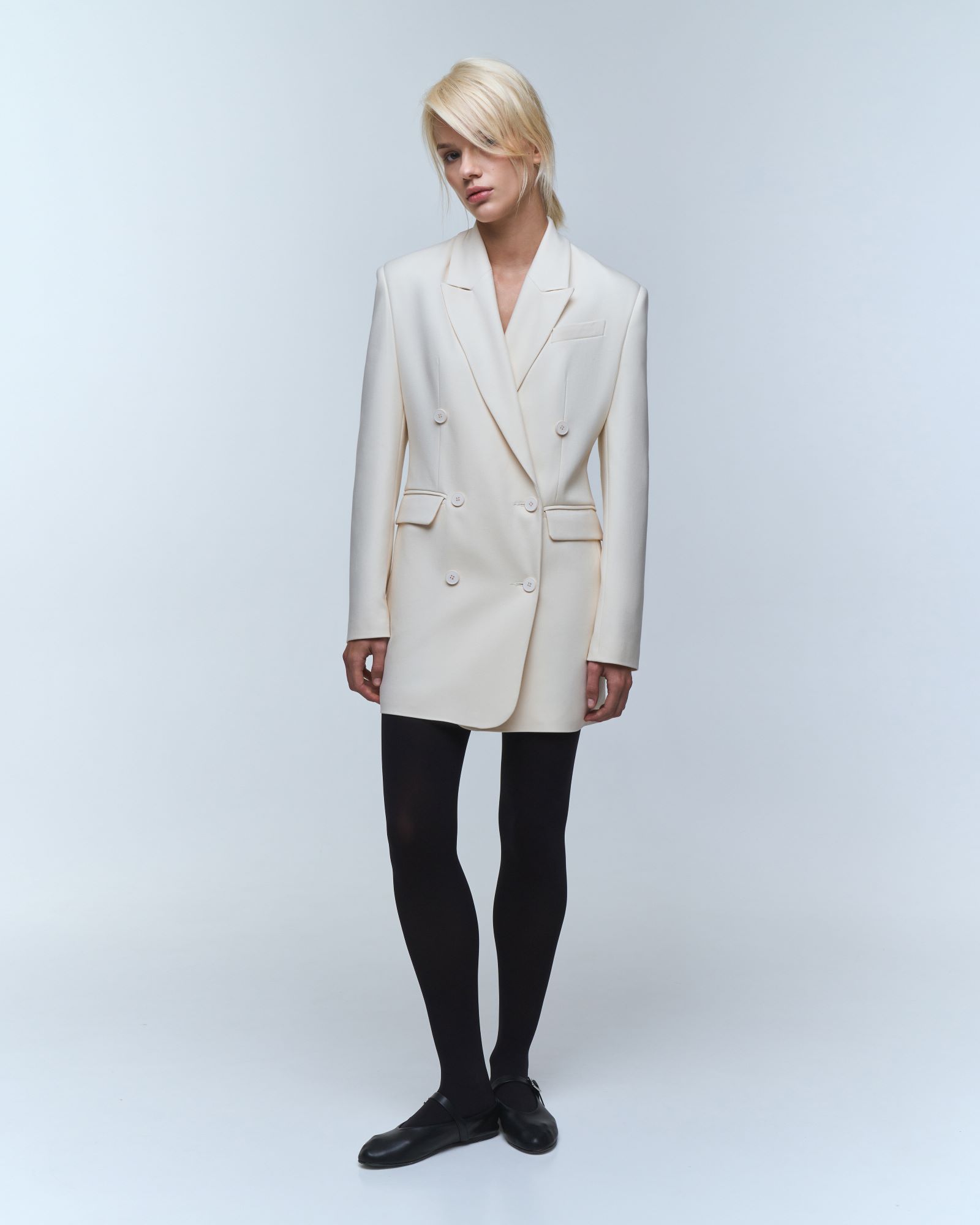 Платье - жакет длины мини имеет трапециевидный силуэт, который мягко акцентирует внимание на талию.  Двубортная модель пиджака – платья имеет два прорезных кармана с клапанами, нагрудный карман, английский воротник и шлицу с рядом пуговиц на рукаве.