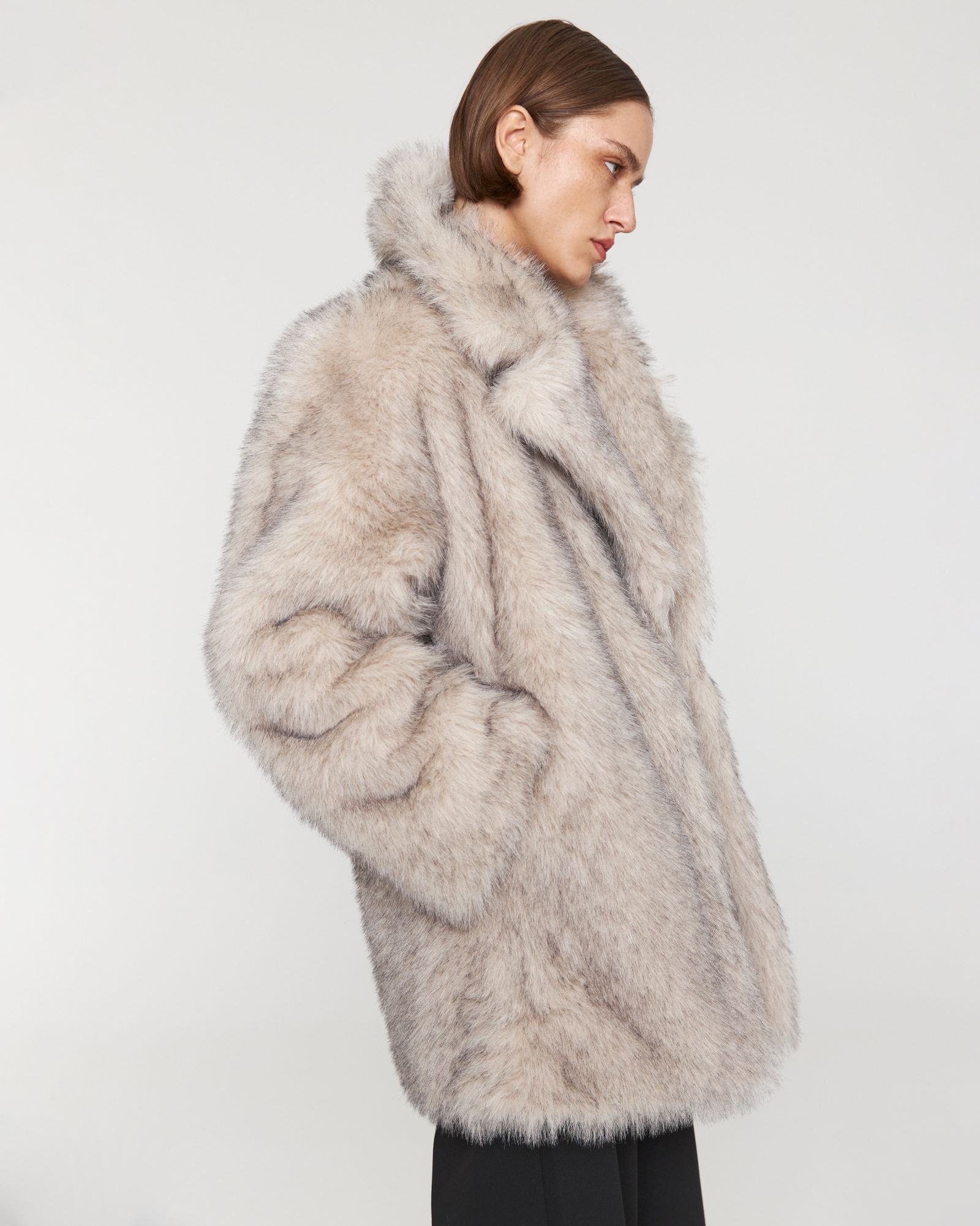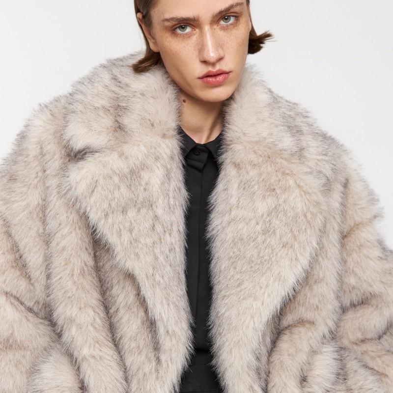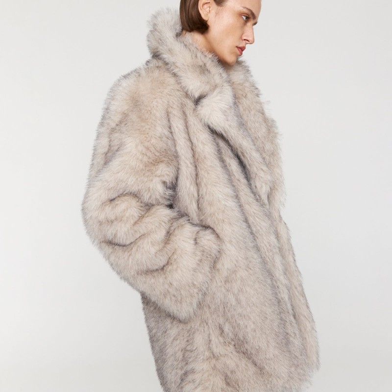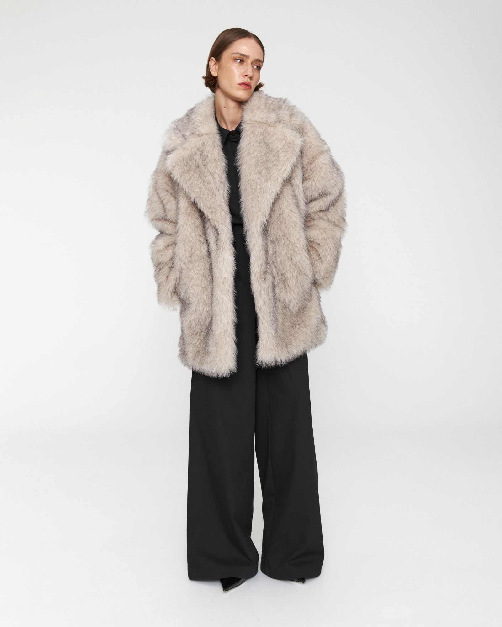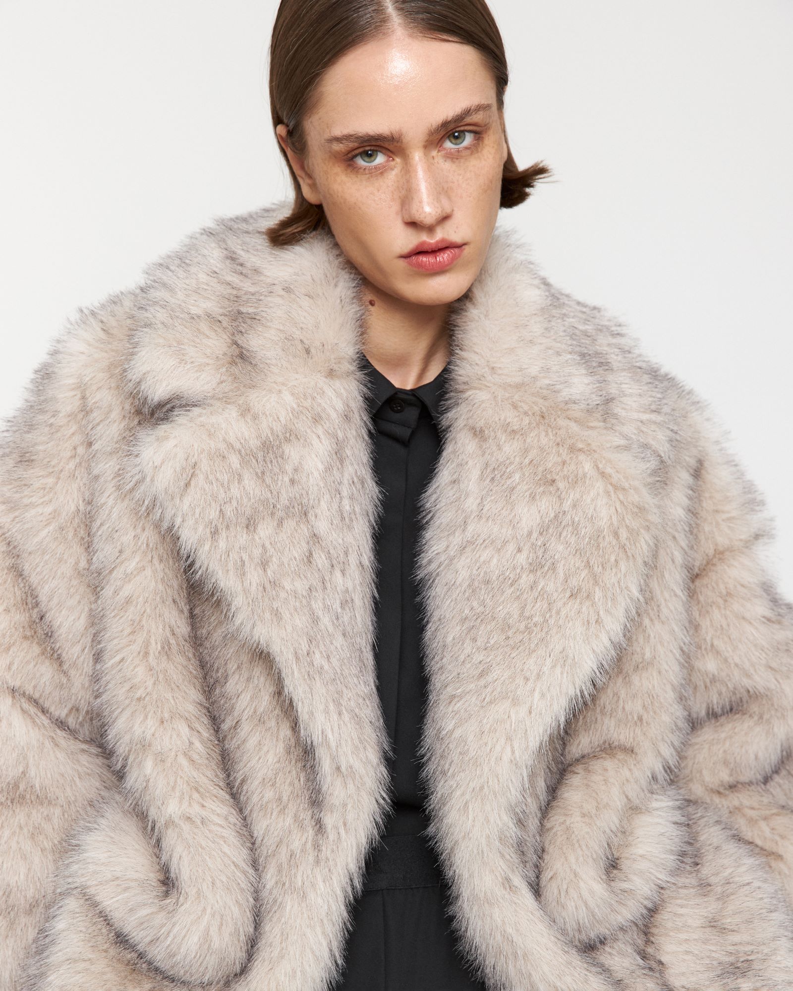 носке. Шуба прямого кроя с эффектом под песца имеет широкий английский воротник,
