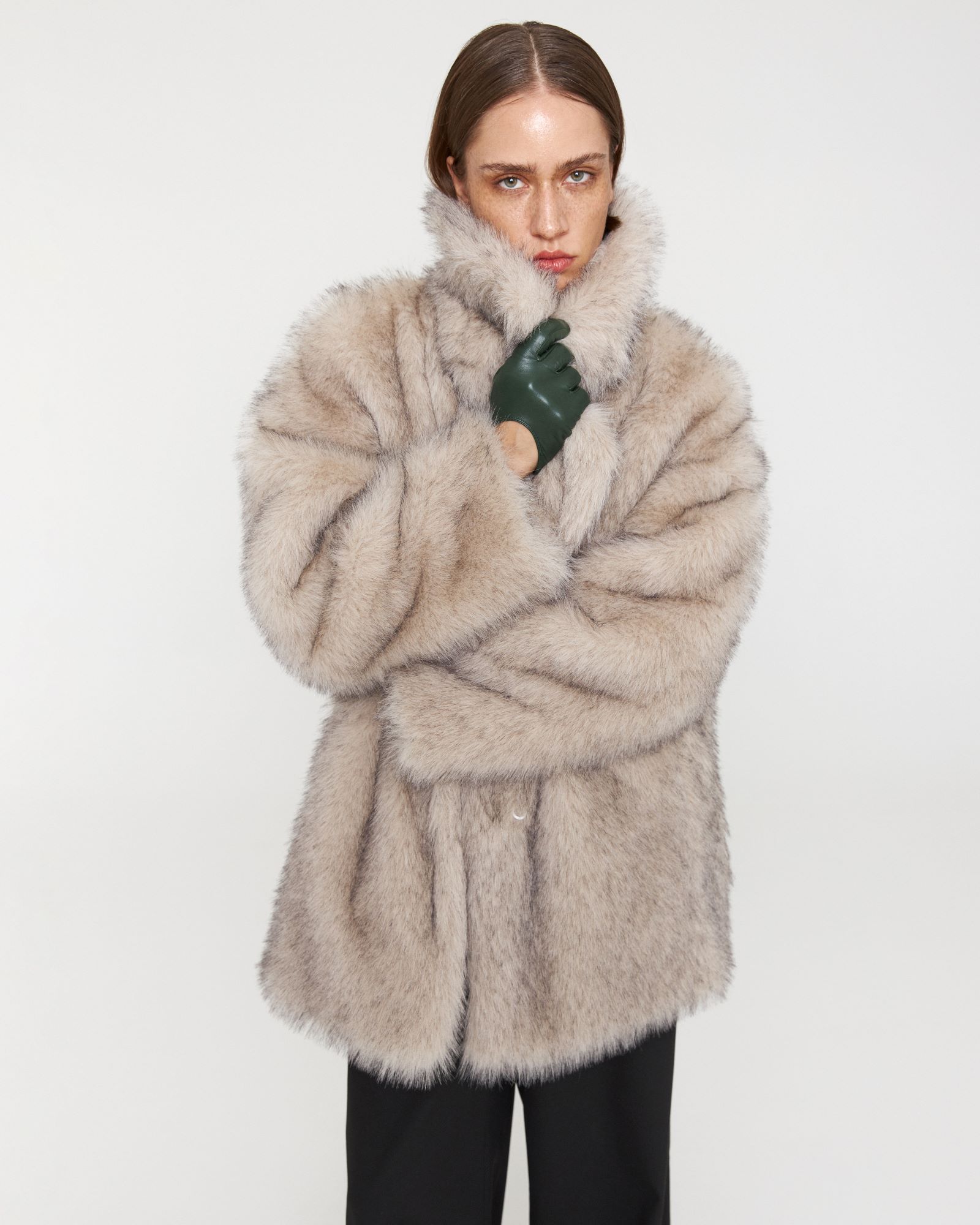 Шуба имеет потайную застежку на крючках. В подклад модели установлена ветрозащита и