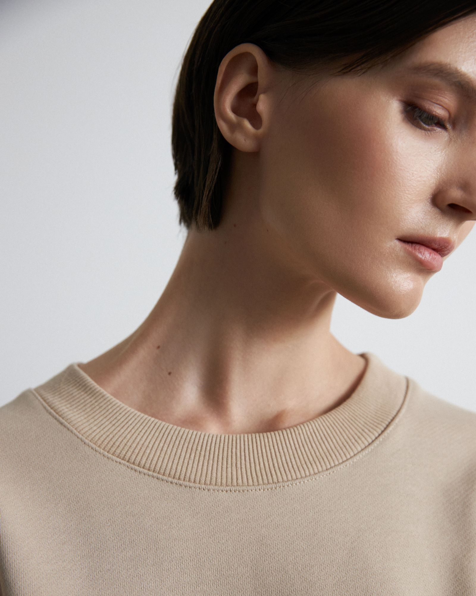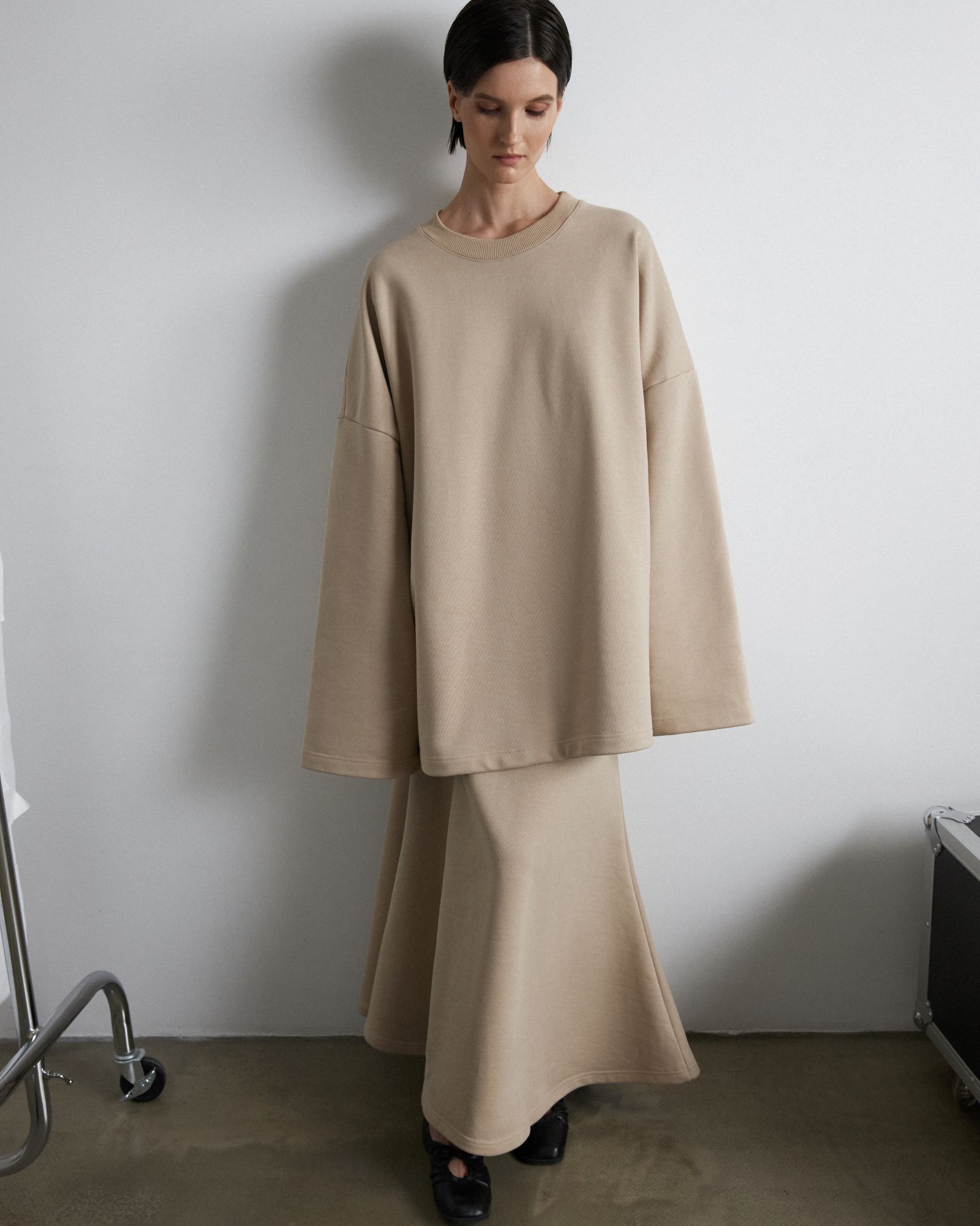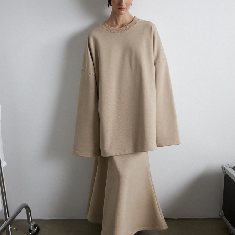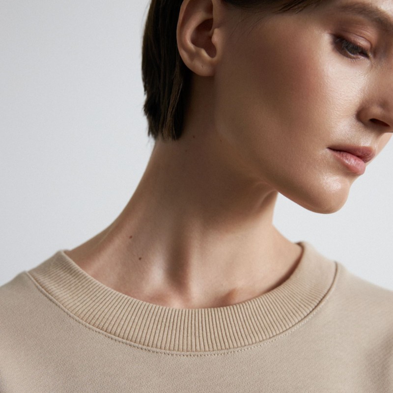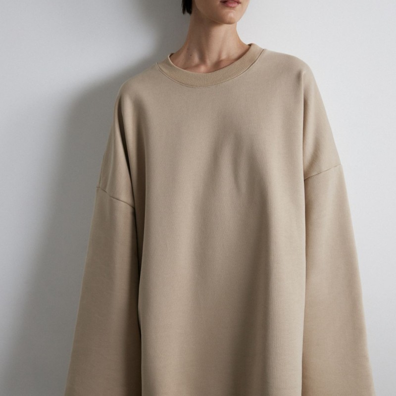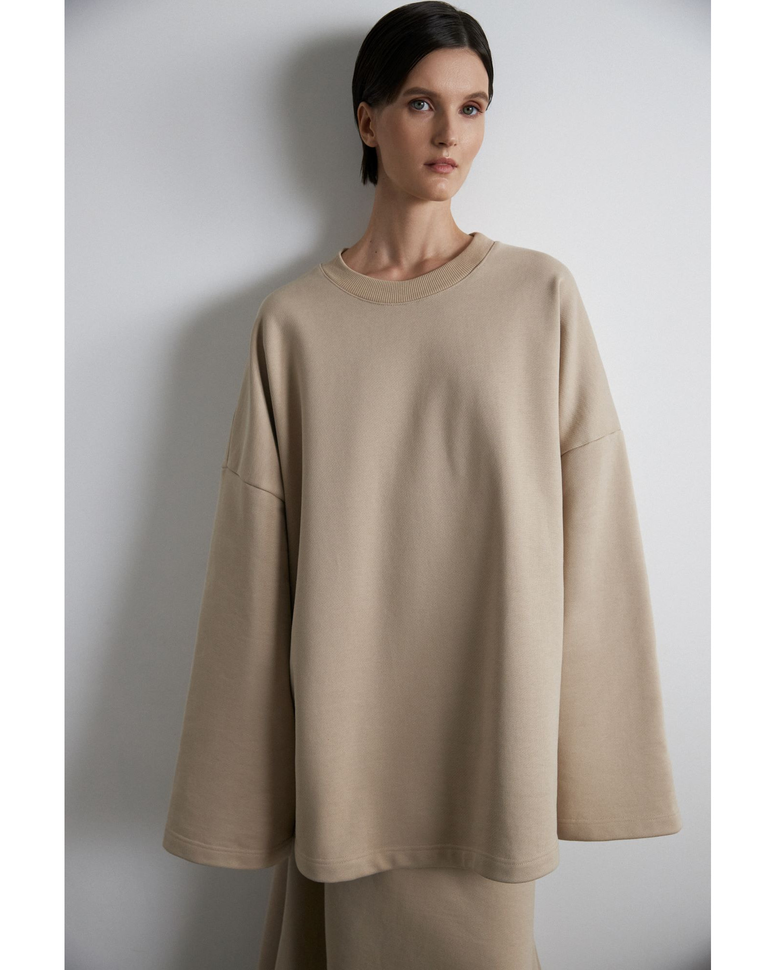Свитшот имеет гипертрофированный объем, который создает то чувство, когда закутался в мягкий любимый плед. Рукава модели имеют увеличенную длину, их можно зафиксировать на внутренней резинке для дополнительного комфорта и создания красивой драпировки.