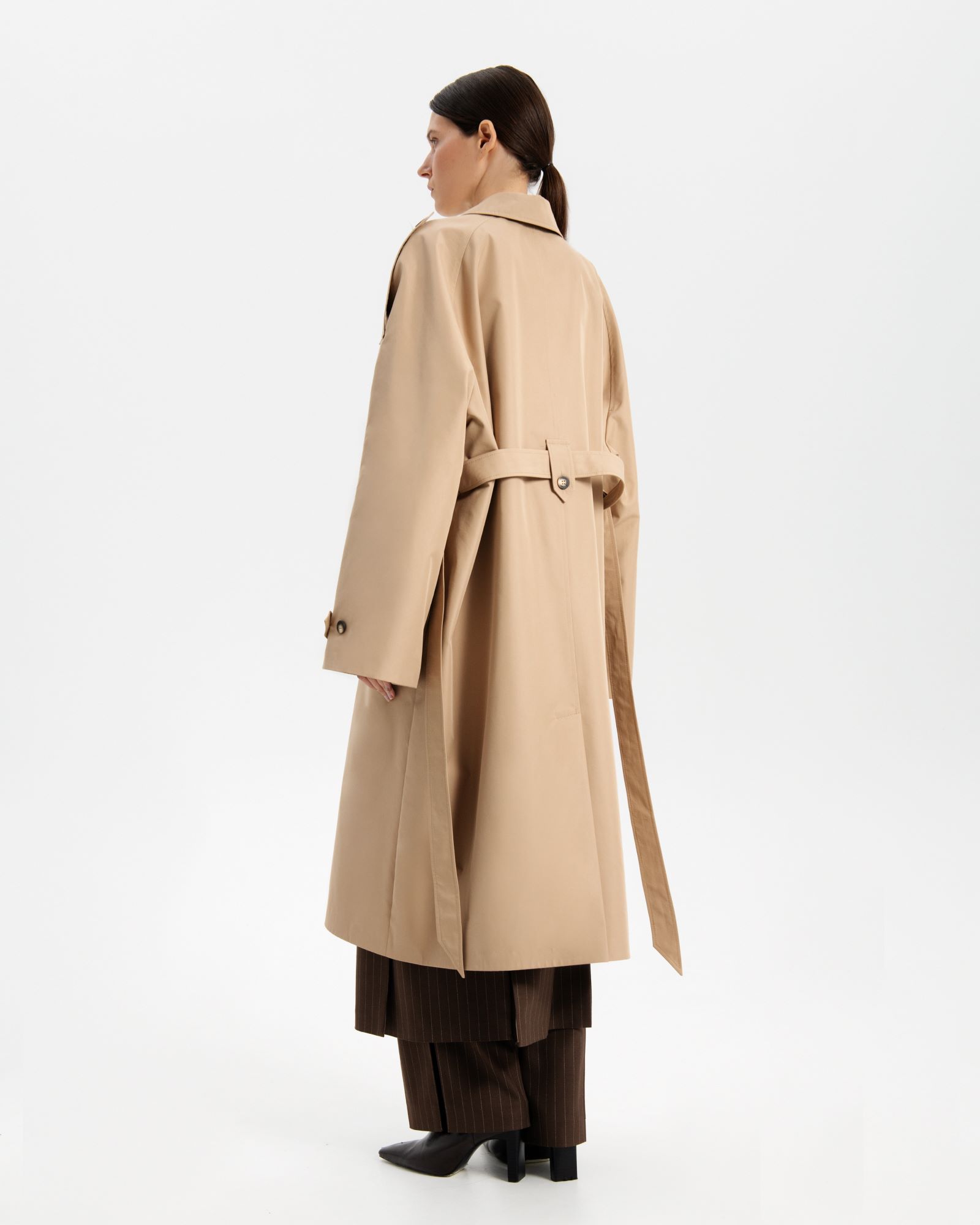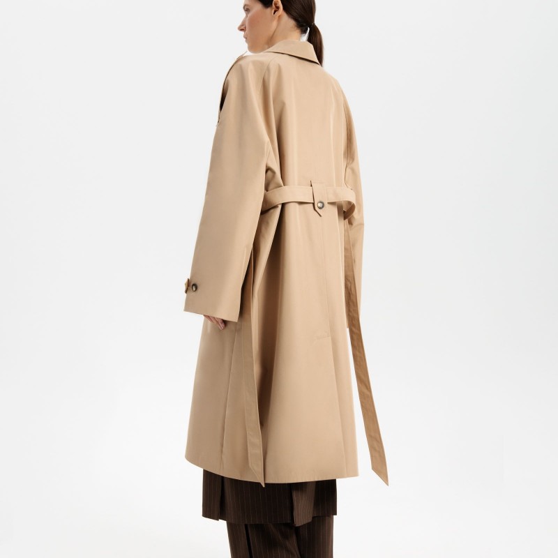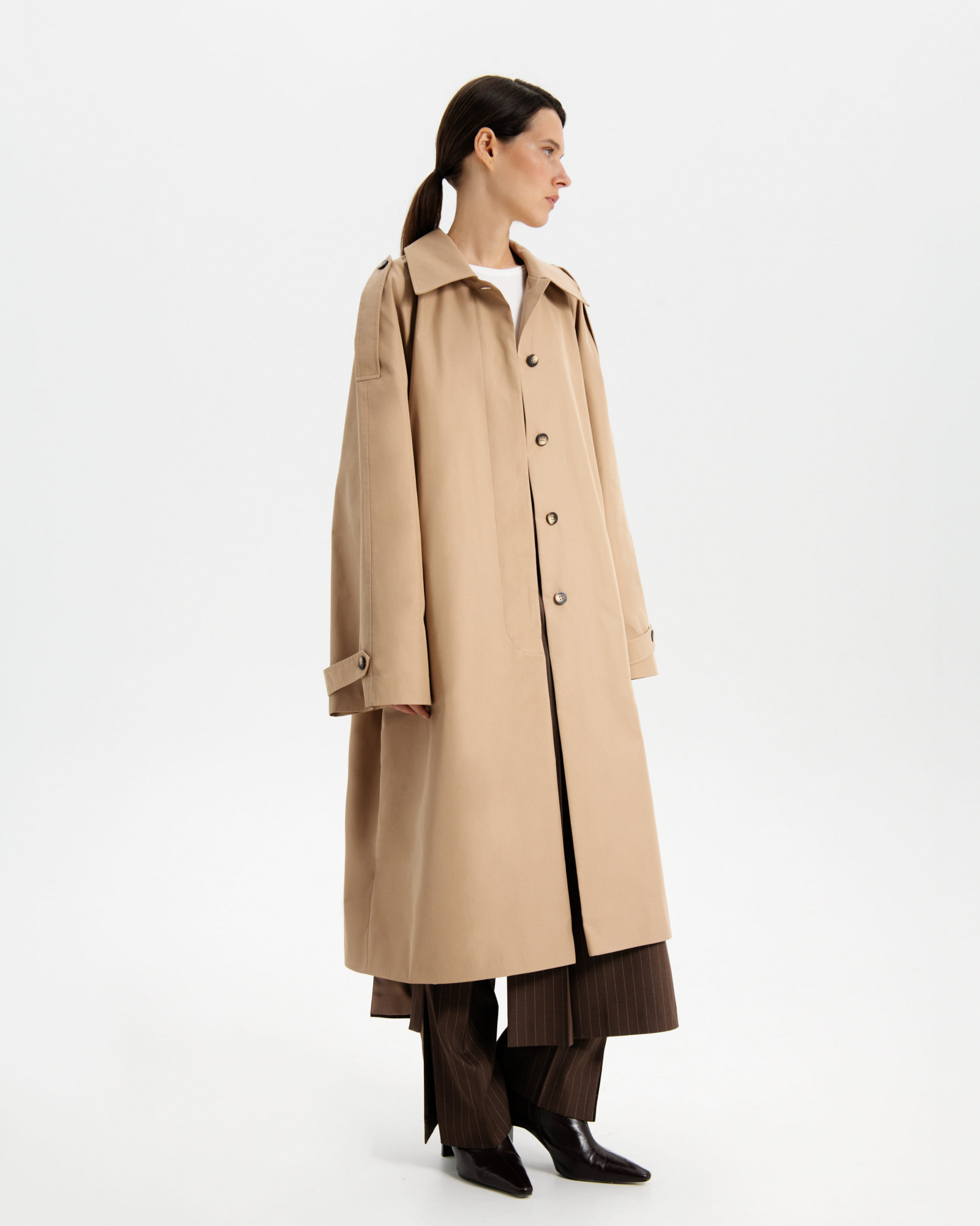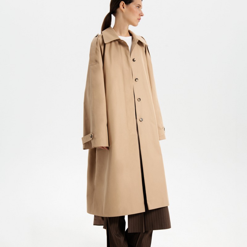 главным героем становится цвет, посадка и материал изделия. Тренч выполнен из хлопка