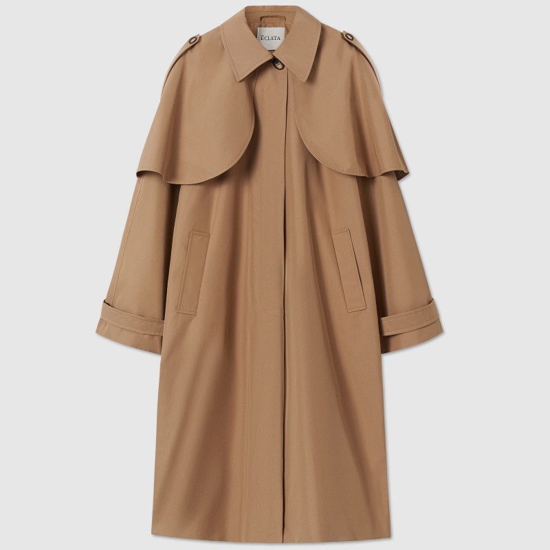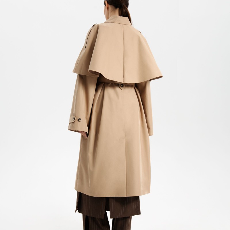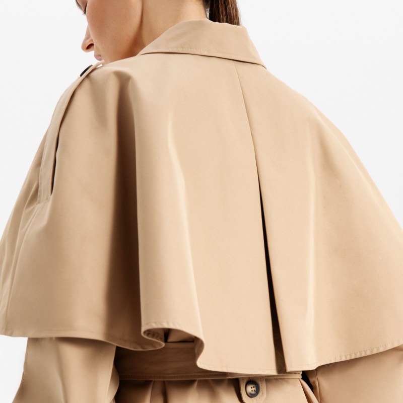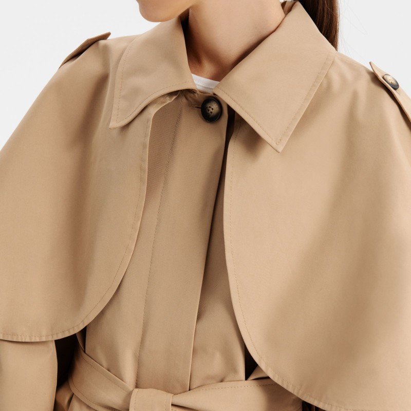 супатную (скрытую) застежку на брендированные пуговицы, а также съемный пояс. Пелерина