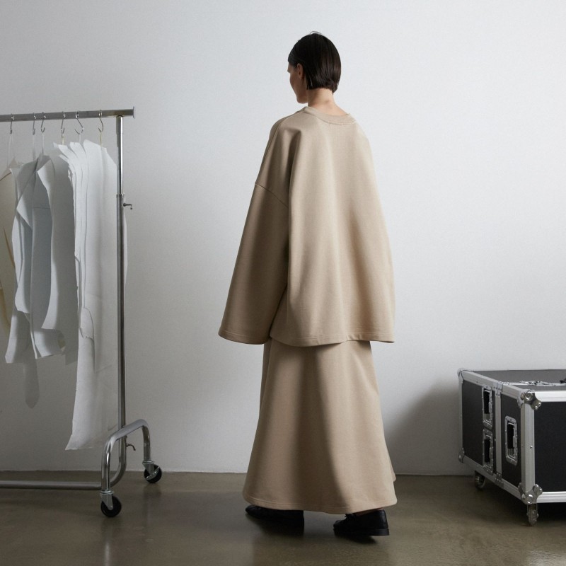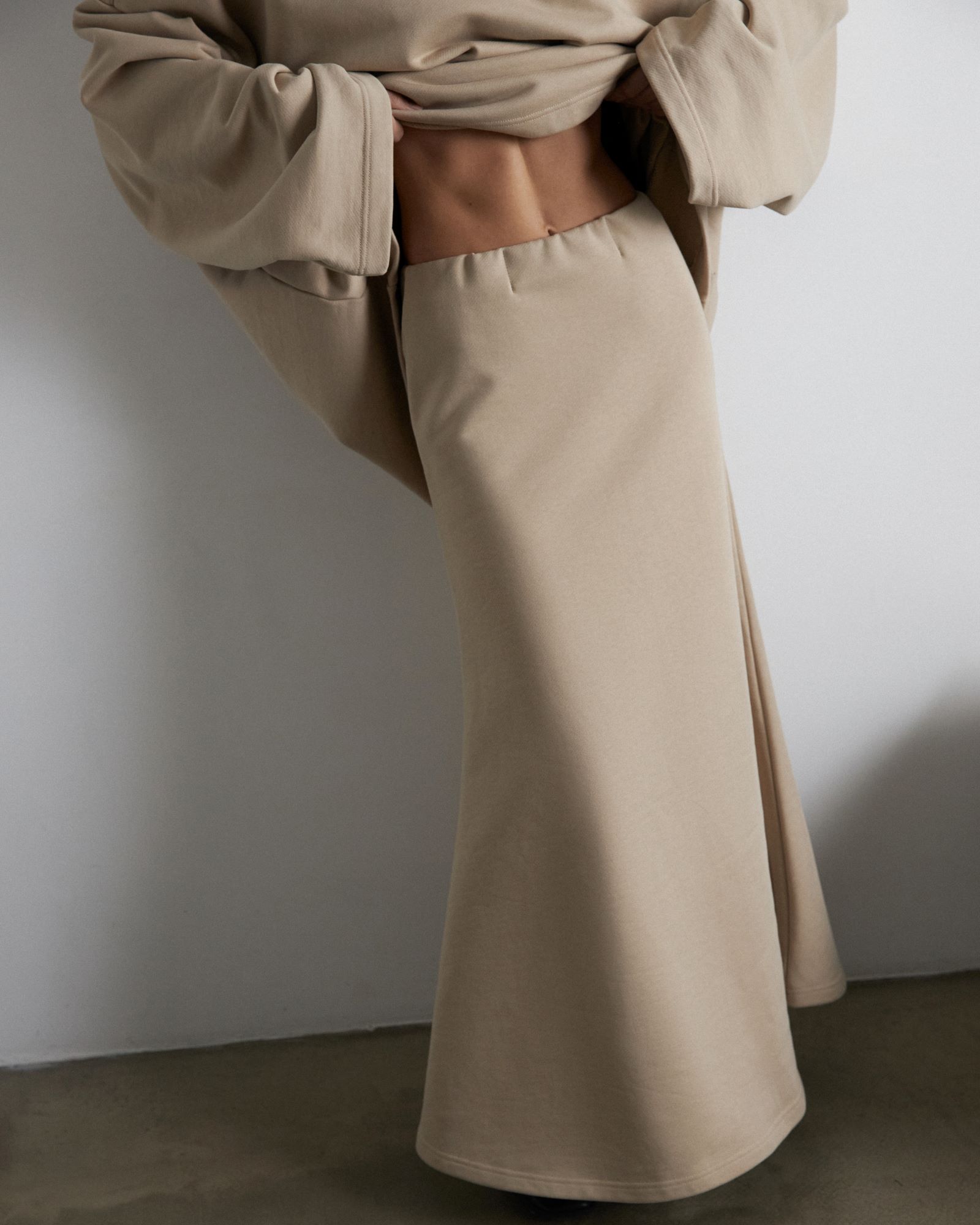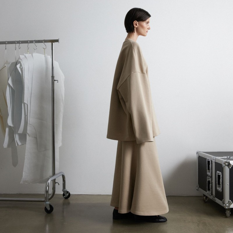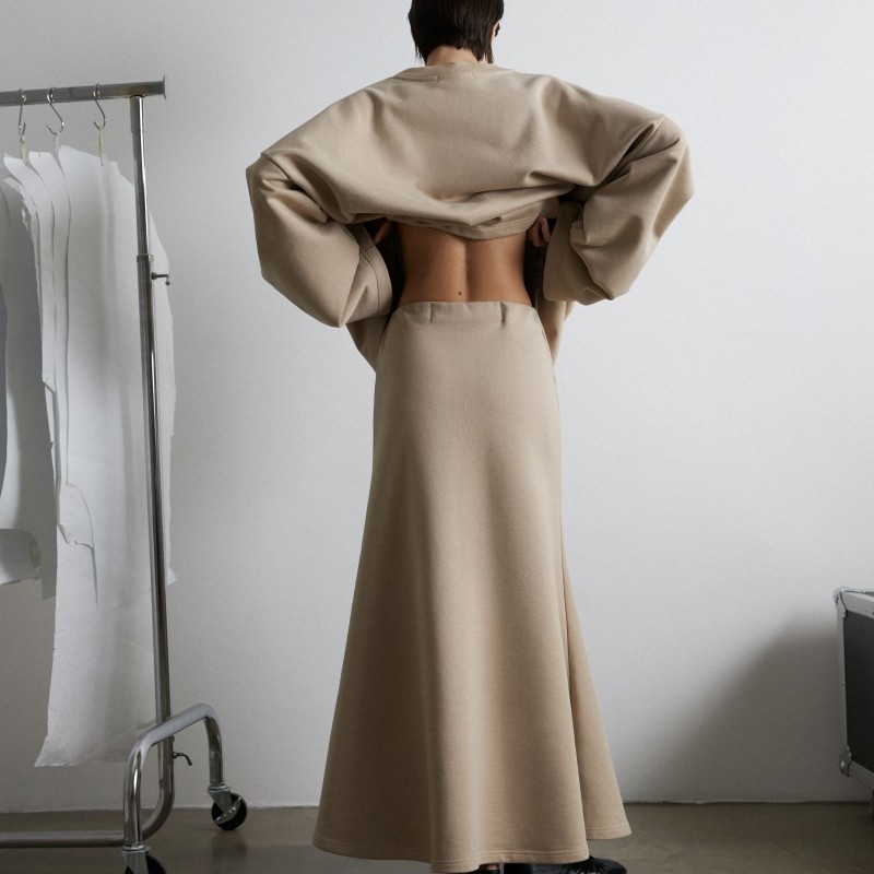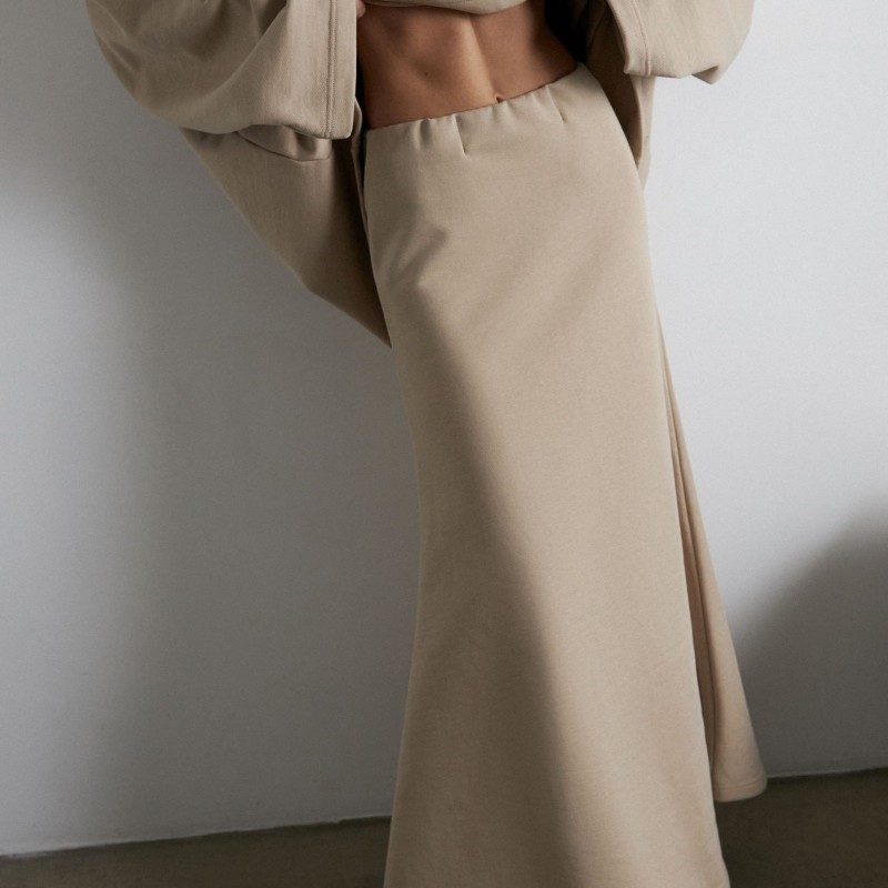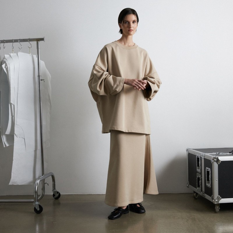 Костюм из футера, состоящий из свитшота и юбки - годе - это обновлённая версия костюма "Травки", который стал бестселлером конца 2023 года. За свою простоту, уют и расслабленность комплект из свитшота и расклешенной юбки длины макси в универсальном бежевом оттенке попал в категорию BASIC LINE.