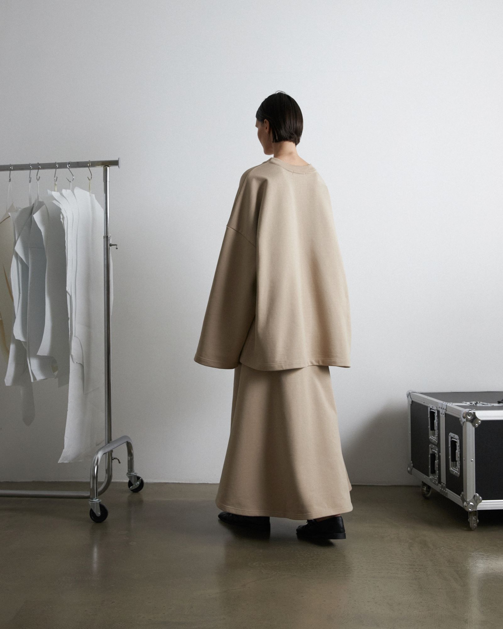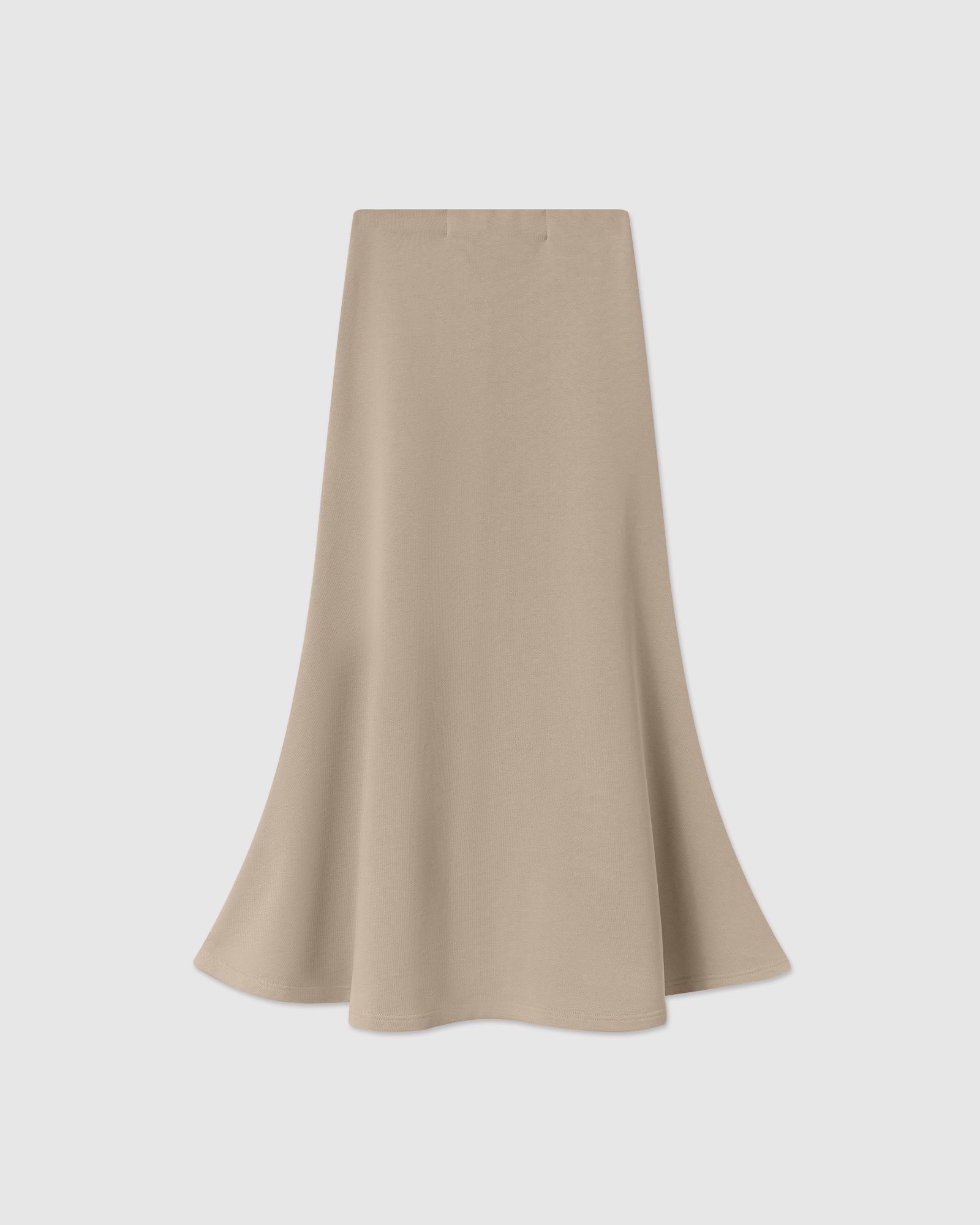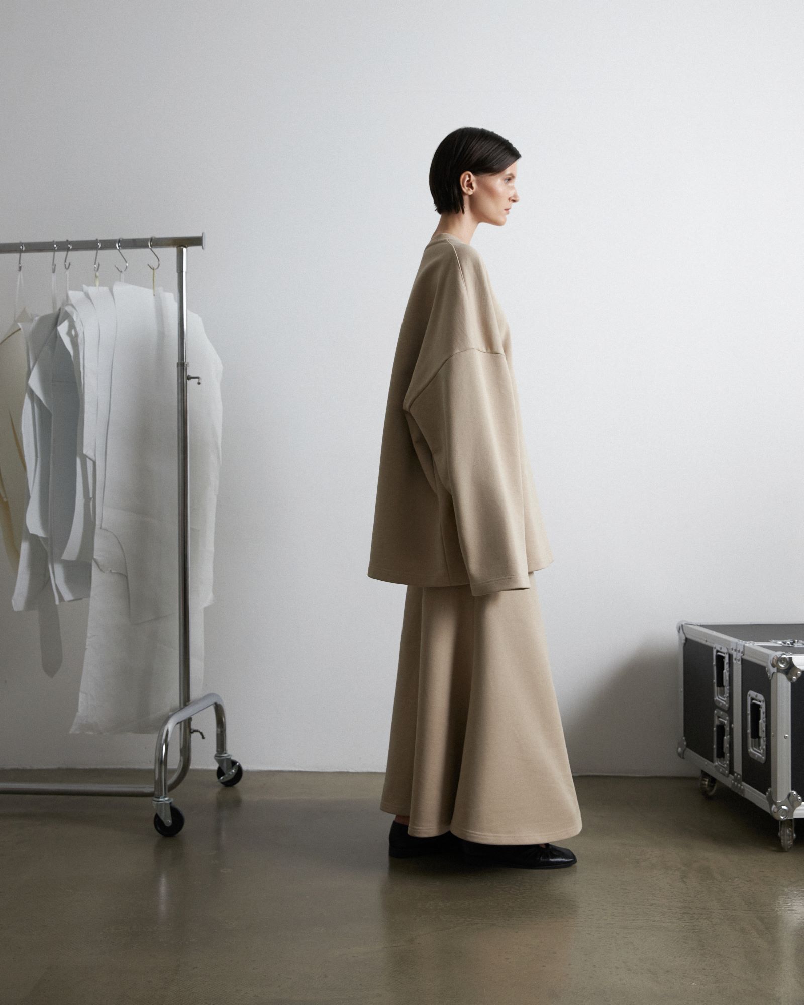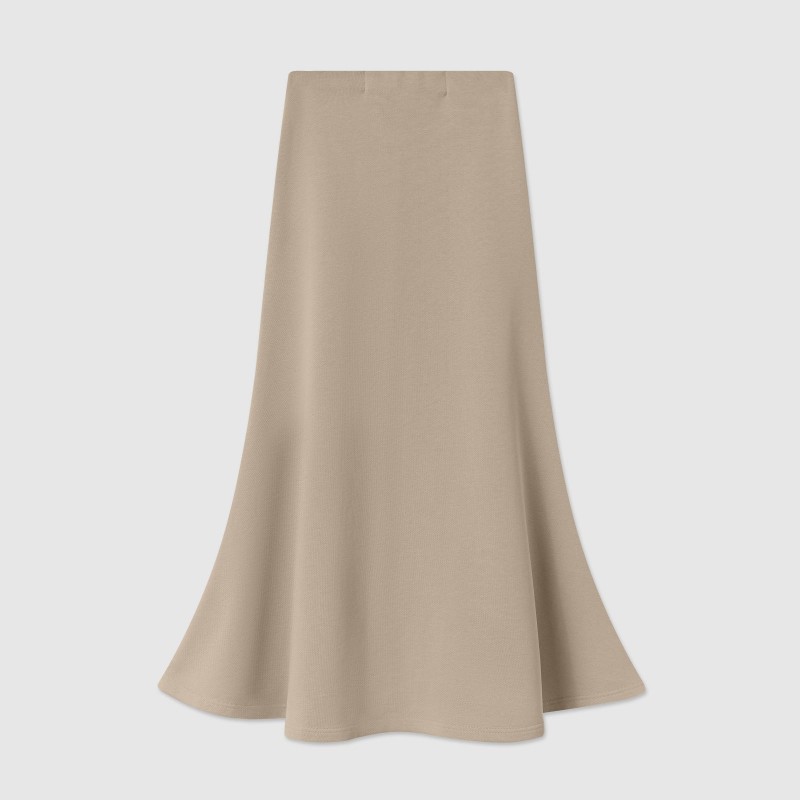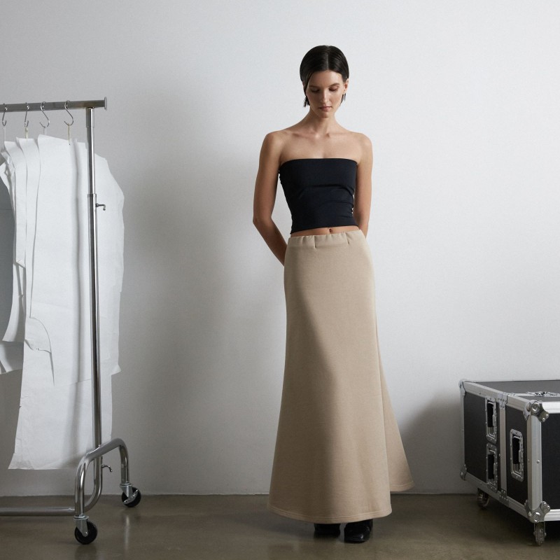 Костюм из футера, состоящий из свитшота и юбки - годе - это обновлённая версия костюма "Травки", который стал бестселлером конца 2023 года. За свою простоту, уют и расслабленность комплект из свитшота и расклешенной юбки длины макси в универсальном бежевом оттенке попал в категорию BASIC LINE.