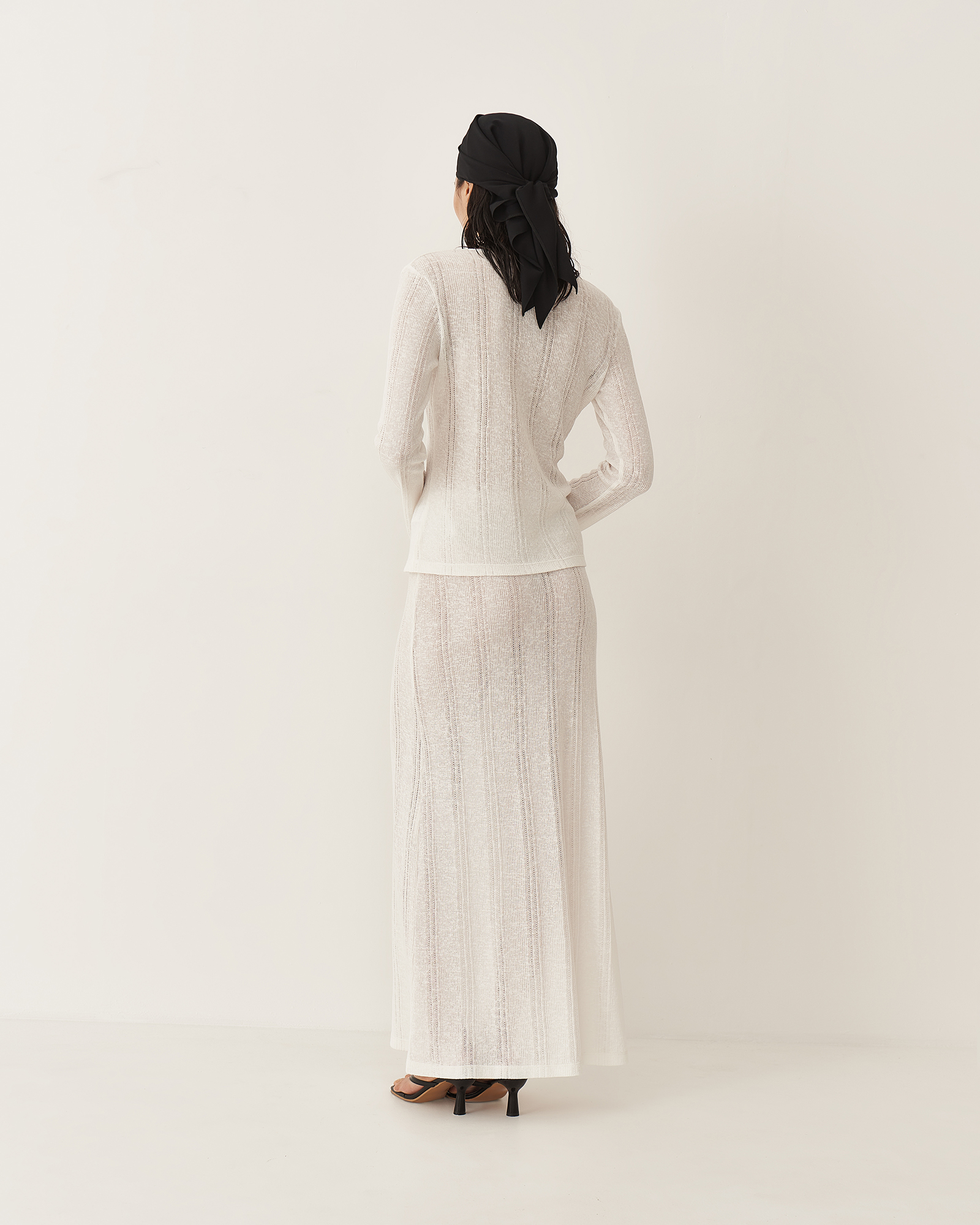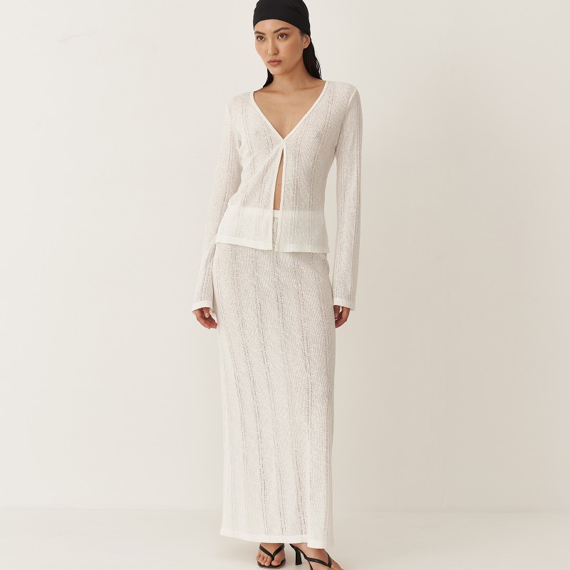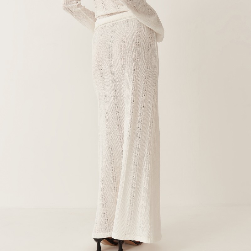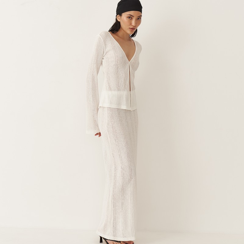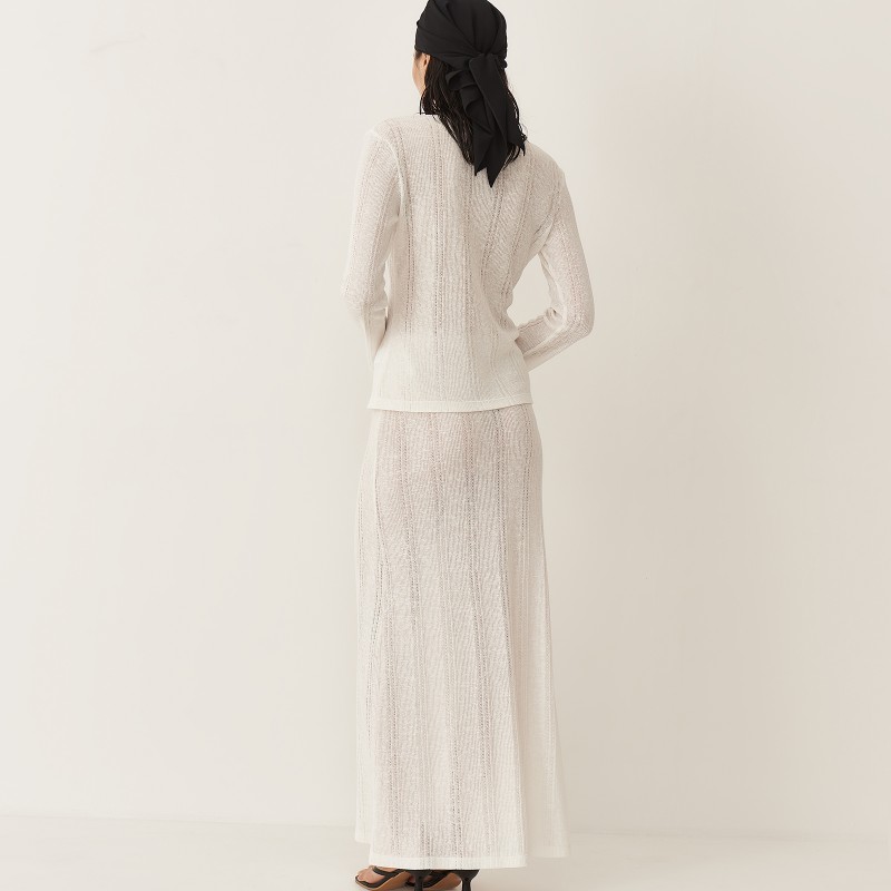 Юбка длины макси имеет прямой крой и пояс на резинке. В текстуре вязаного полотна юбки угадываются вертикальные полосы, что визуально вытягивает силуэт. Юбка и лонгслив зиз тонкого трикотажа "кроше" были вдохновлены образом русалки.  Так невесомое полупрозрачное полотно обтекает женственные изгибы, словно вода струится по телу.