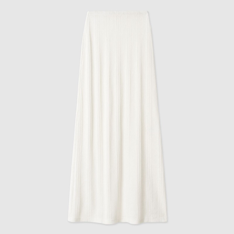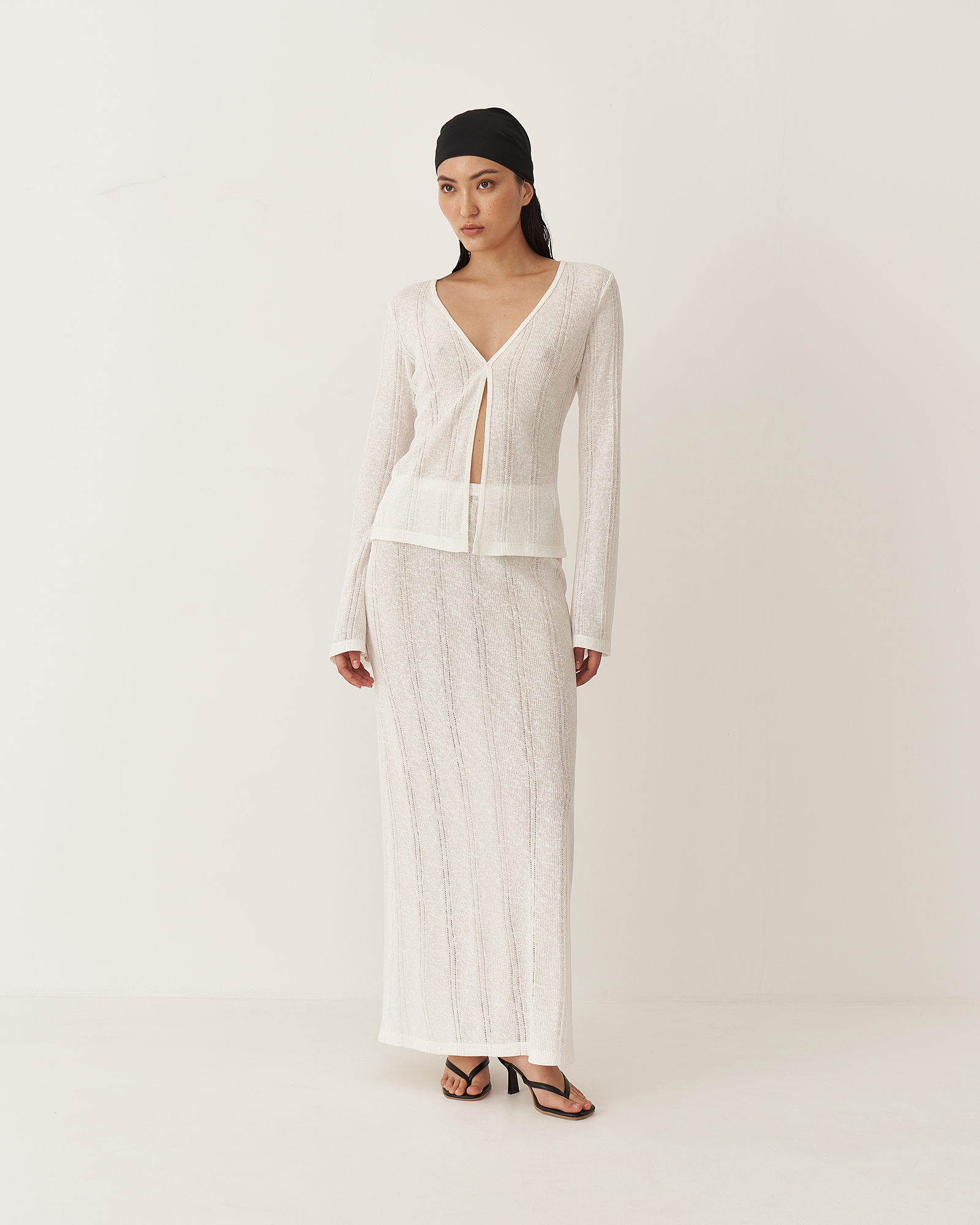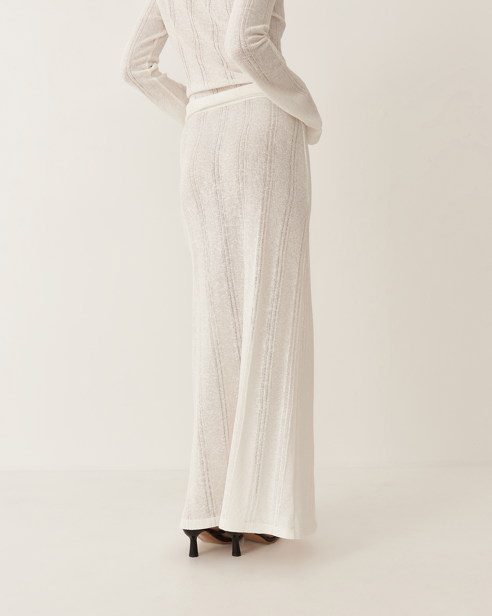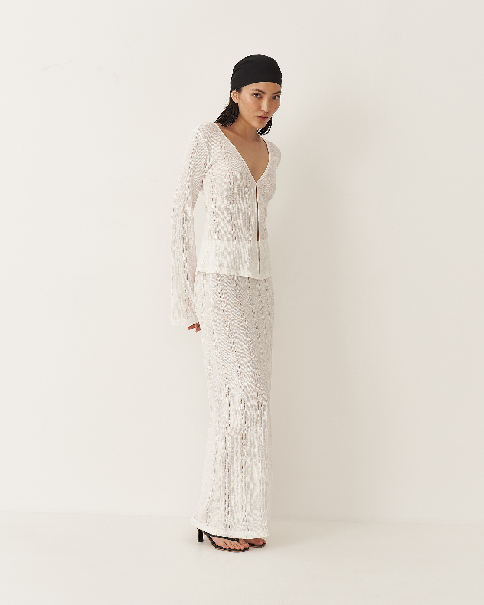 Юбка длины макси имеет прямой крой и пояс на резинке. В текстуре вязаного полотна юбки угадываются вертикальные полосы, что визуально вытягивает силуэт. Юбка и лонгслив зиз тонкого трикотажа "кроше" были вдохновлены образом русалки.  Так невесомое полупрозрачное полотно обтекает женственные изгибы, словно вода струится по телу.