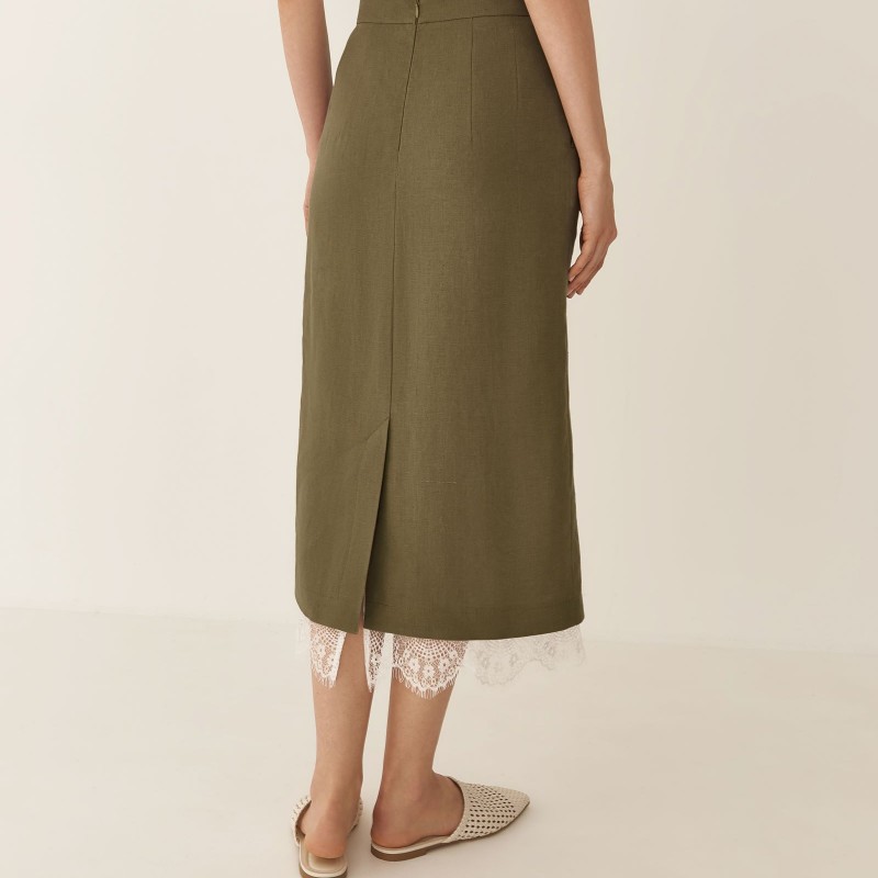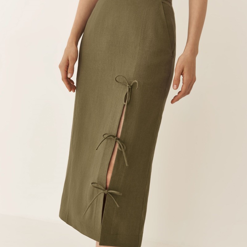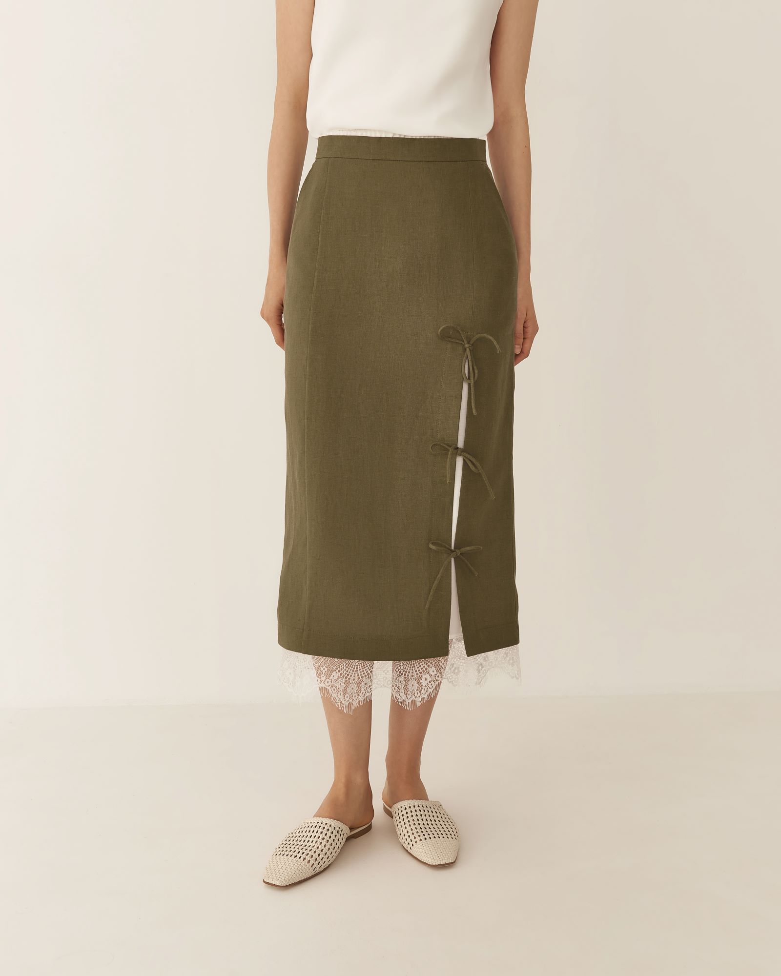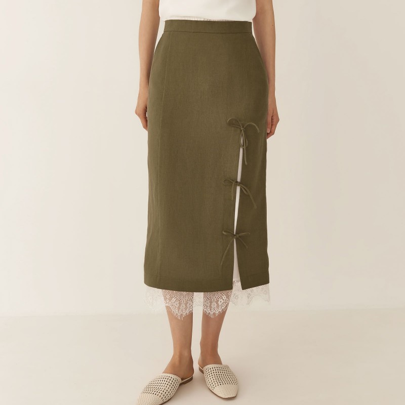 Яркой деталью юбки – карандаш изо льна длины миди стал высокий разрез с завязками в виде бантов на боку передней части изделия. В дополнение к такой модели мы предлагаем использовать юбку - подъюбник из одноименной коллекции с кружевом на подоле, создав более утонченный образ. Юбка имеет посадку на талии и застежку на молнии.