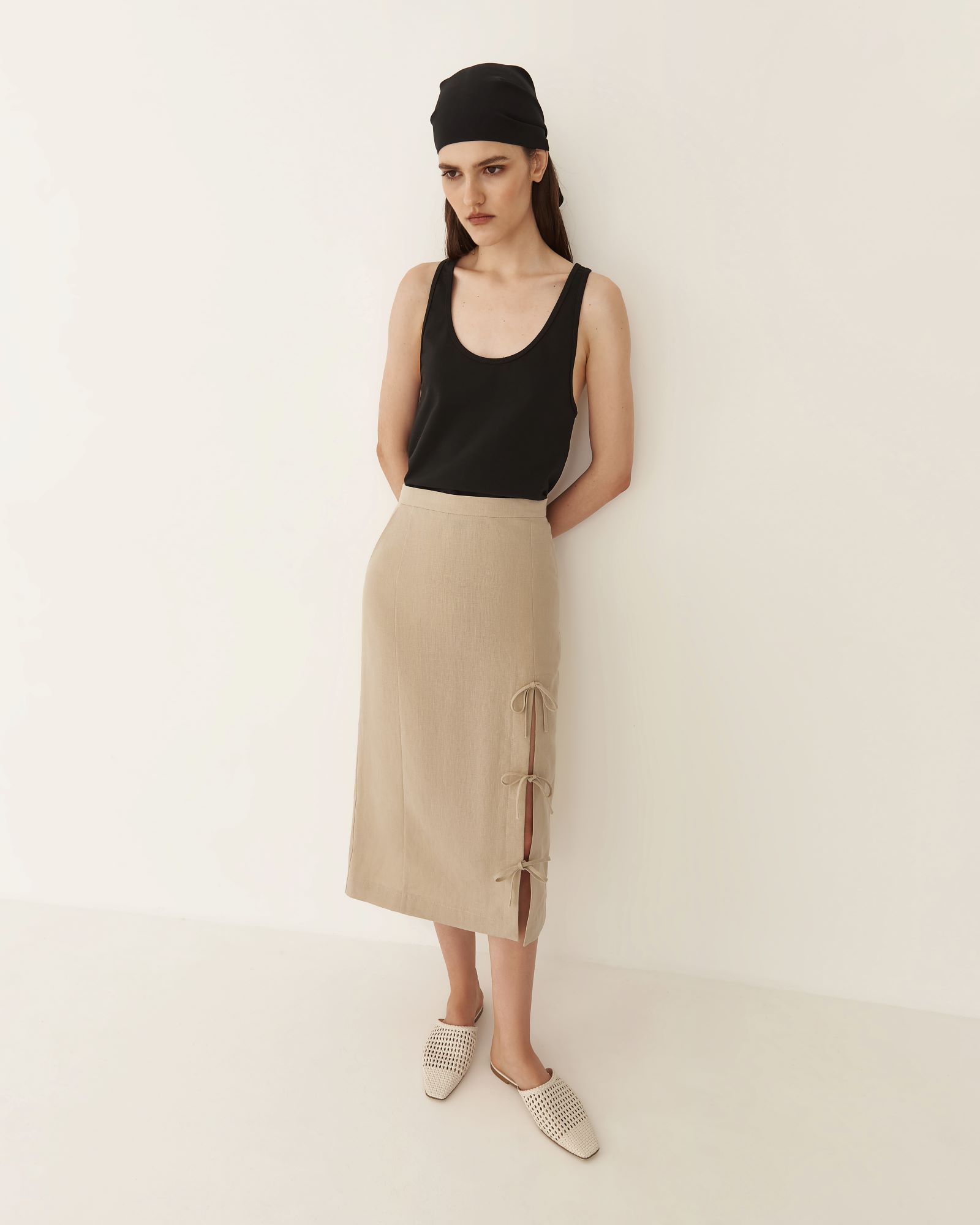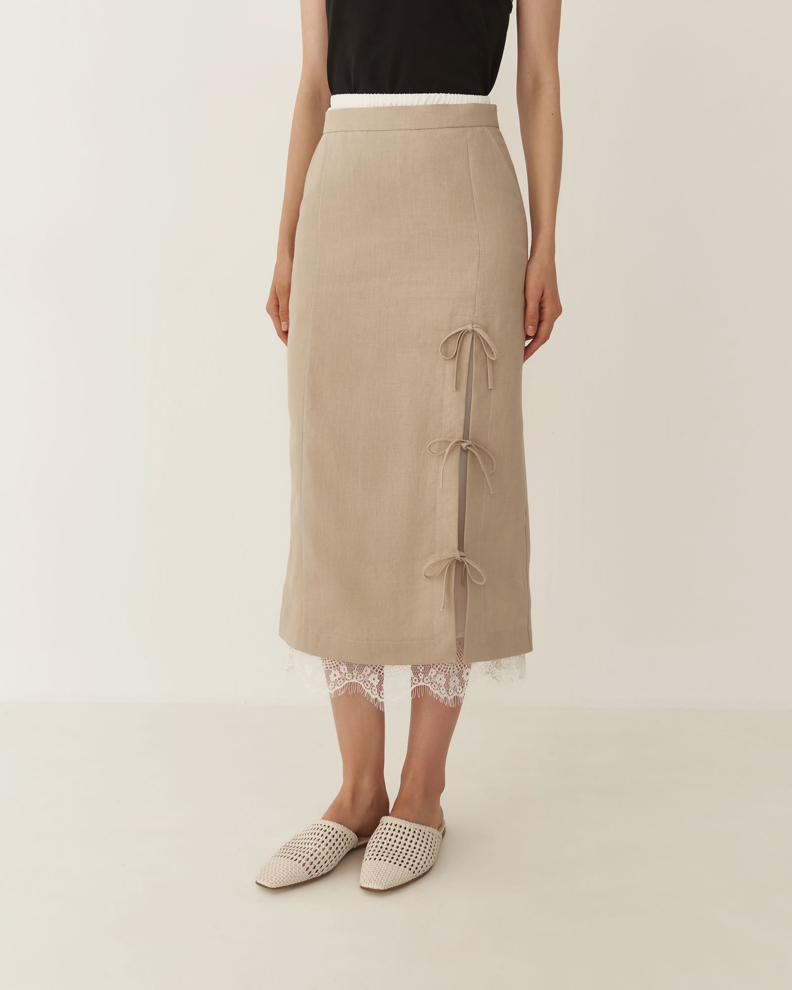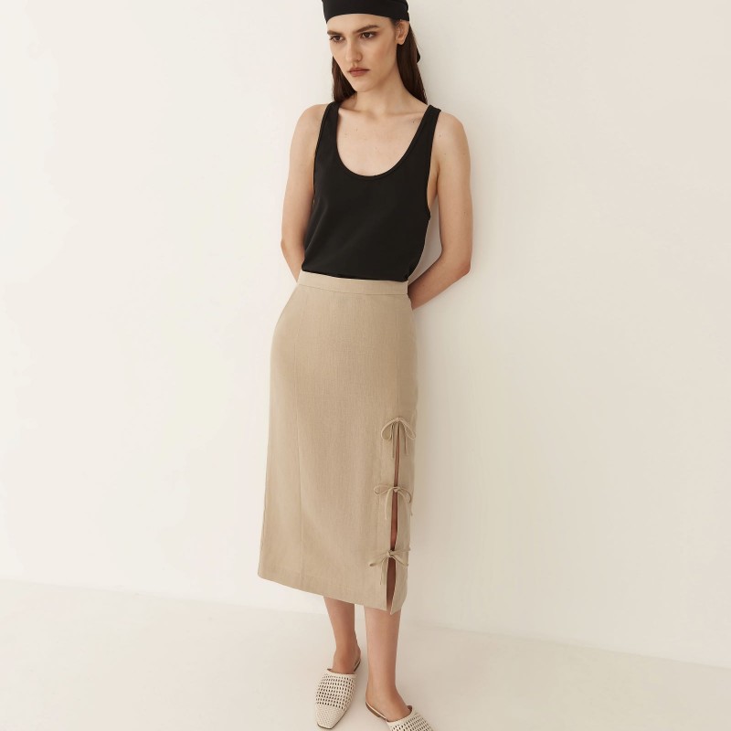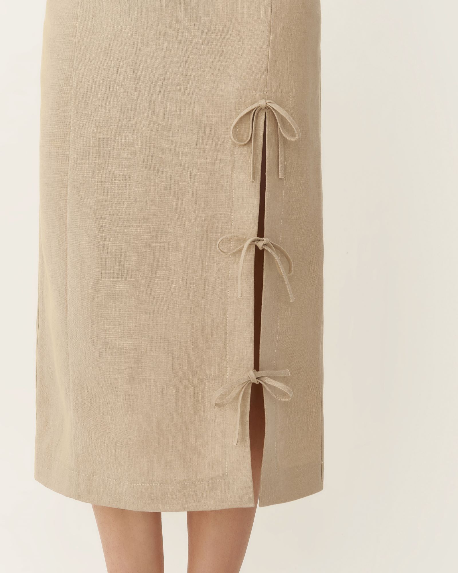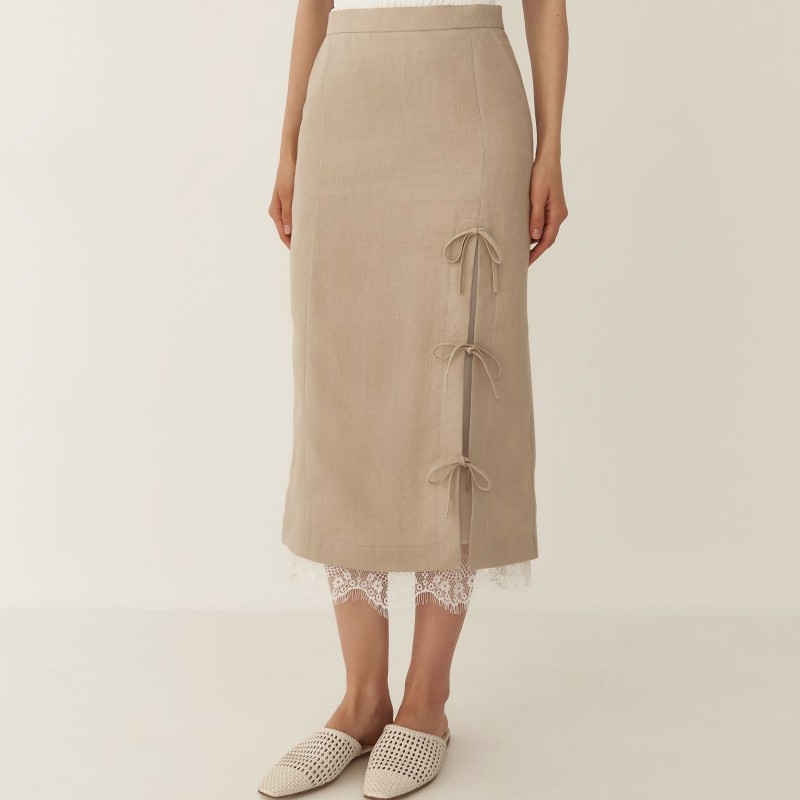 Яркой деталью юбки – карандаш изо льна длины миди стал высокий разрез с завязками в виде бантов на боку передней части изделия. В дополнение к такой модели мы предлагаем использовать юбку - подъюбник из одноименной коллекции с кружевом на подоле, создав более утонченный образ. Юбка имеет посадку на талии и застежку на молнии.