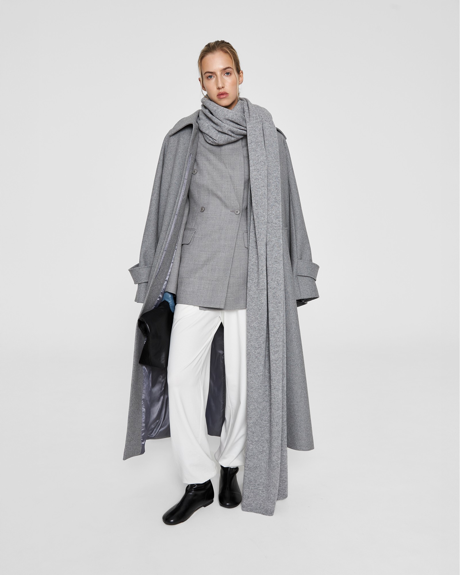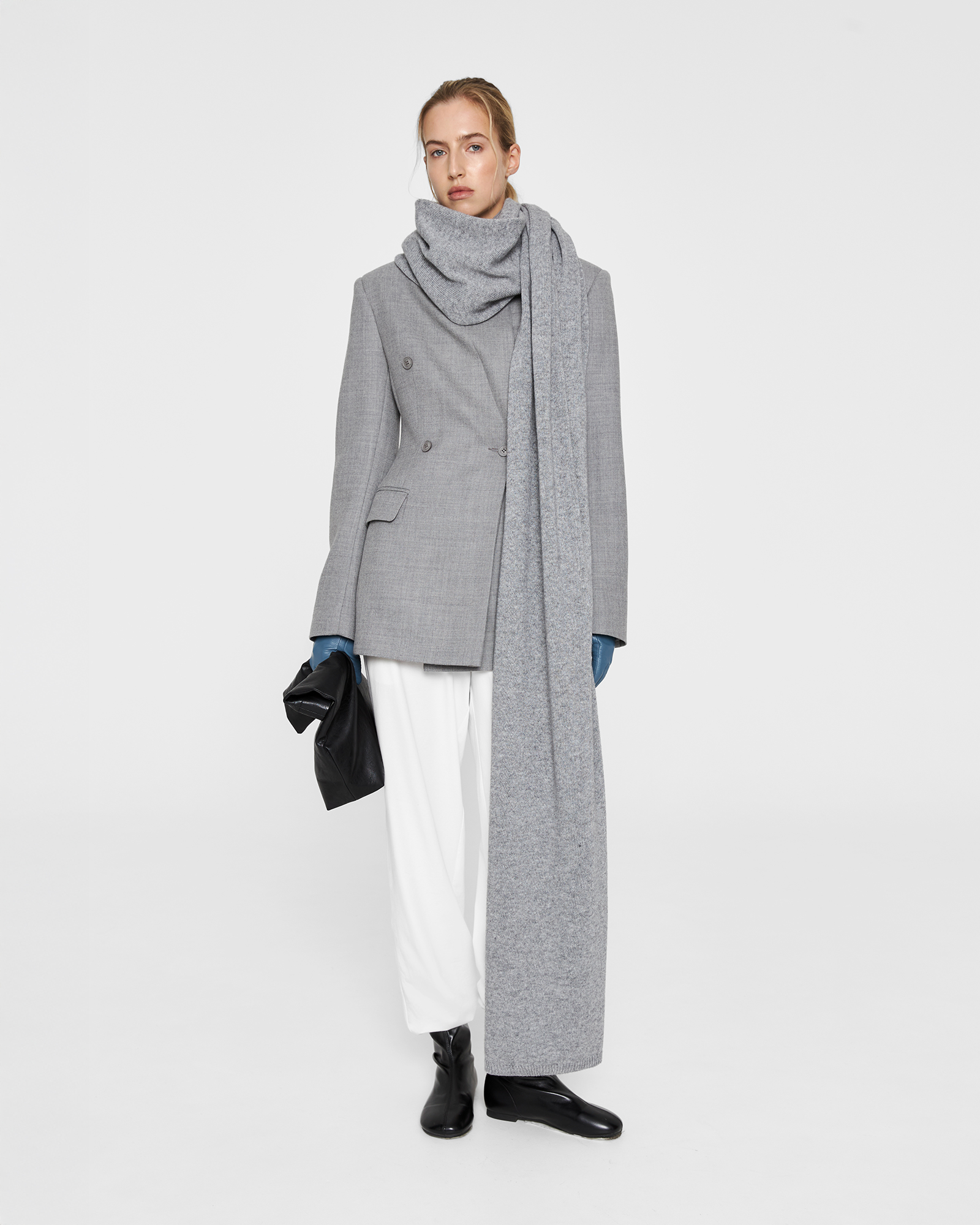 Двубортный пиджак с  заостренным английским воротником имеет два боковых кармана с клапаном и нагрудный нефункциональный карман-листочку, две шлицы по рельефам спинки и шлицу с рядом пуговиц на рукаве.